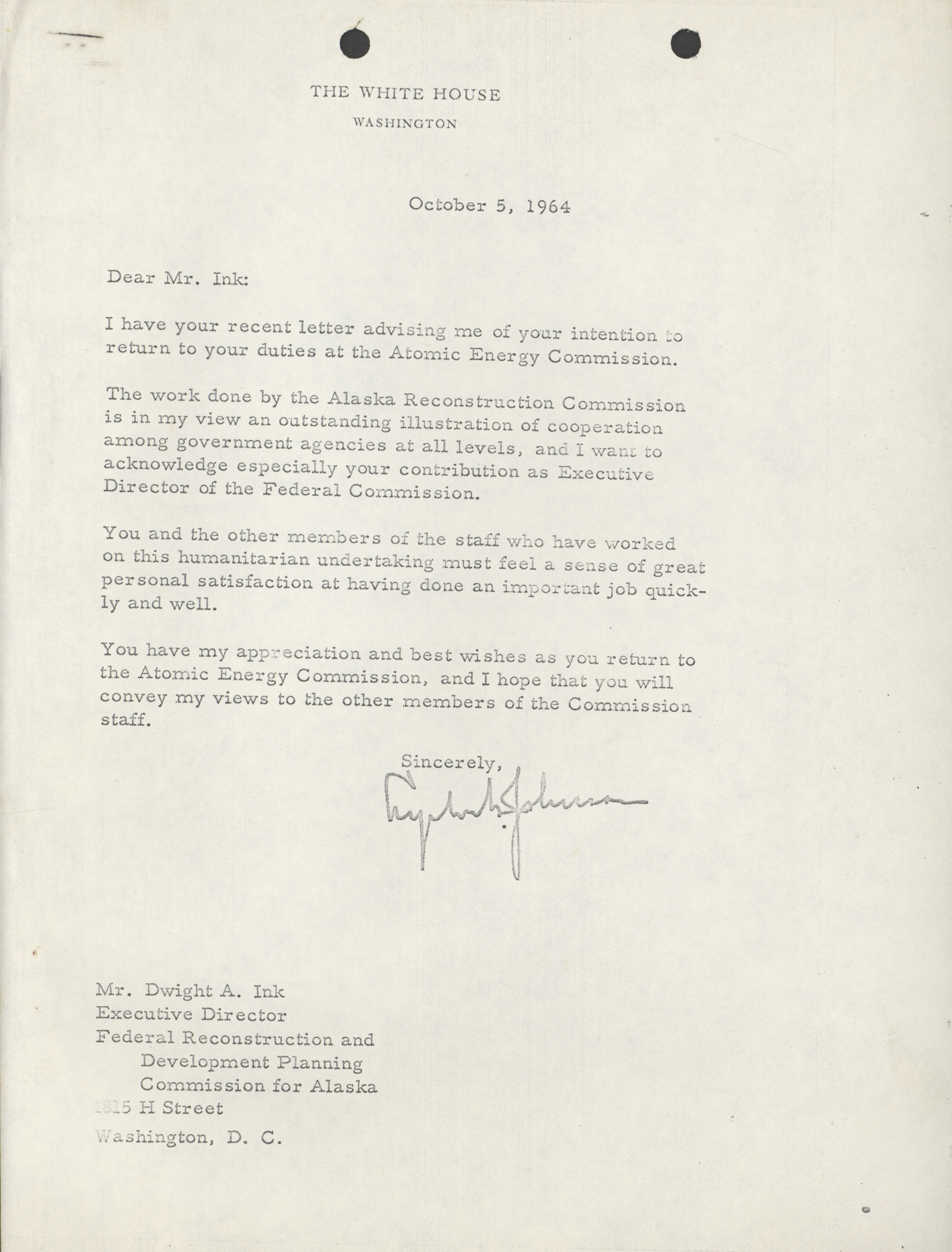 - Lyndon B. Johnson letter to Dwight A. Ink, October 5, 1964