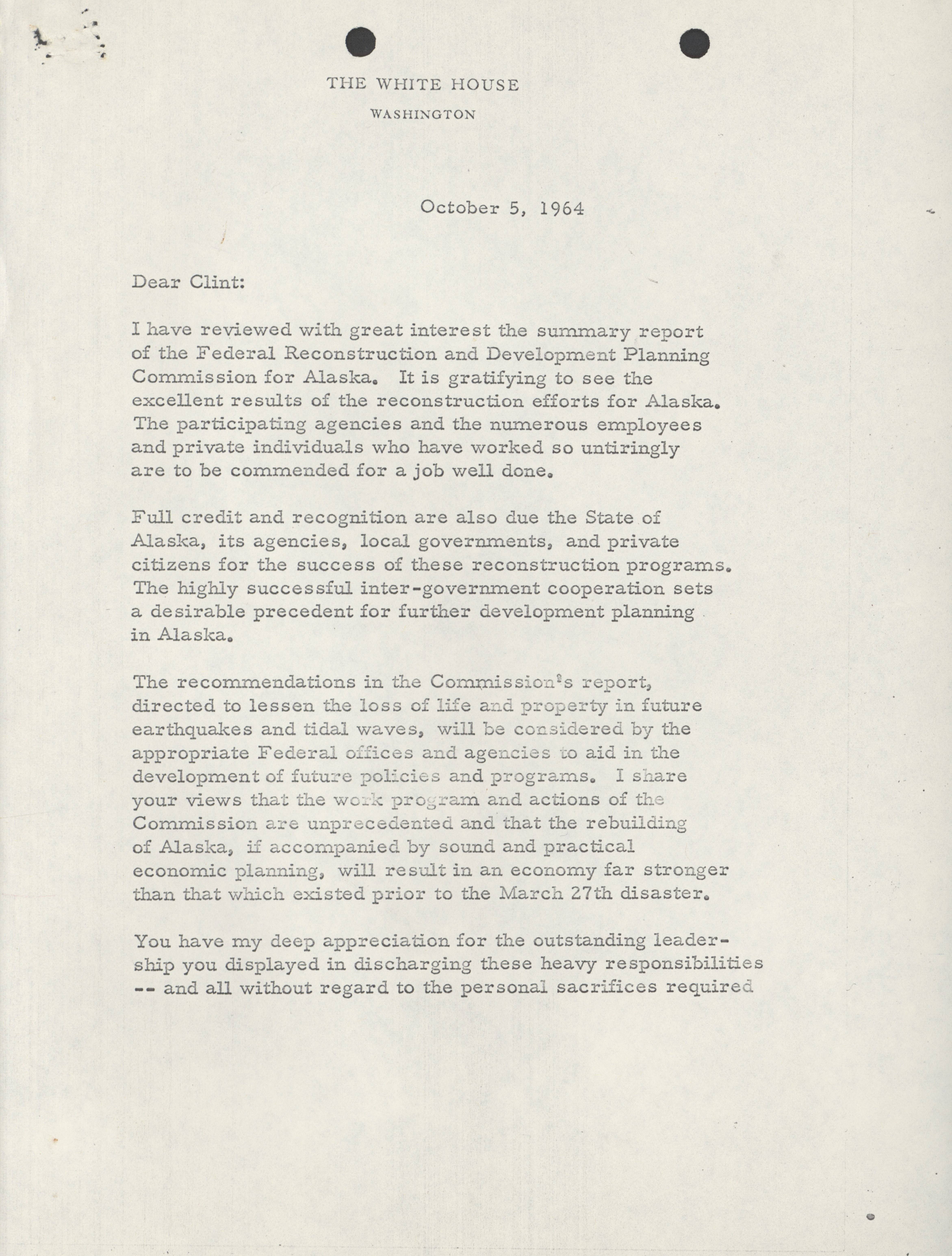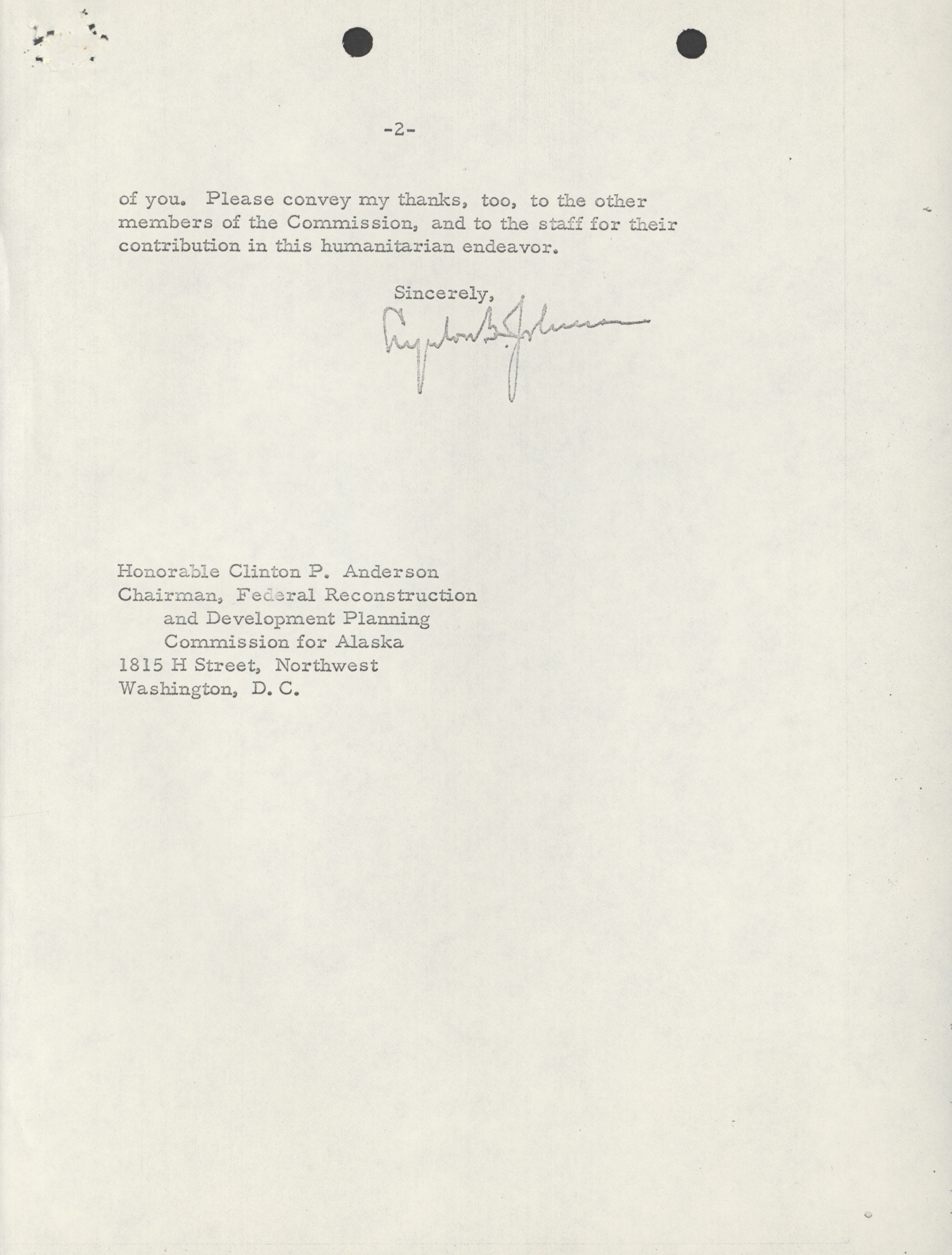 - Federal Reconstruction and Development Planning Commission. "Response to disaster," and correspondence from Lyndon B. Johnson