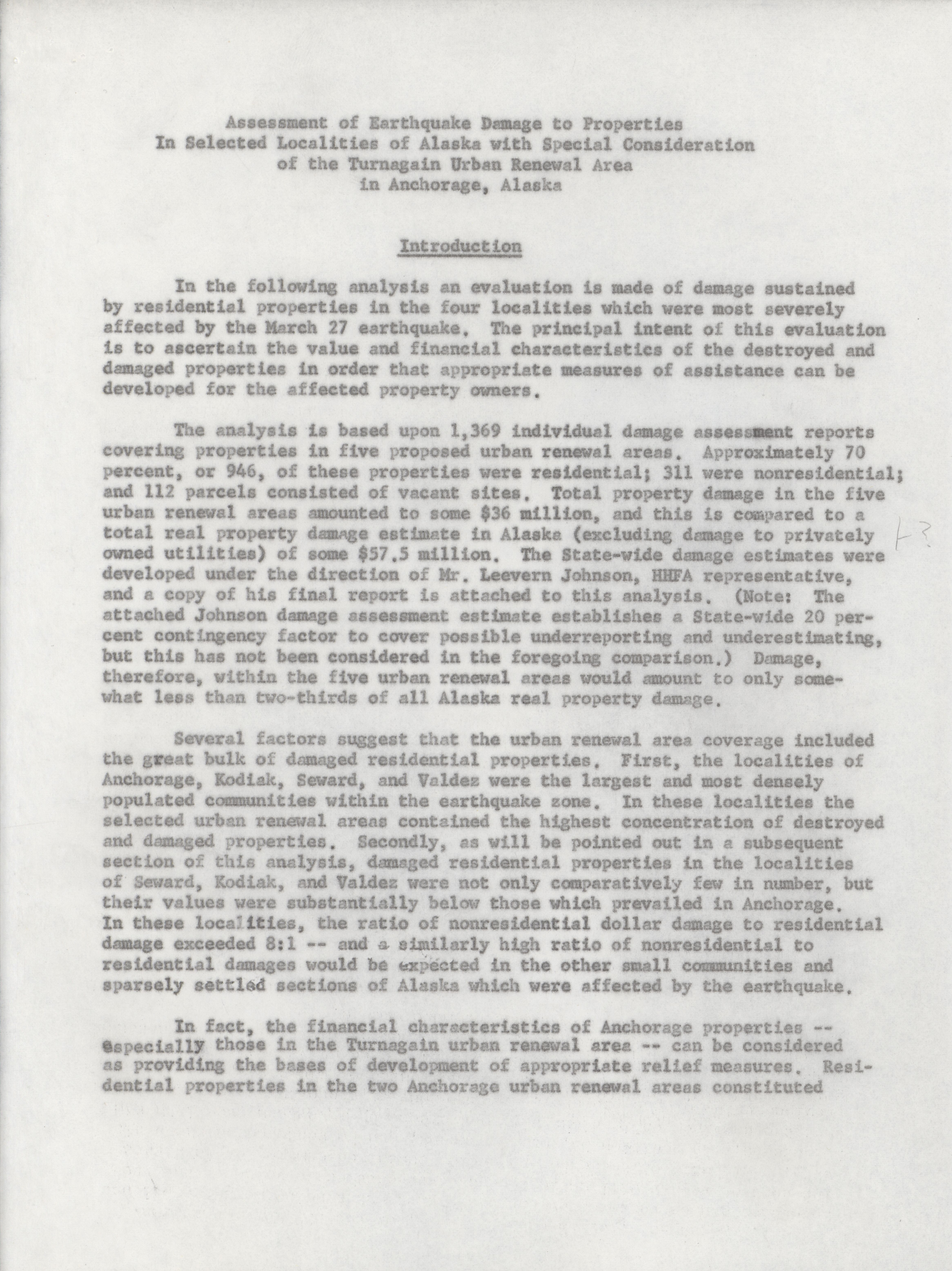 - Assessment of earthquake damage to properties in selected localities of Alaska with special consideration of the Turnagain urban renewal area in Anchorage, Alaska
