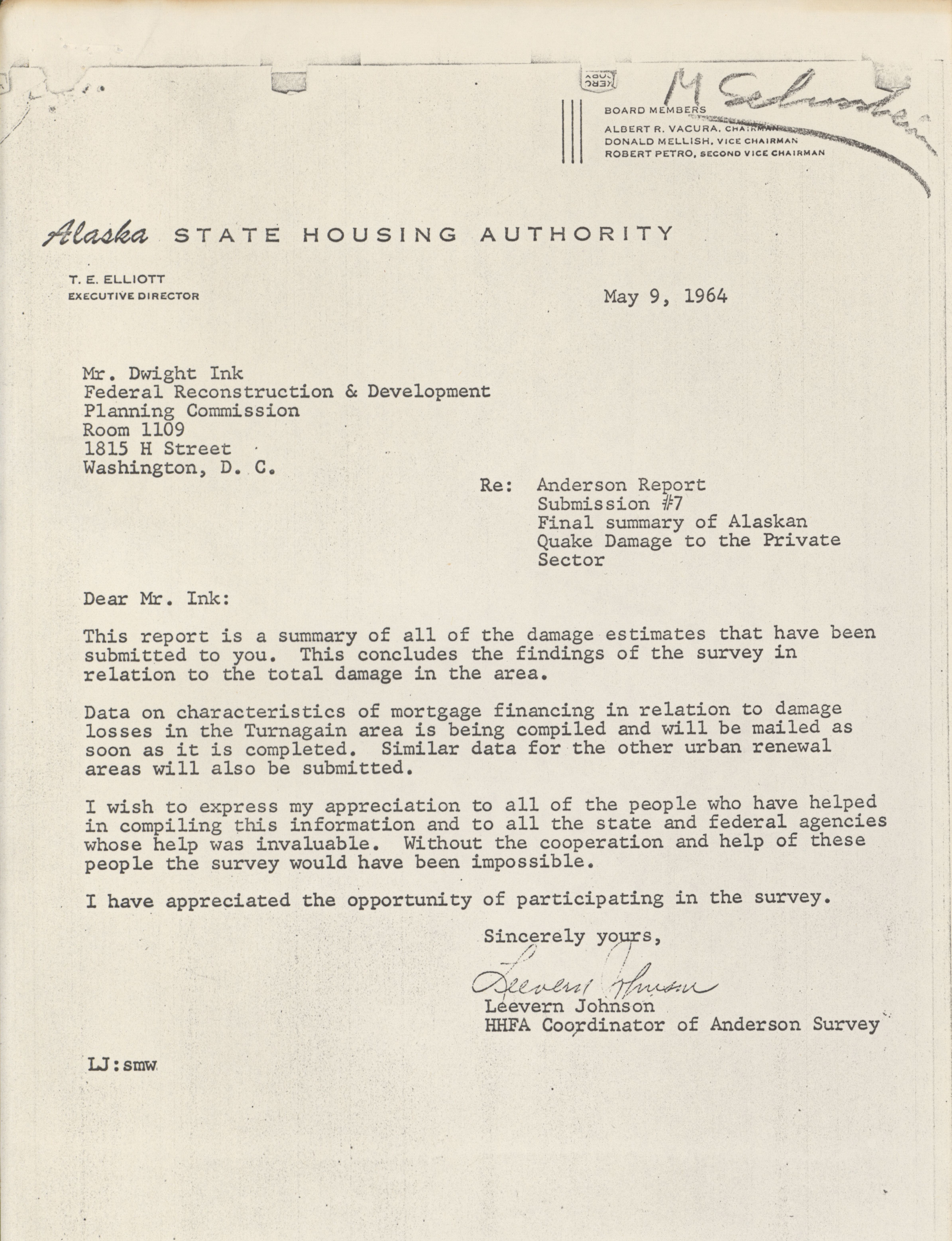 - "Assessment of earthquake damage to properties in selected localities of Alaska with special consideration of the Turnagain urban renewal area in Anchorage, Alaska", Dwight Ink Collection, Iowa State University Library Digital Collections