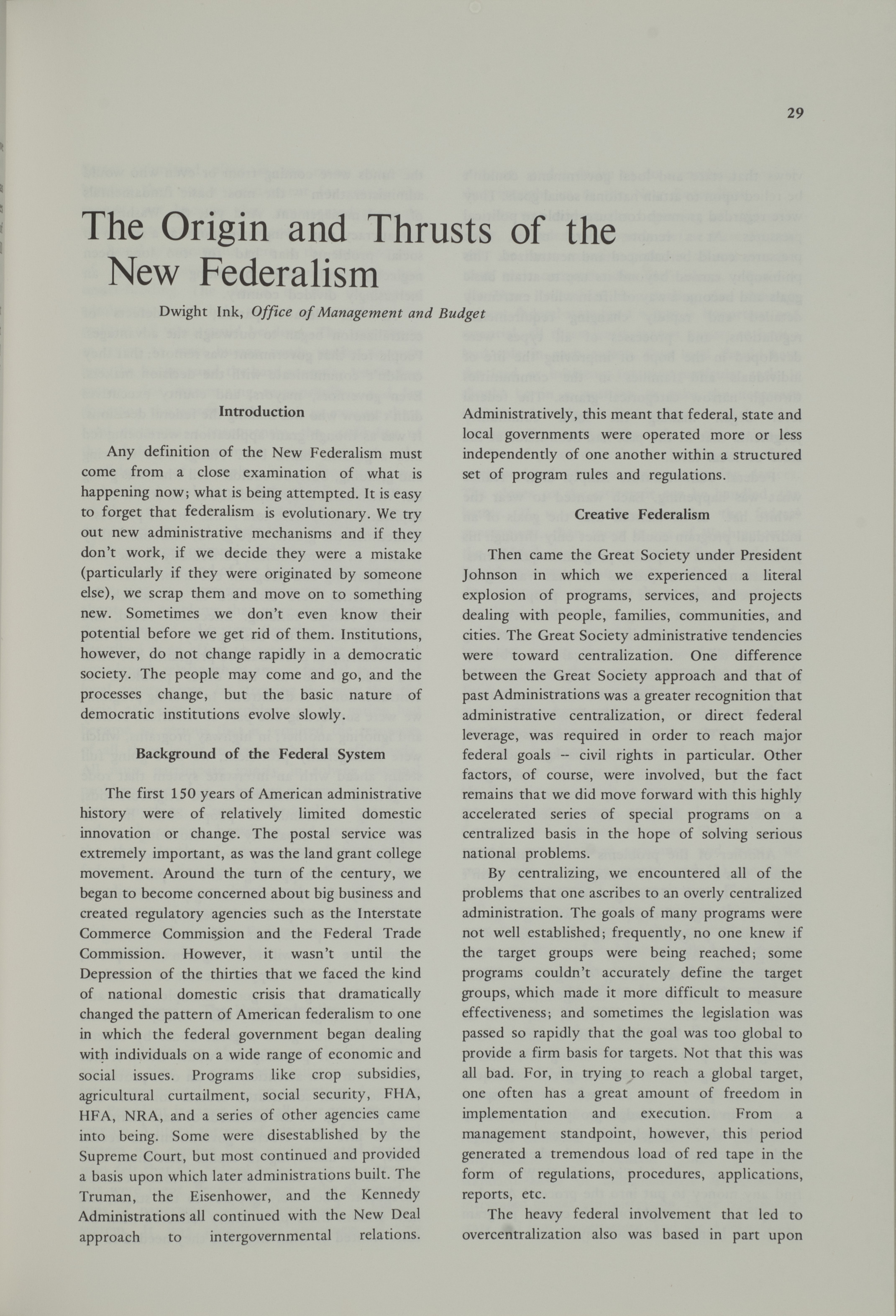 - "The origin and thrusts of the new federalism", Dwight Ink Collection, Iowa State University Library Digital Collections