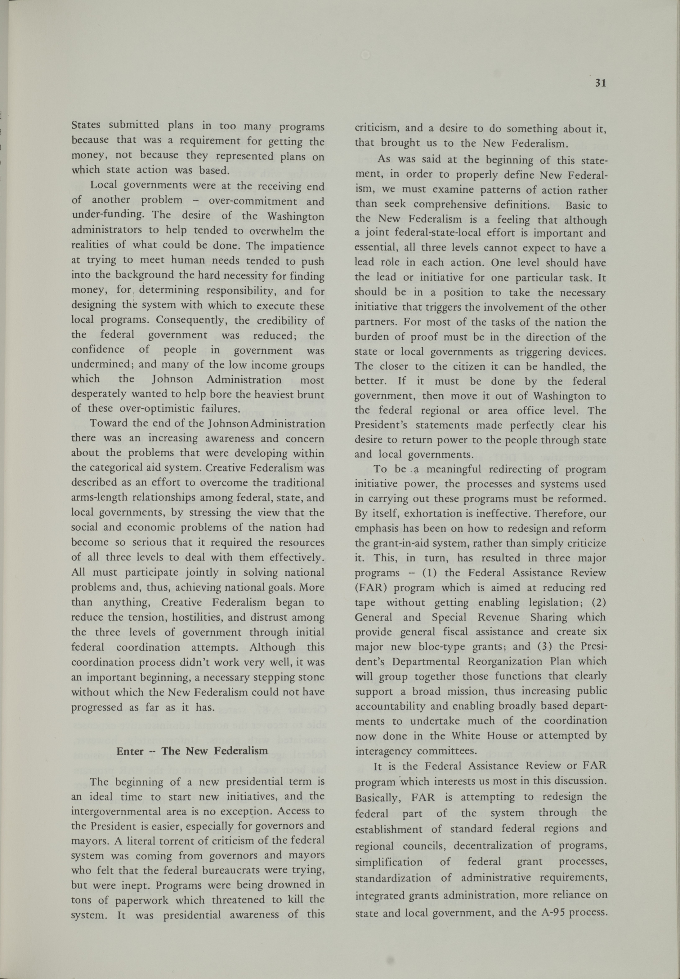 - "The origin and thrusts of the new federalism," American Society for Public Administration special publications, 1973