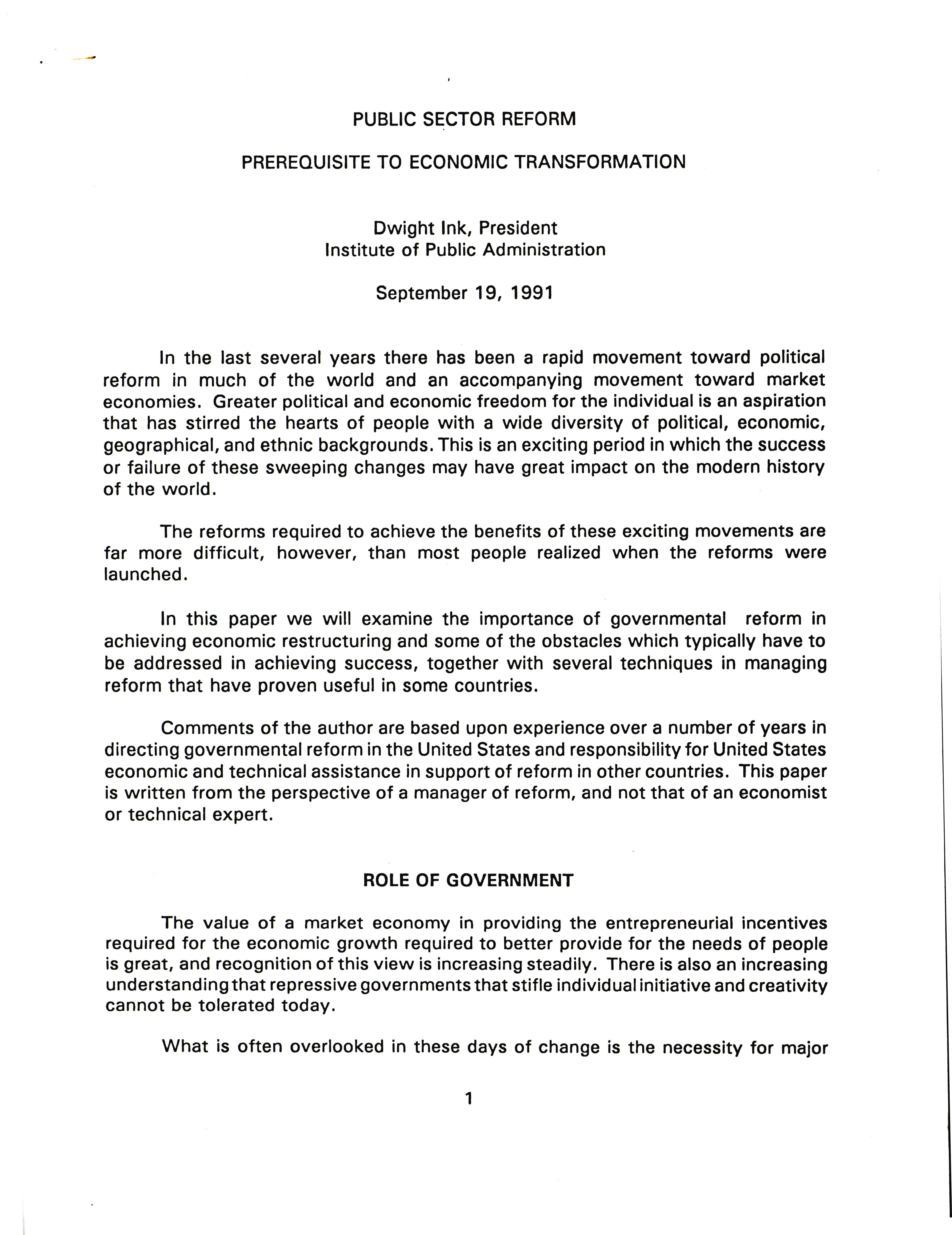 Public sector reform: prerequisite to economic transformation, September 19, 1991 Item Info