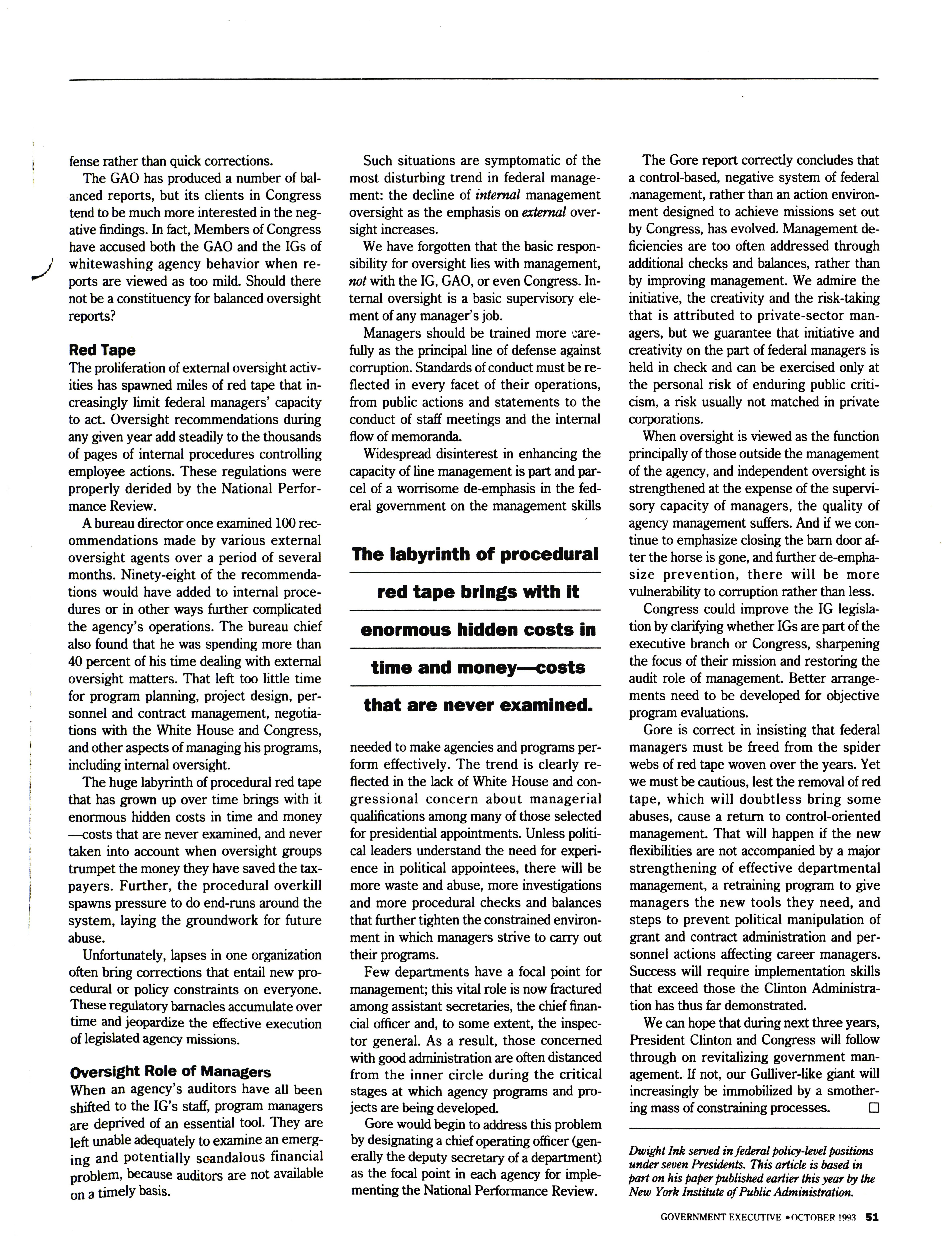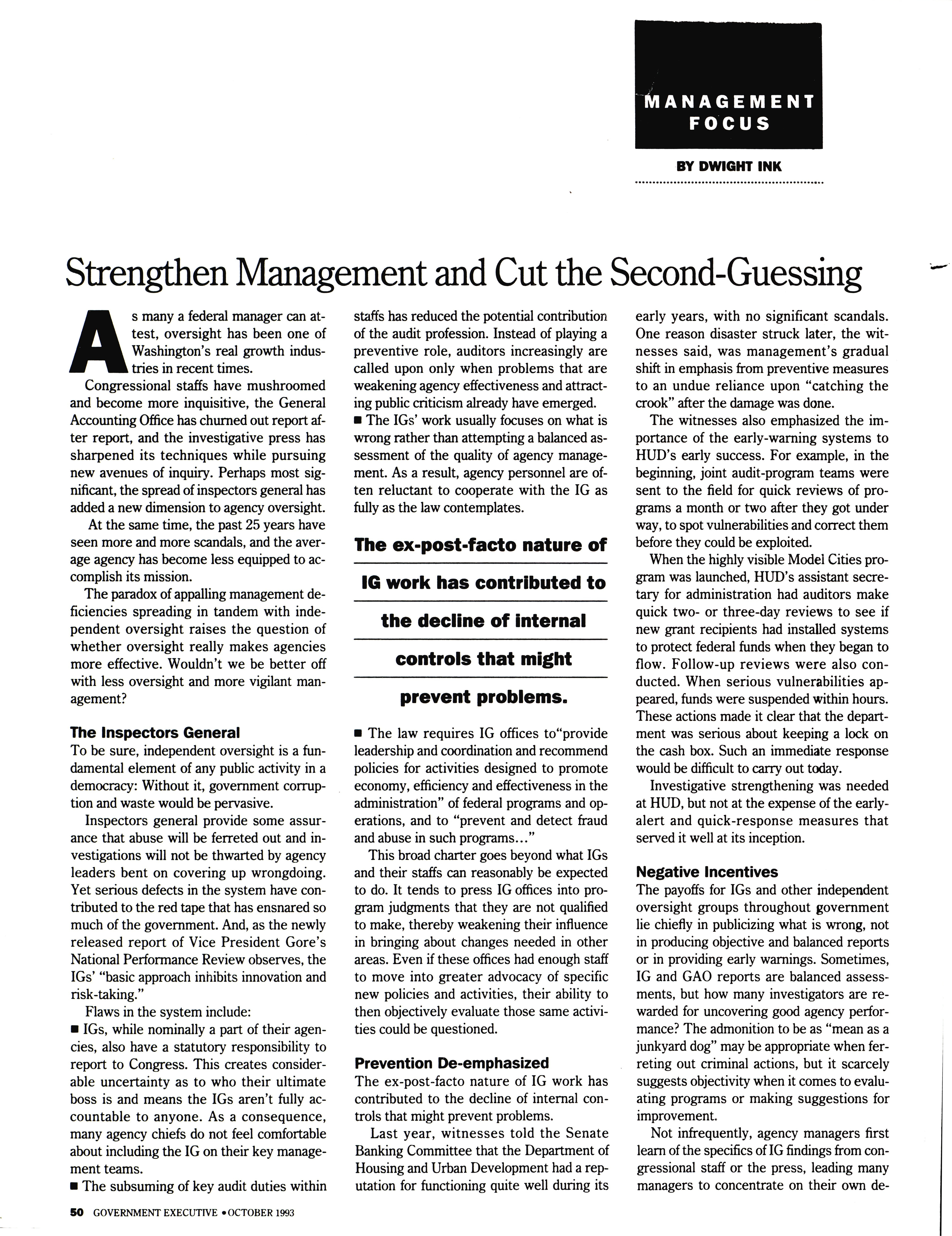 - "Strengthen management and cut the second-guessing," Government Executive, 1993