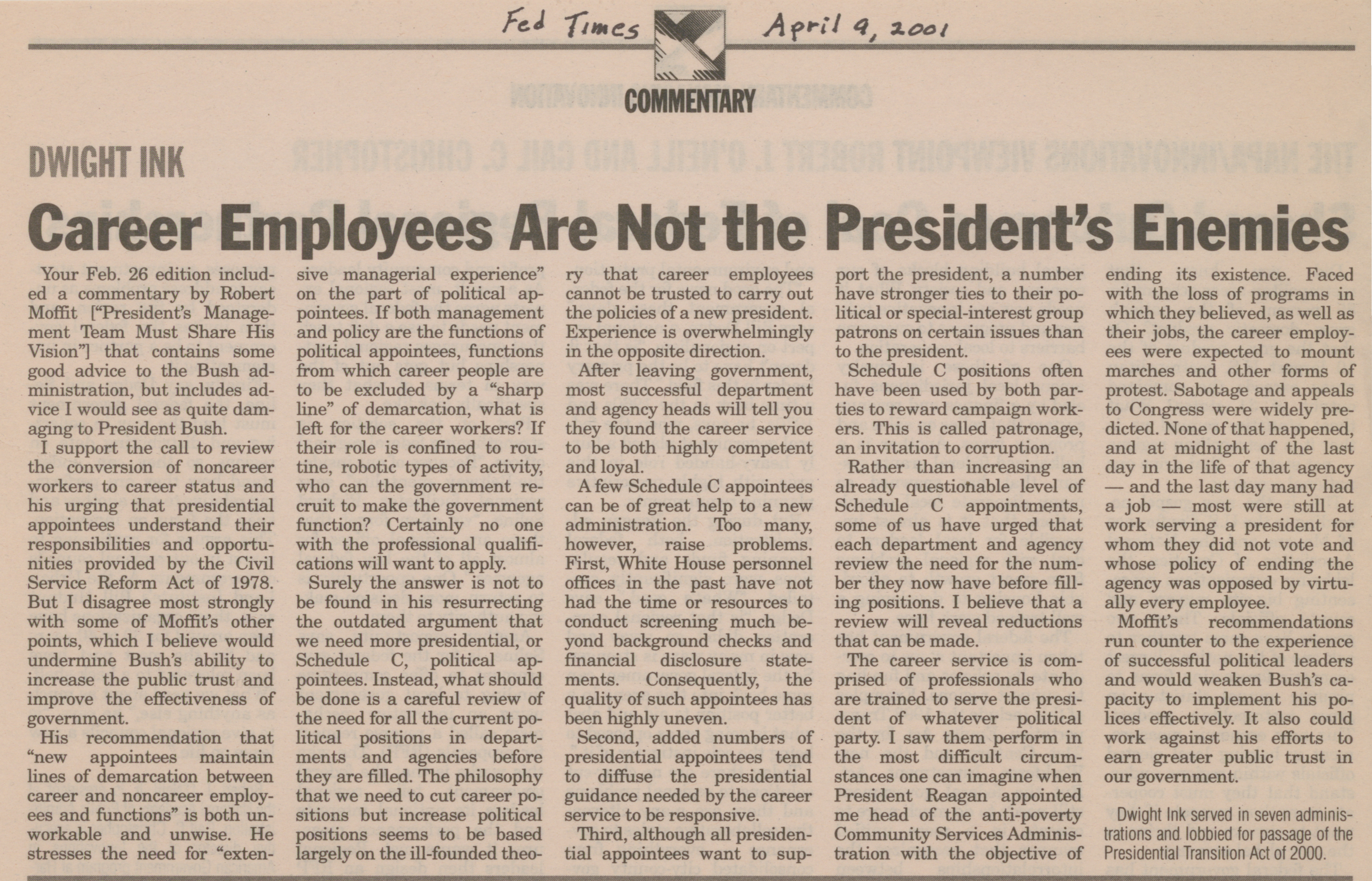 - Career employees are not the president's enemies, April 9, 2001