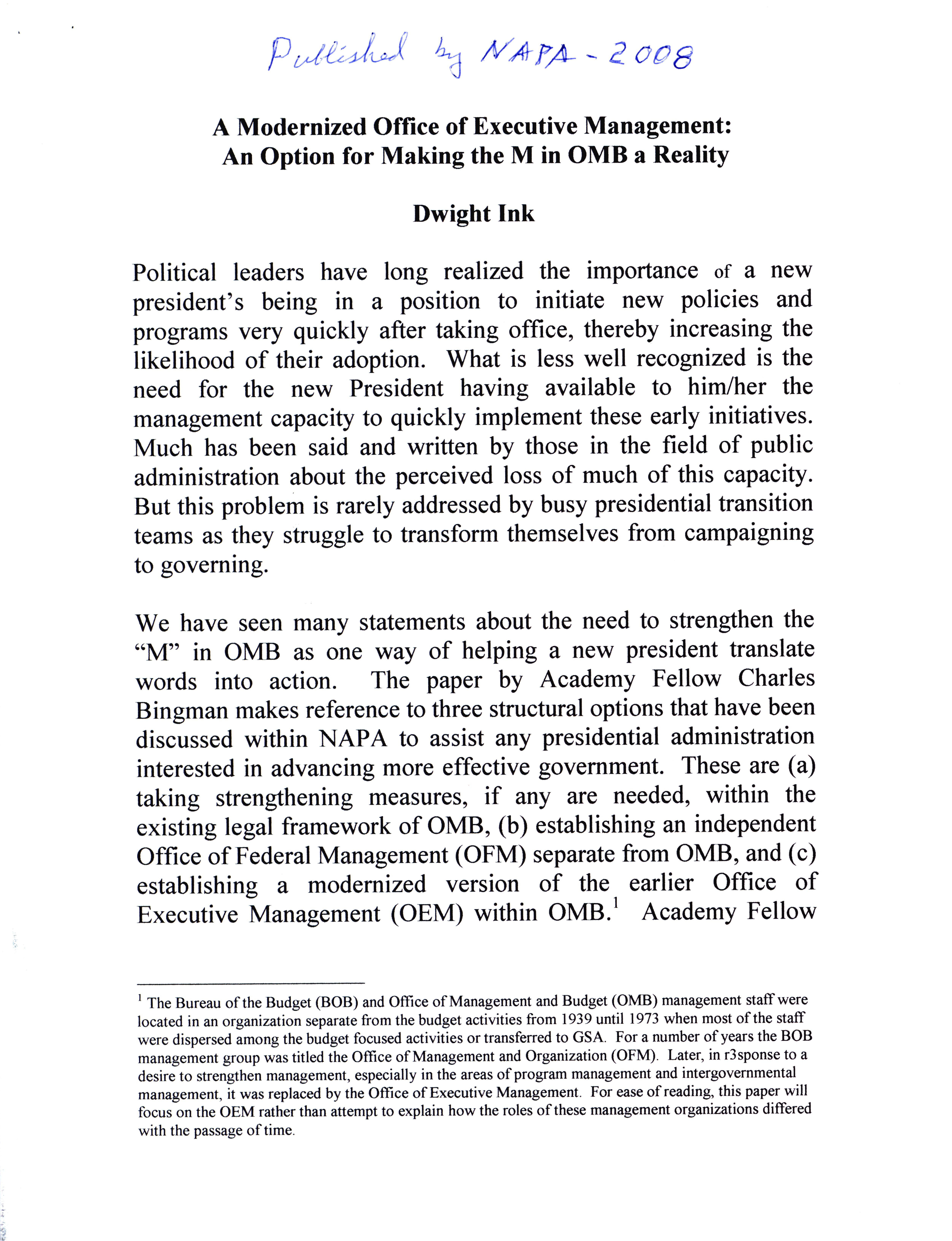 - "A modernized office of executive management: an option for making the M in OMB a reality", Dwight Ink Collection, Iowa State University Library Digital Collections