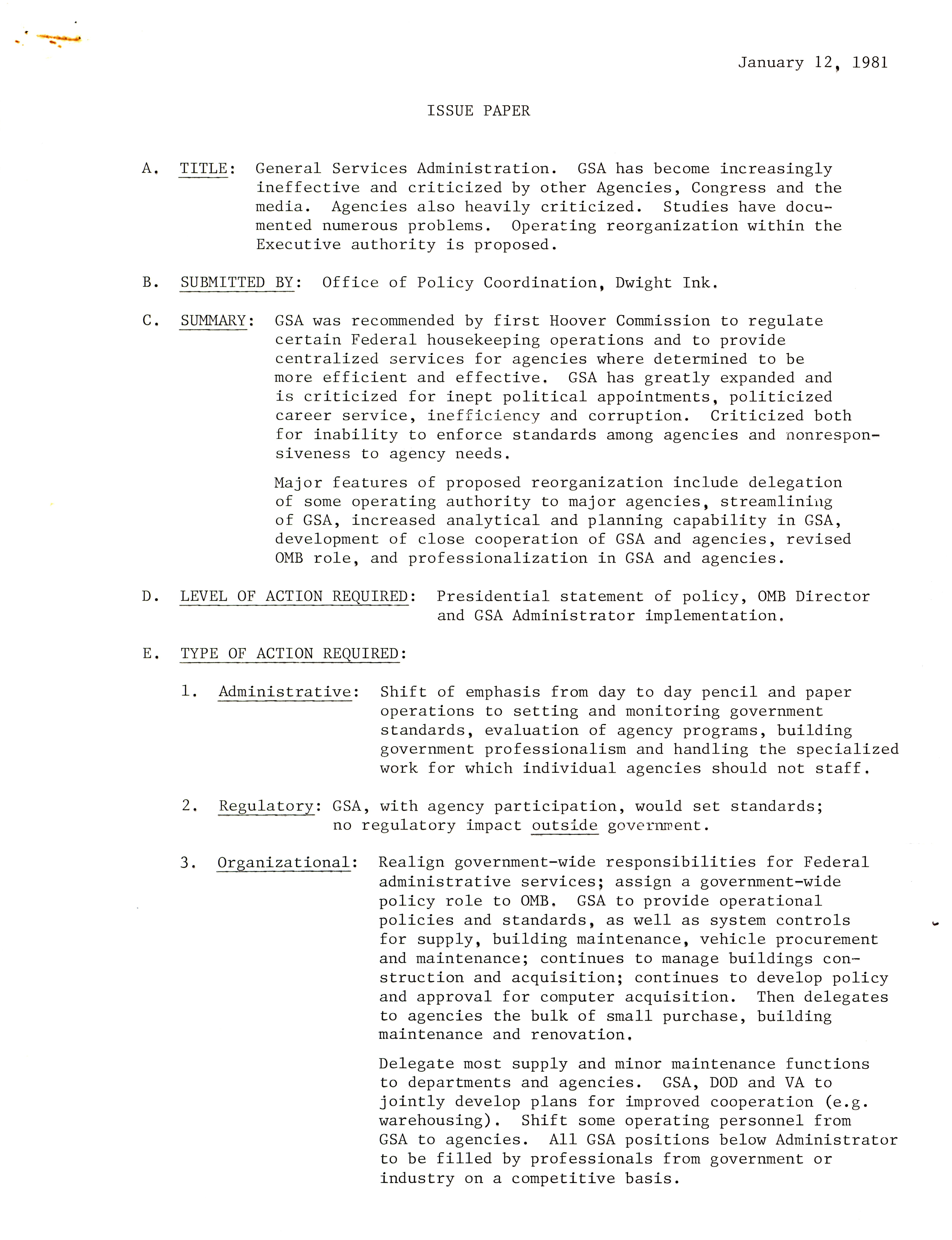 - "Issue paper on general services administration, January 12, 1981", Dwight Ink Collection, Iowa State University Library Digital Collections