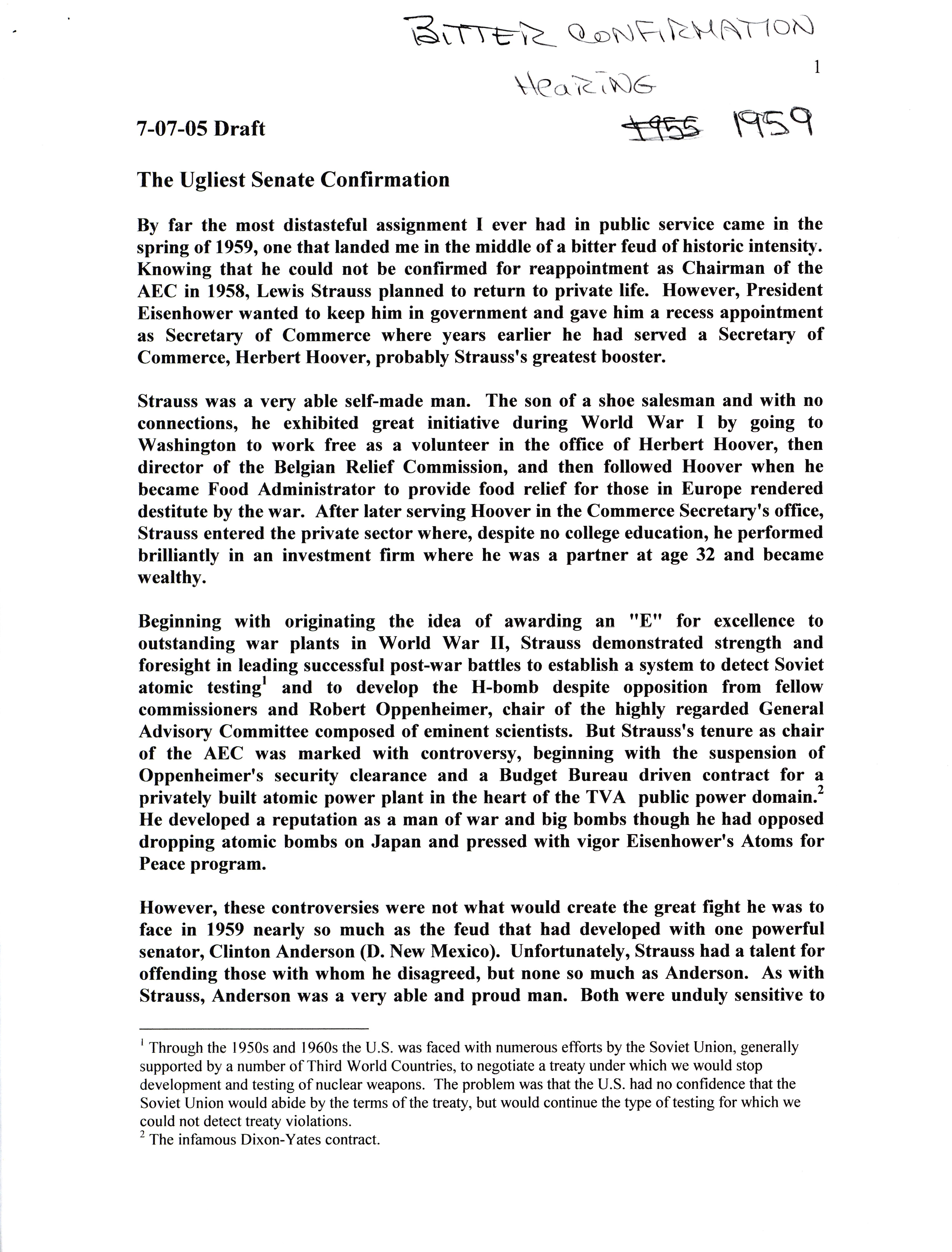 - Annotation: "Bitter confirmation hearing, 1959. 7-07-05 Draft"