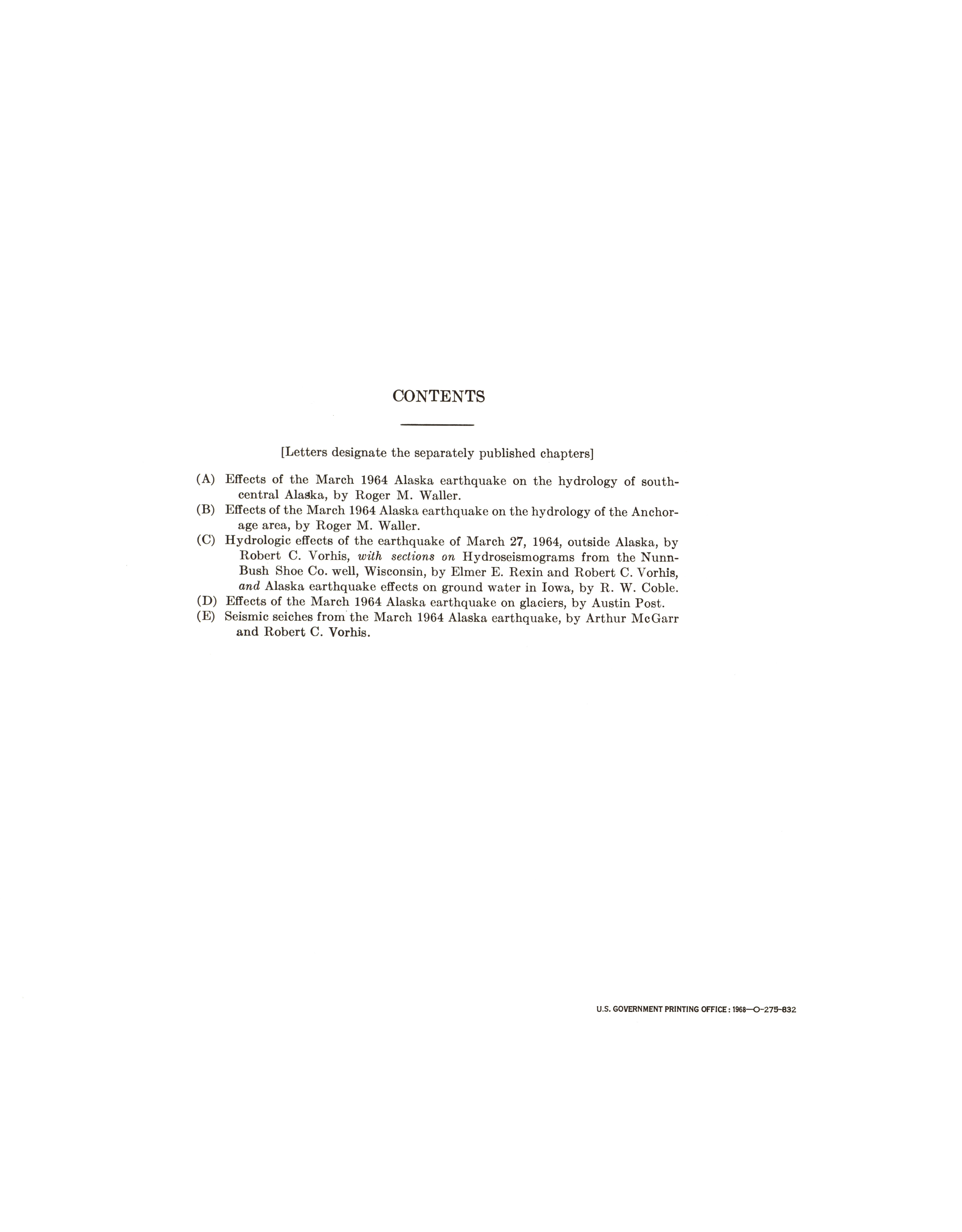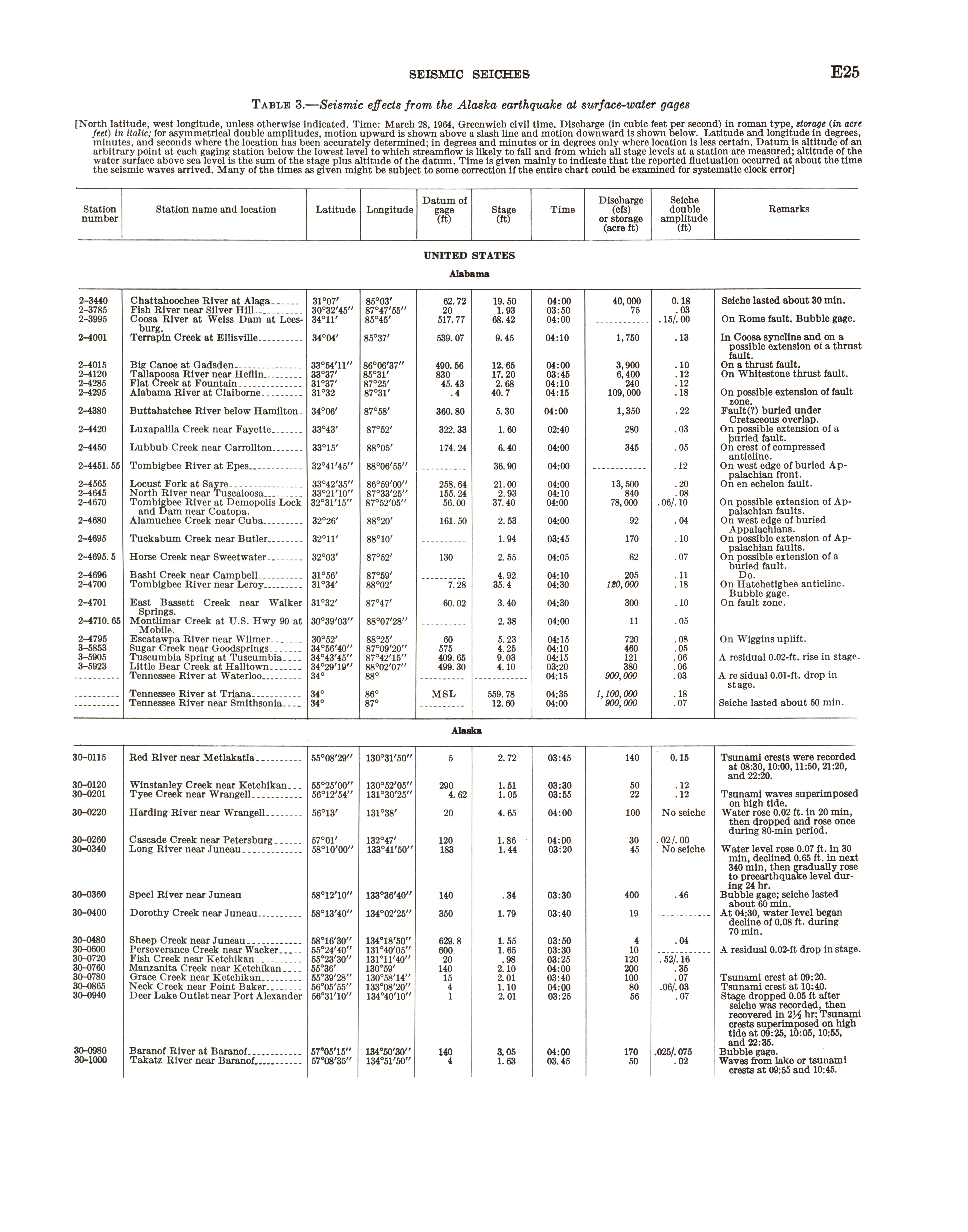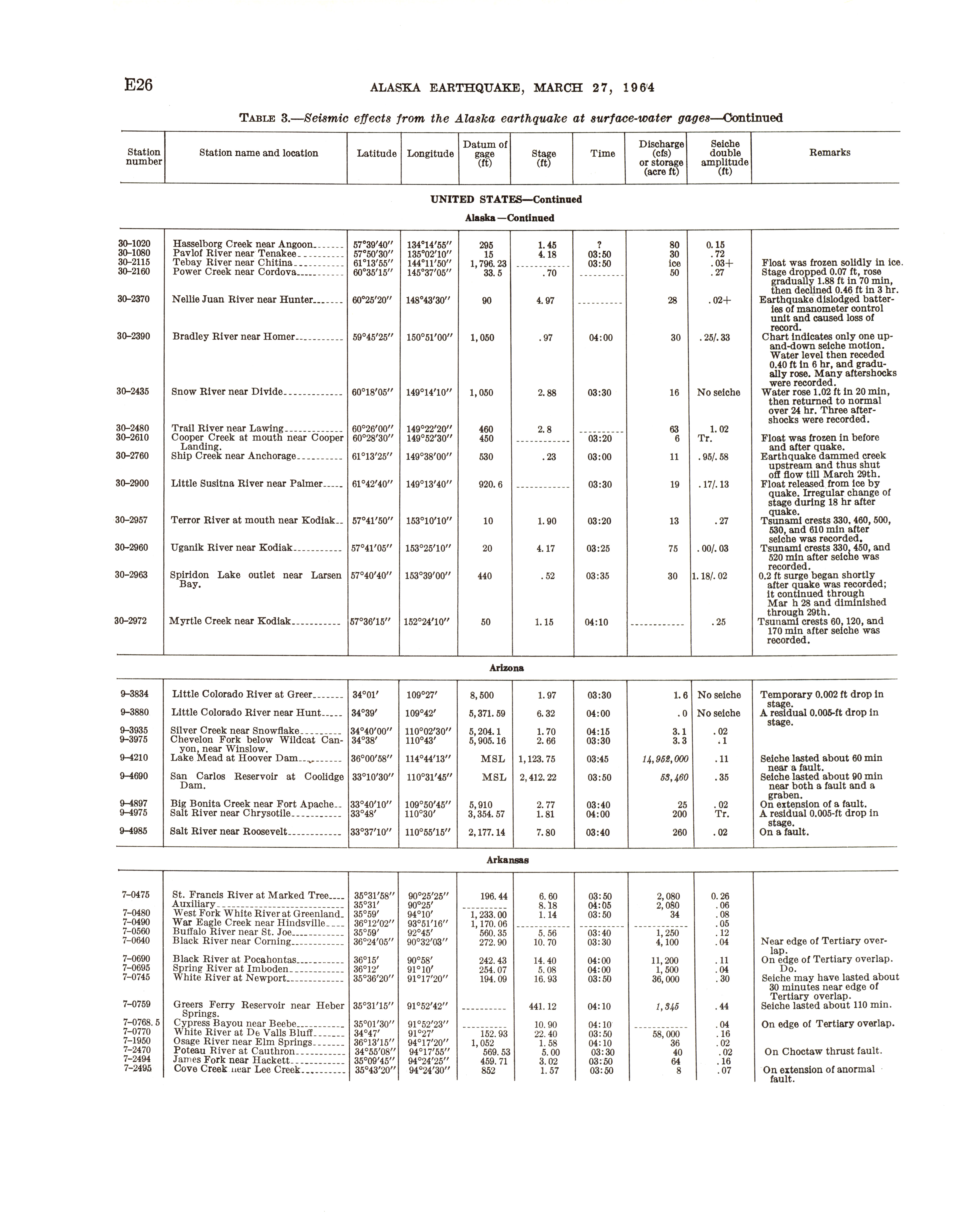 - "The Alaska earthquake, March 27, 1964: effects on hydrologic regimen. Seismic seiches", Dwight Ink Collection, Iowa State University Library Digital Collections