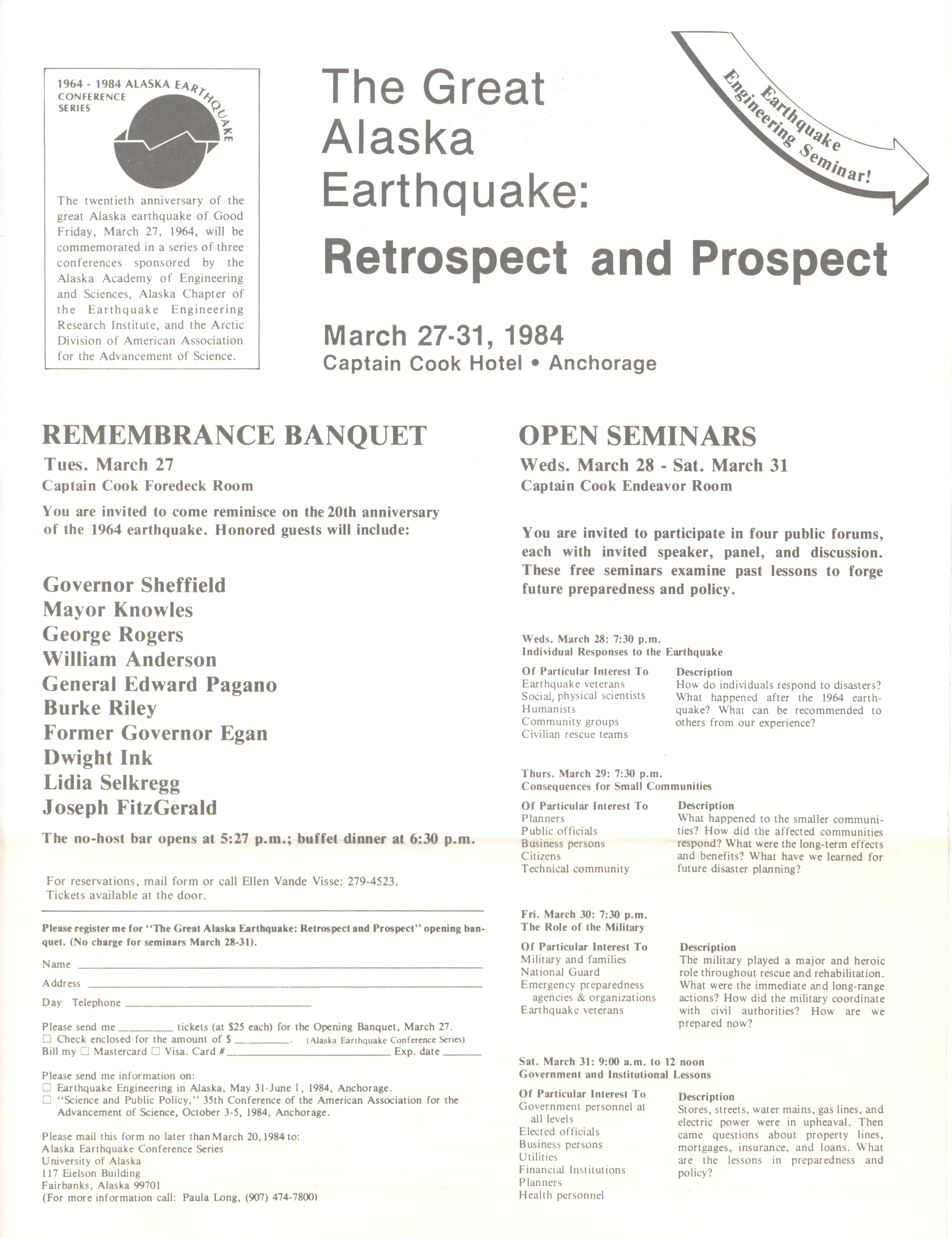 - The Great Alaska Earthquake: Retrospect and Prospect conference photographs and correspondence