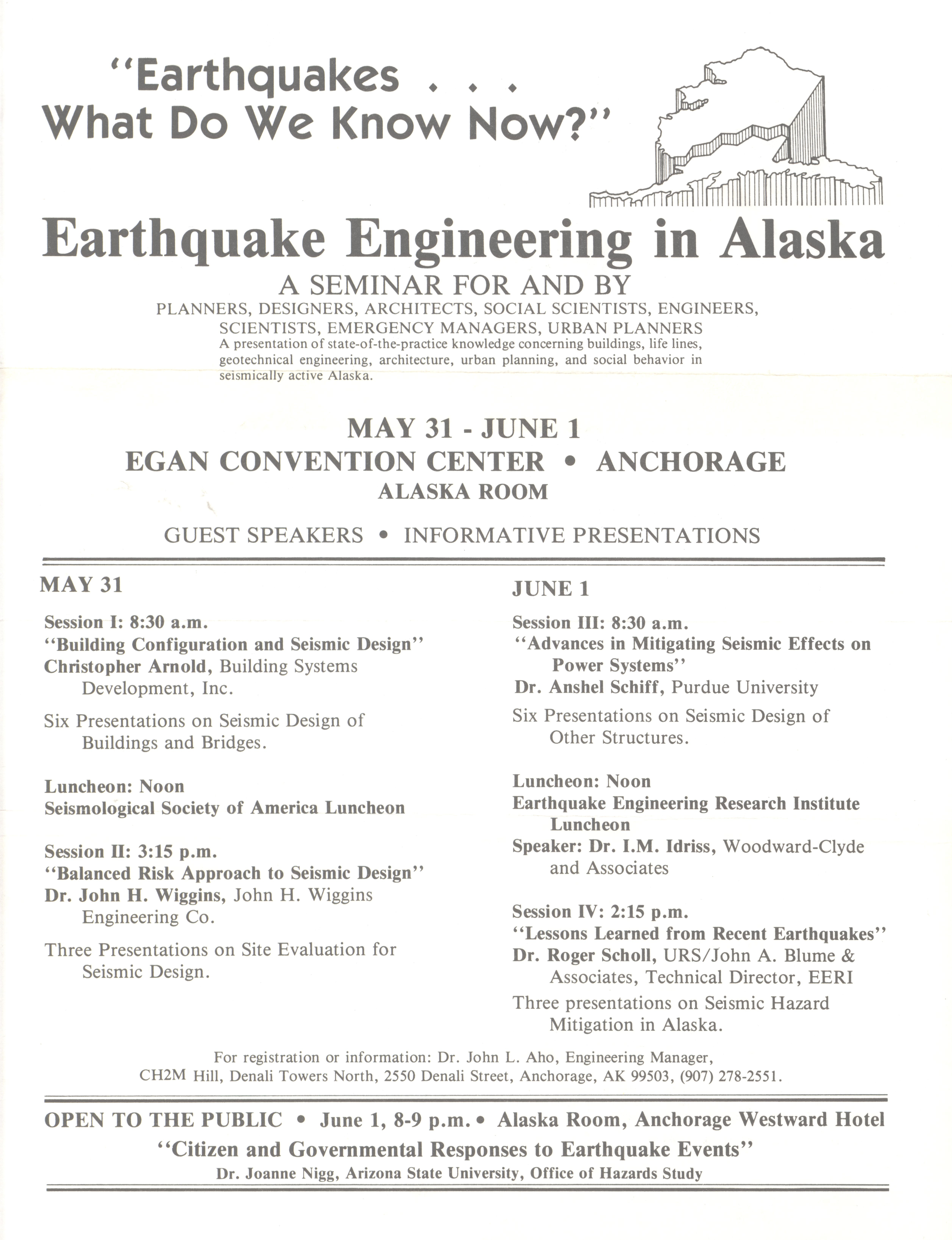 - "The great Alaska earthquake: retrospect and prospect, March 27-31, 1984", Dwight Ink Collection, Iowa State University Library Digital Collections