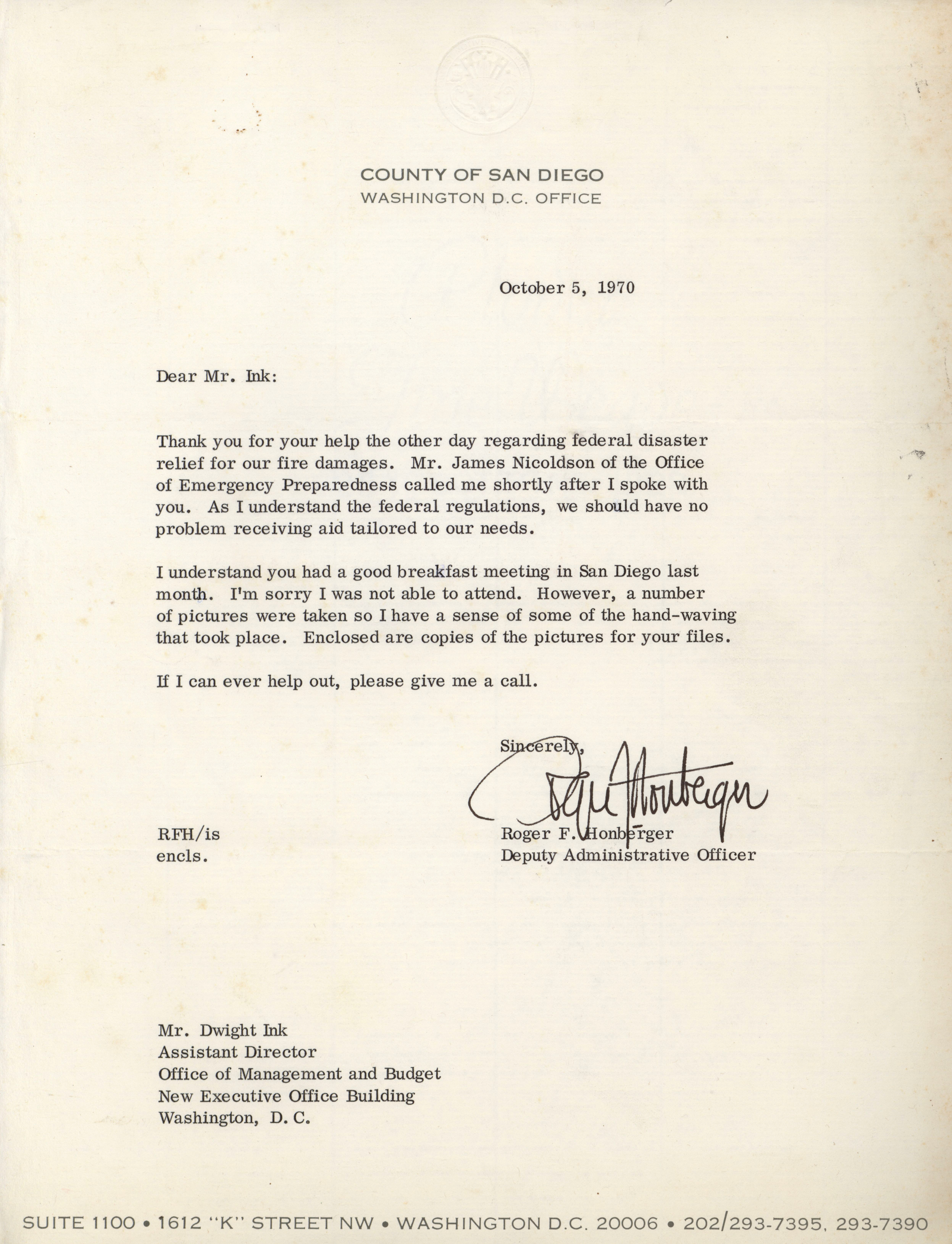 - Roger F. Honberger letter to Dwight Ink, October 5, 1970