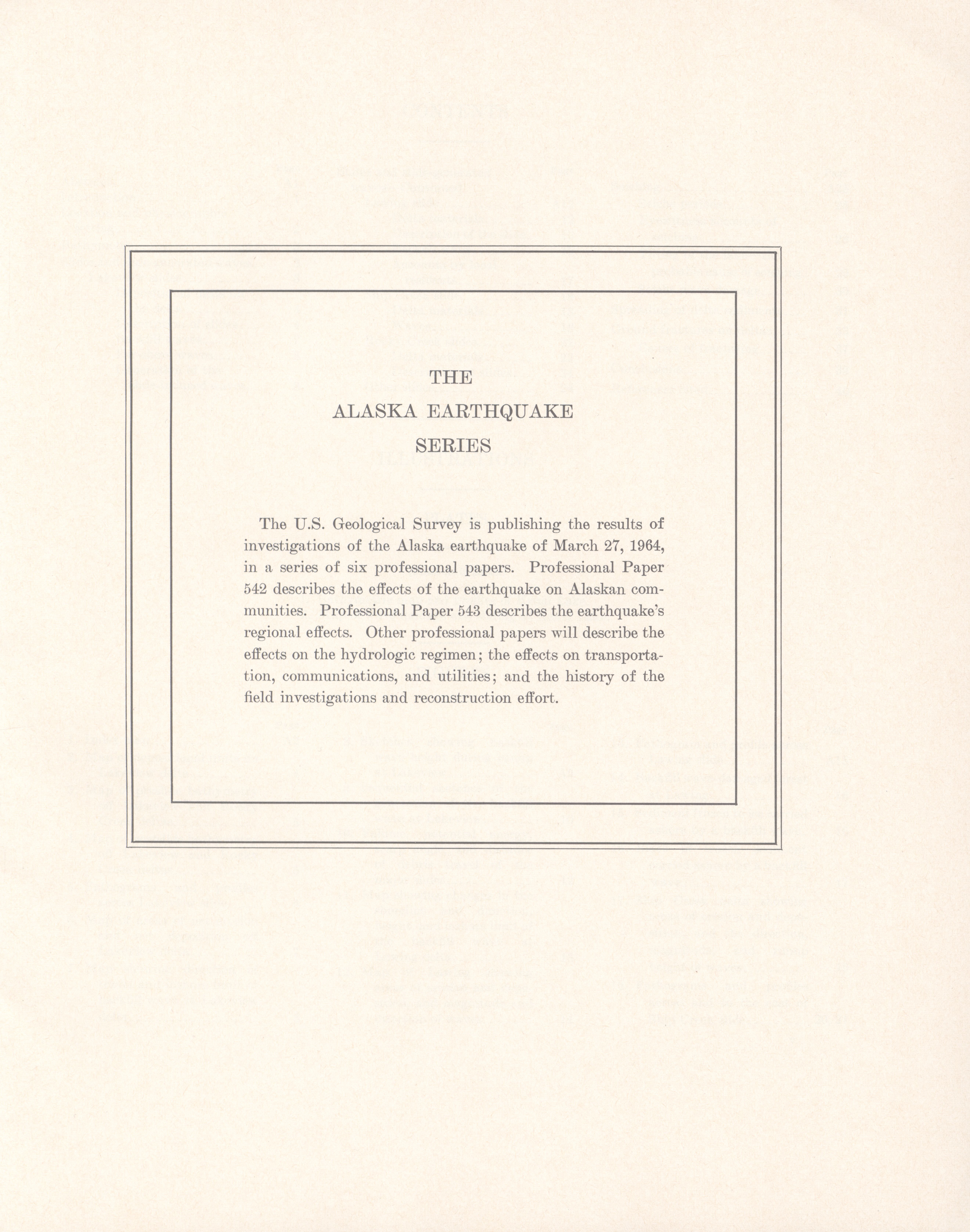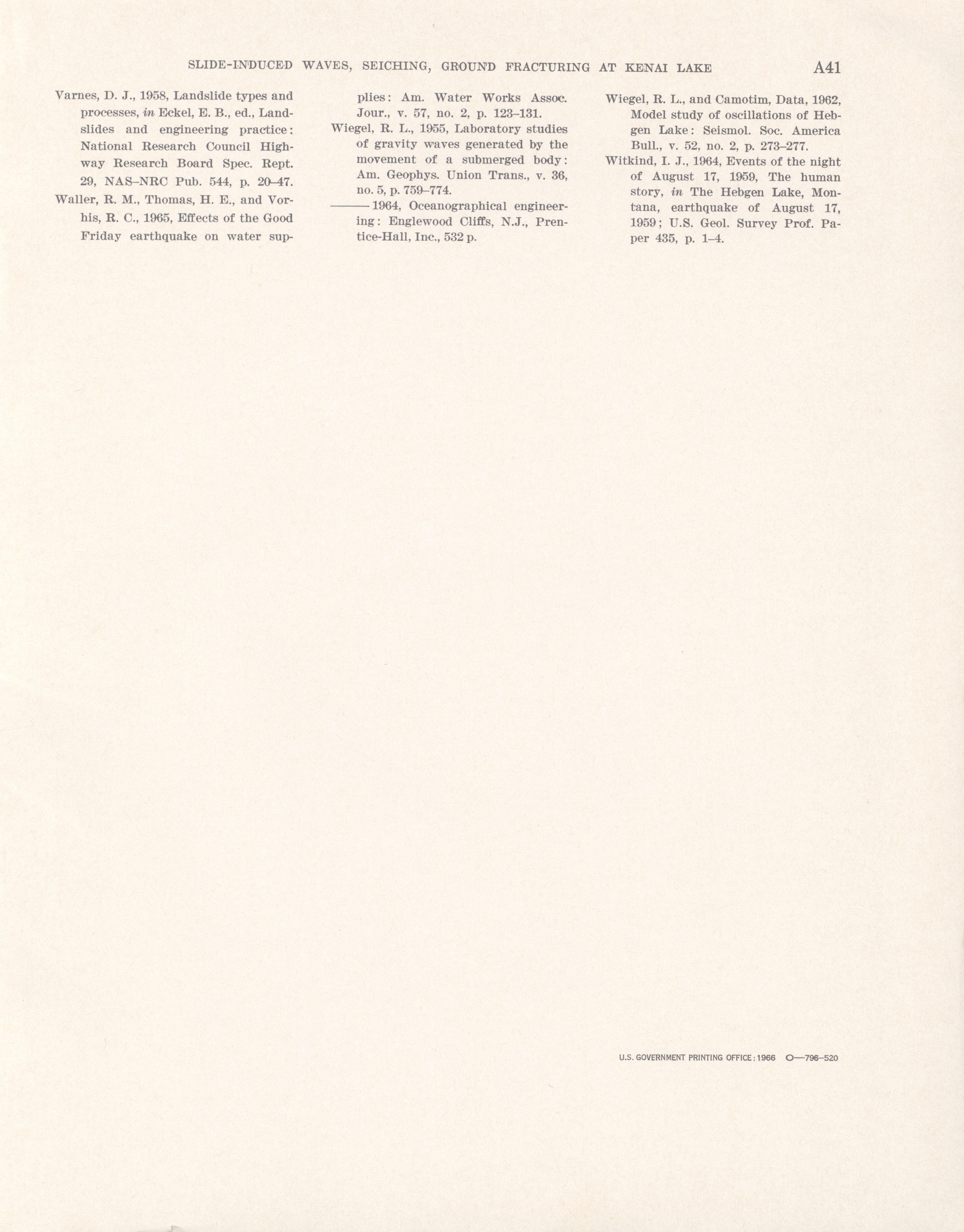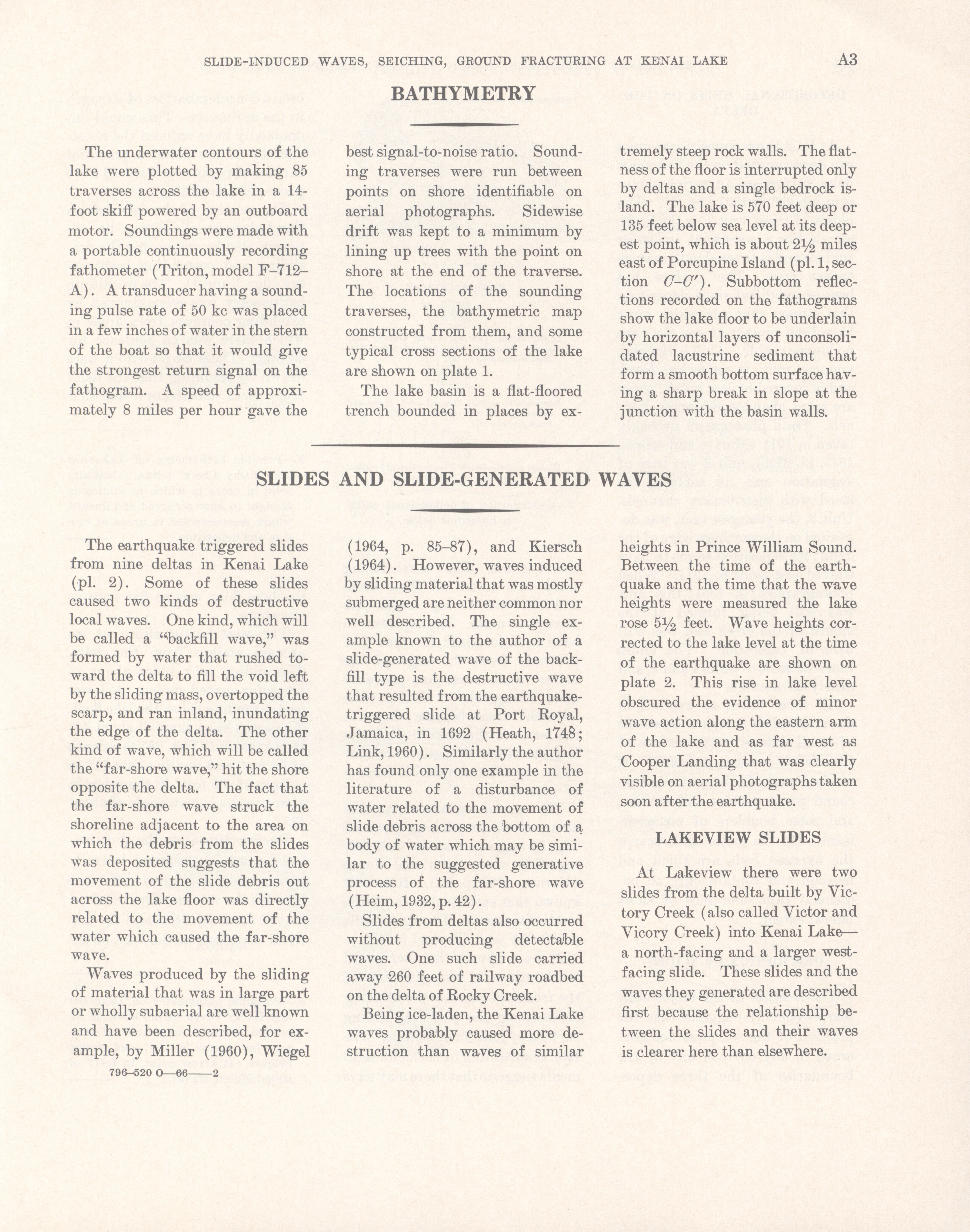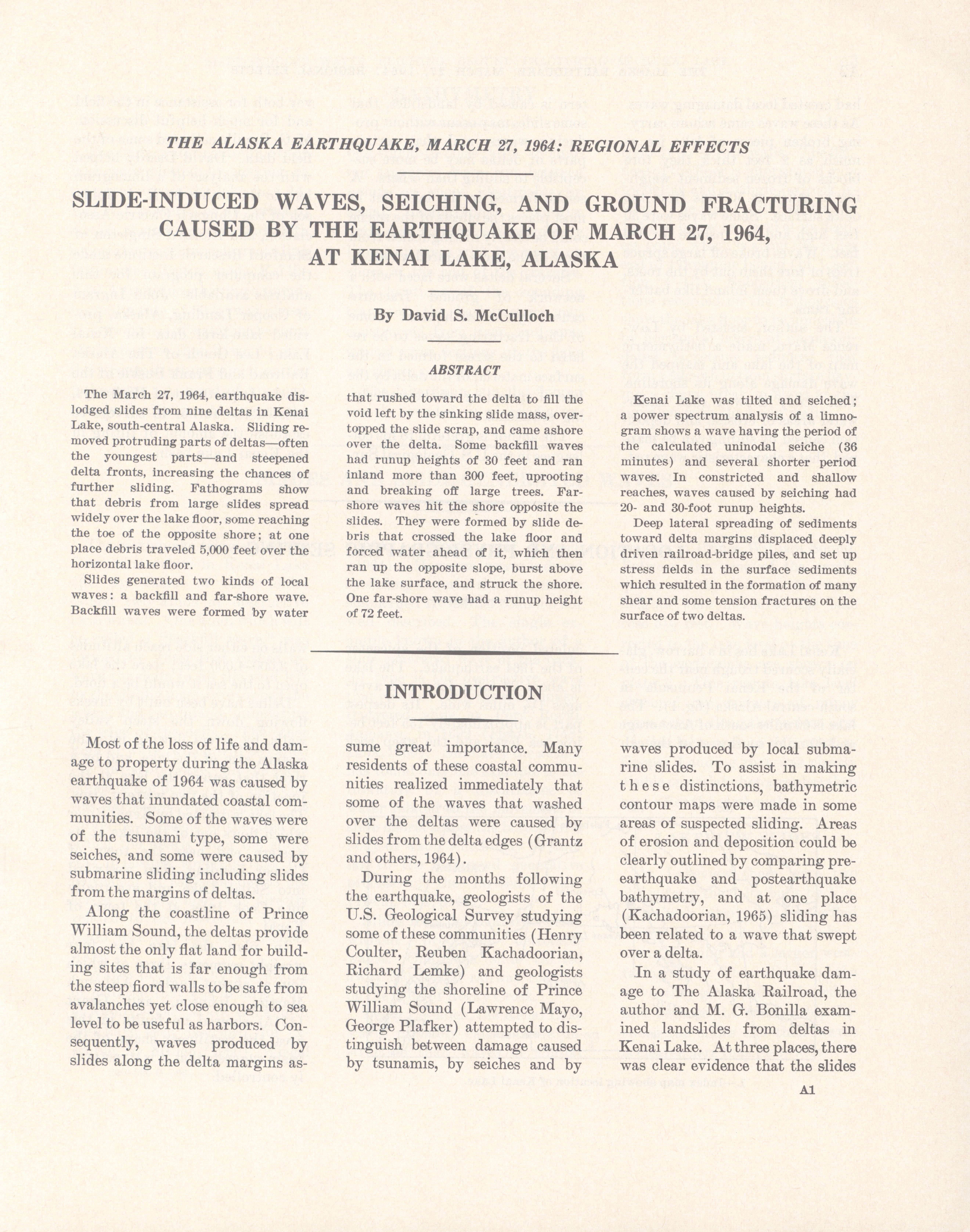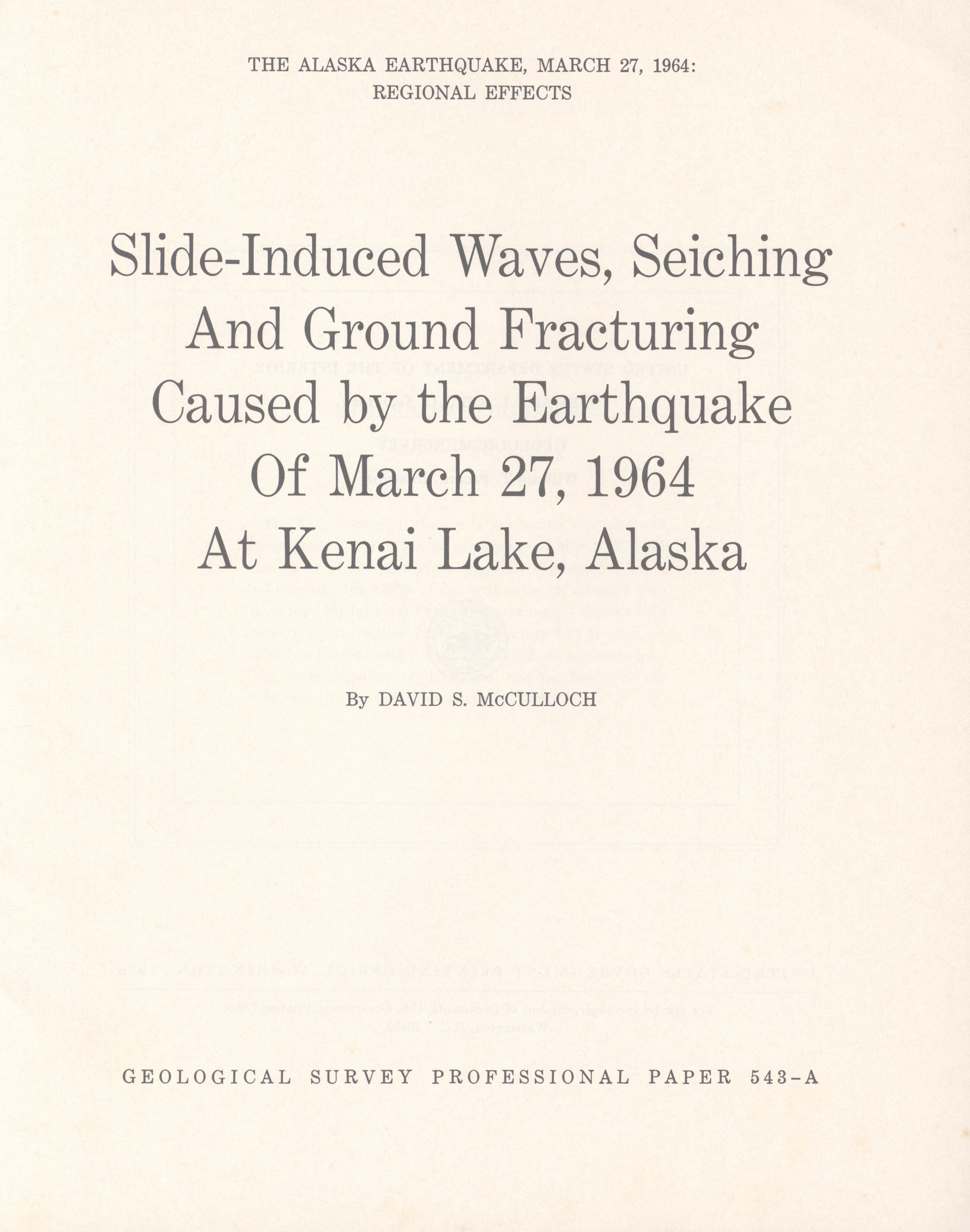 - Geological Survey professional paper 543A: regional effects, slide-induced waves, seiching, and ground fracturing at Kenai Lake, 1966