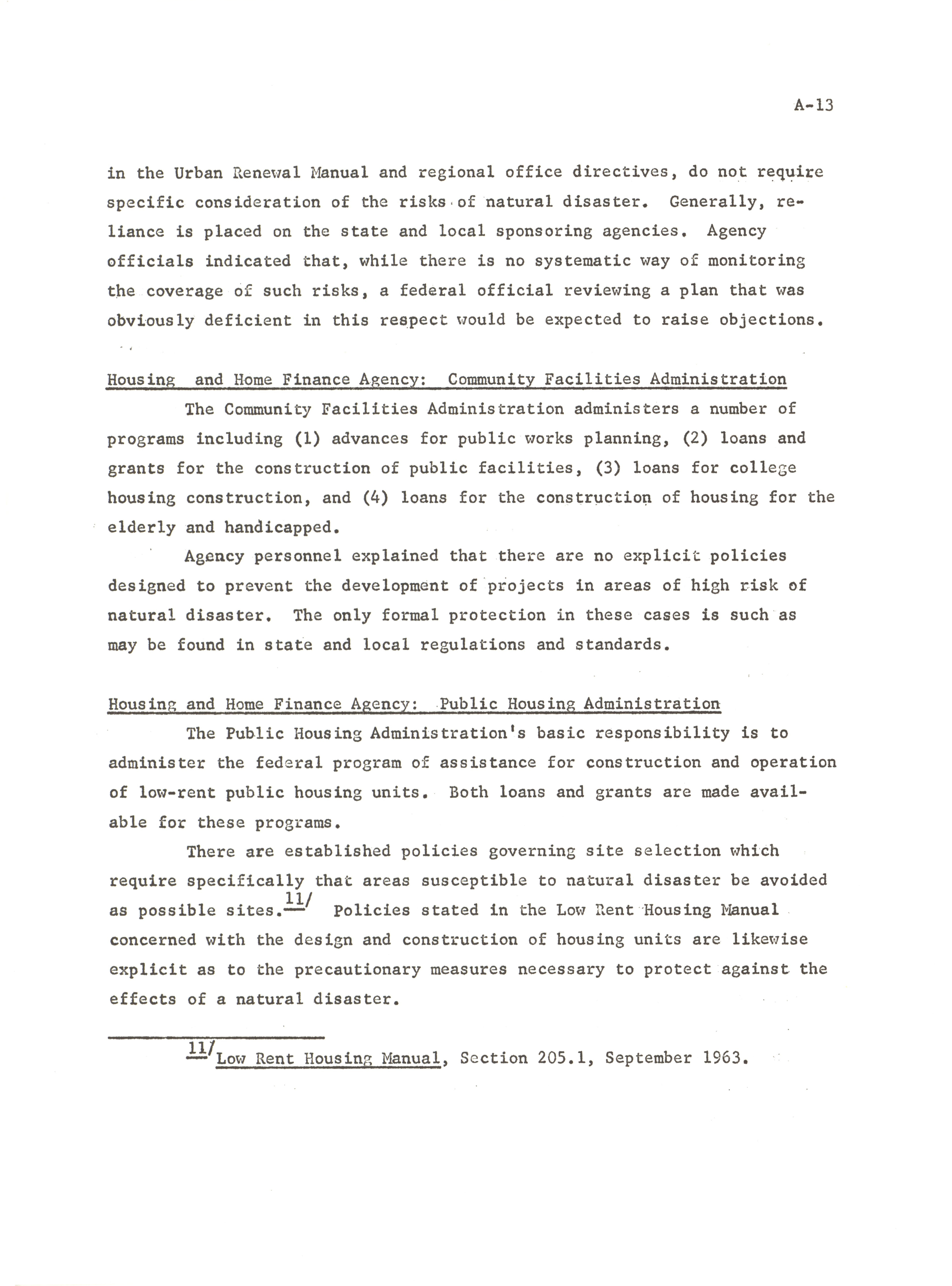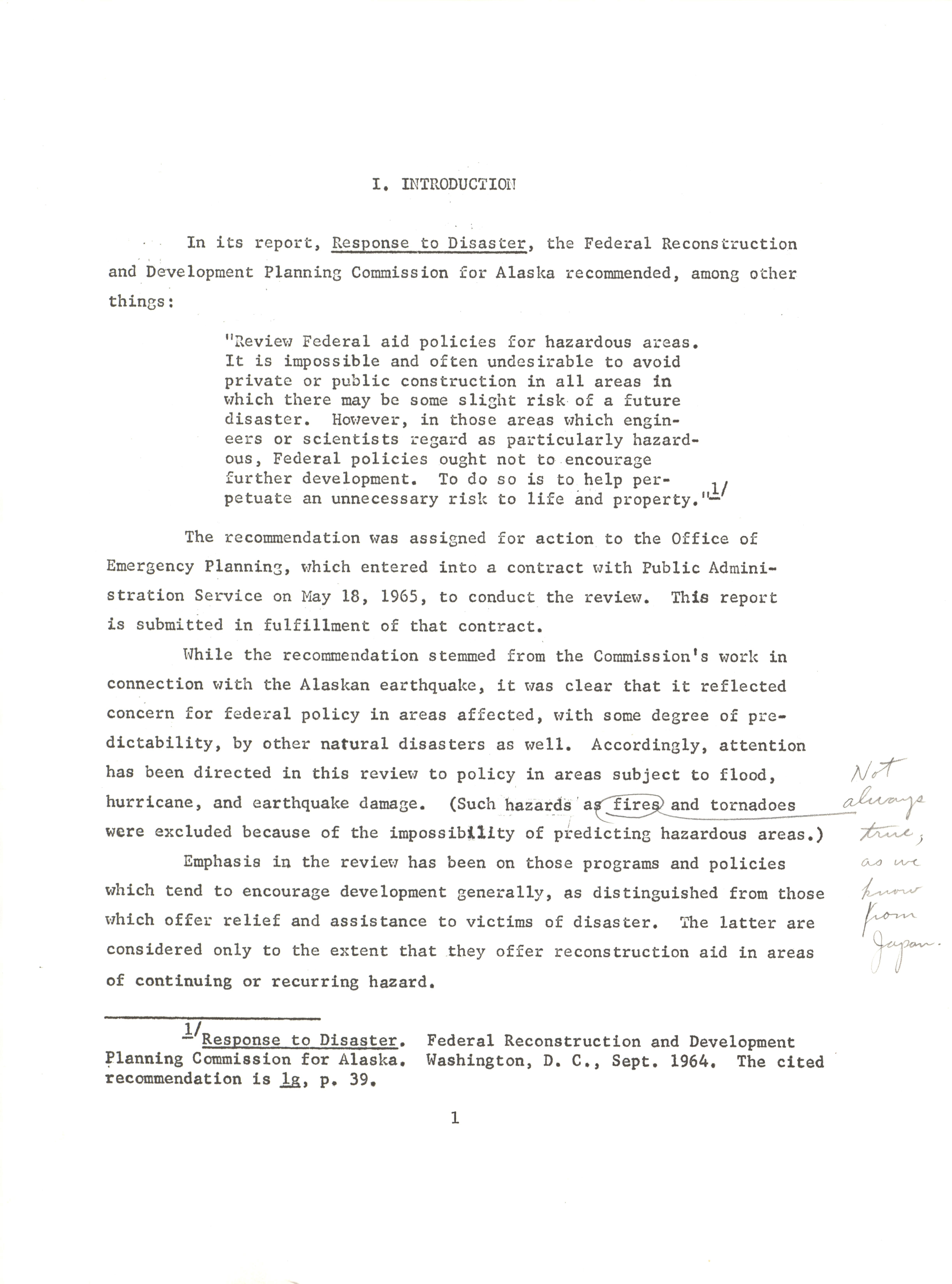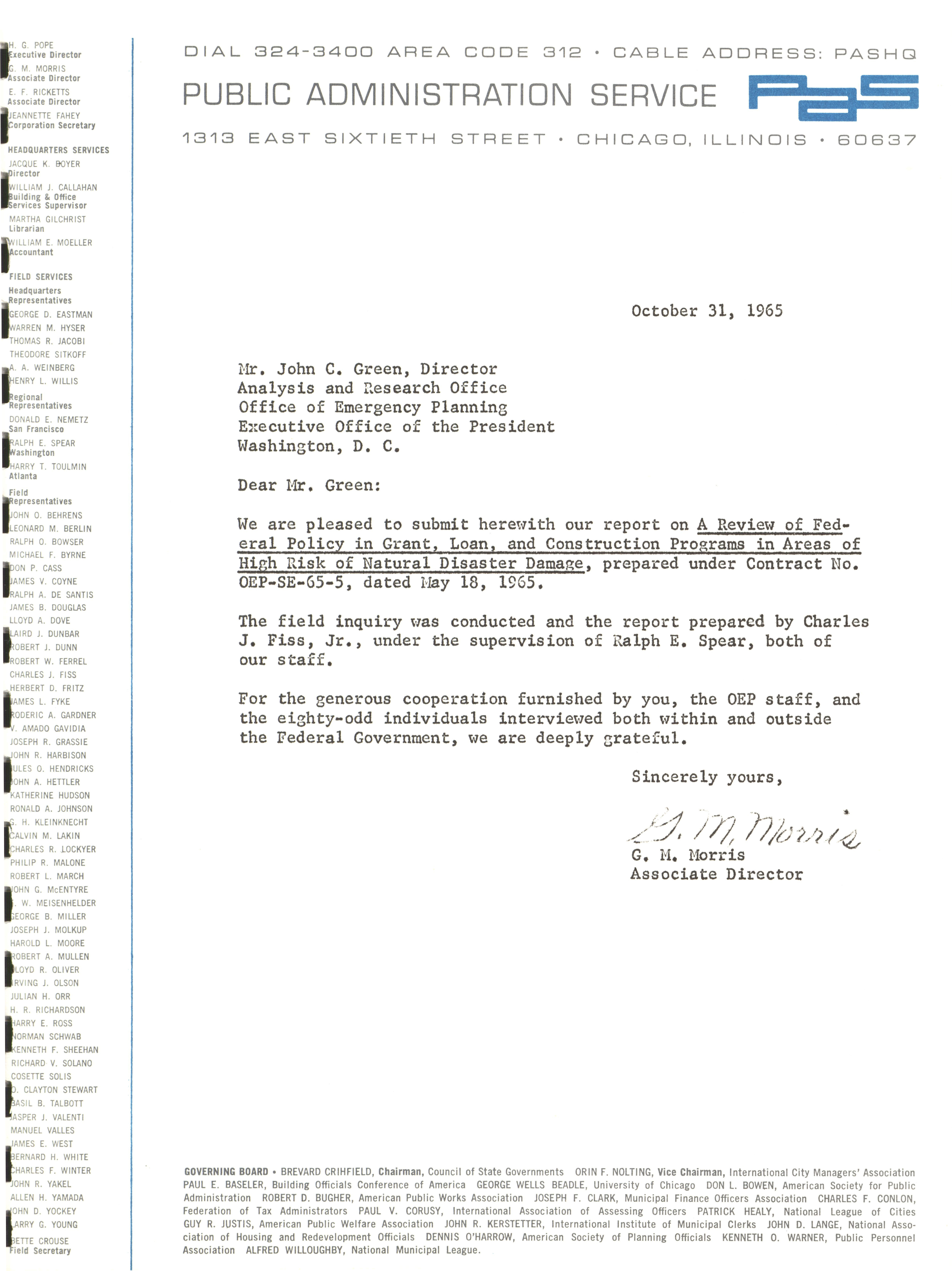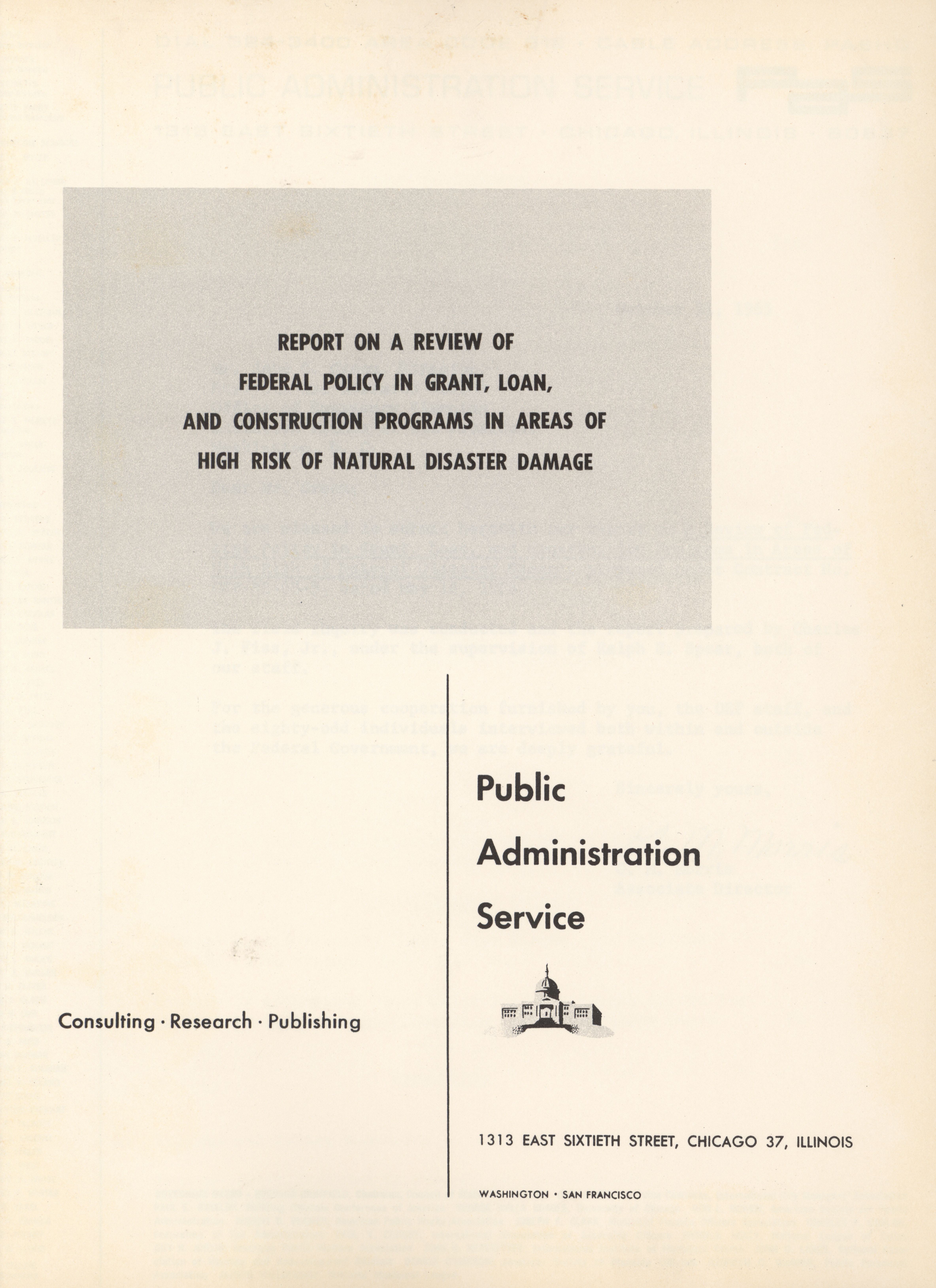 - Public Administrative Service. "Federal Policy in Grant, Loan, and Construction Programs in Areas of High-Risk of National Disaster Damage," report, 1965-1966