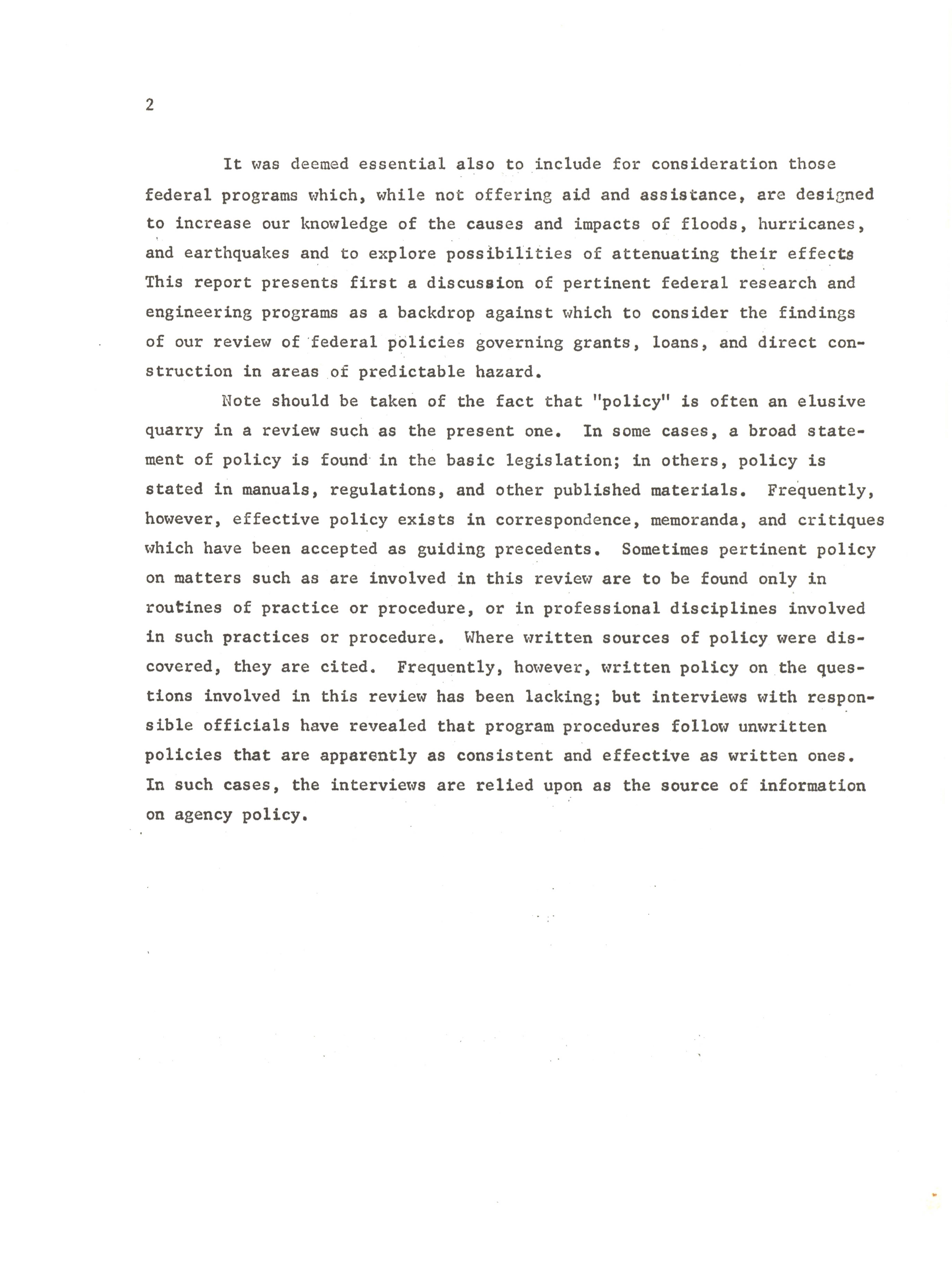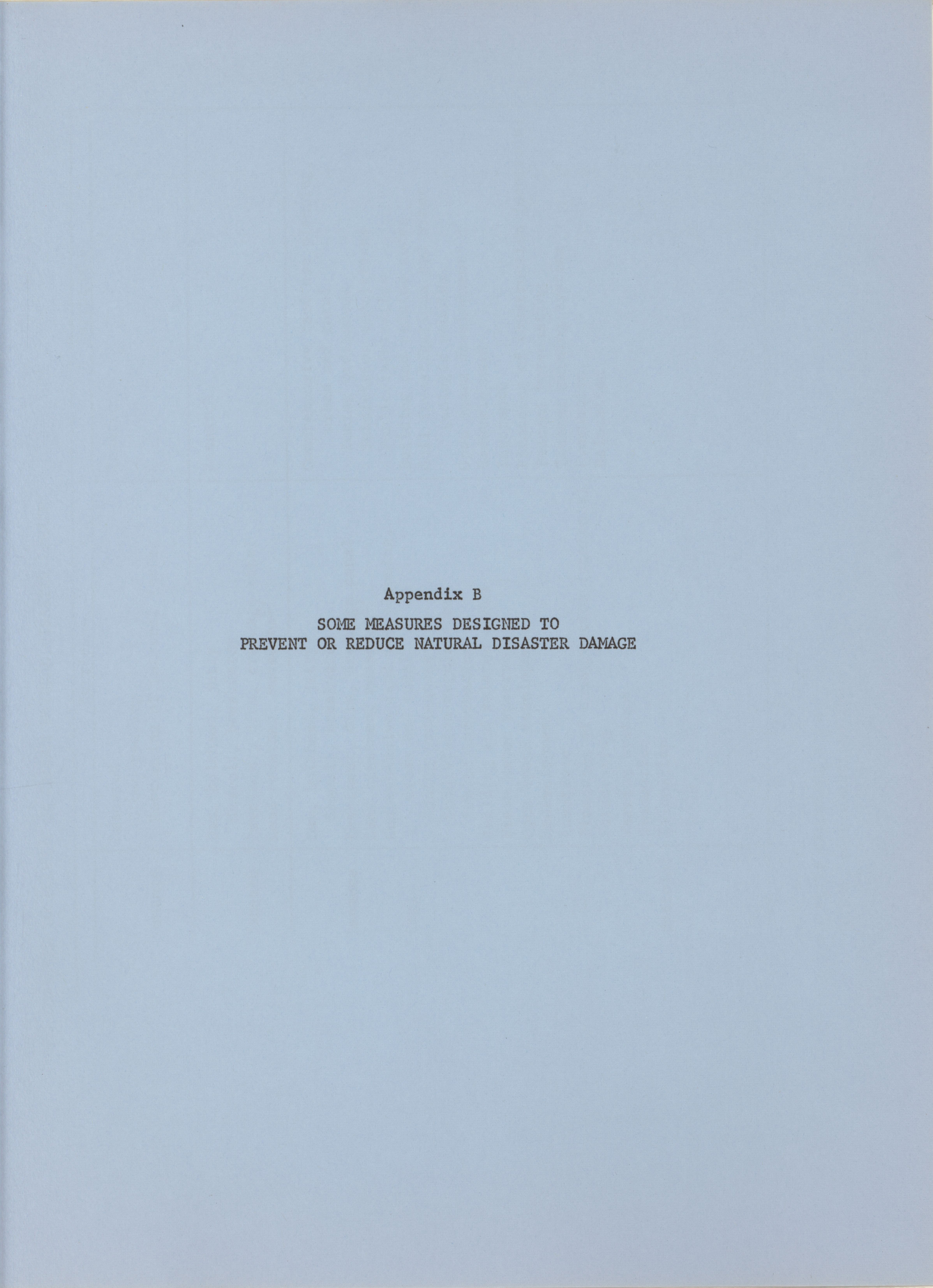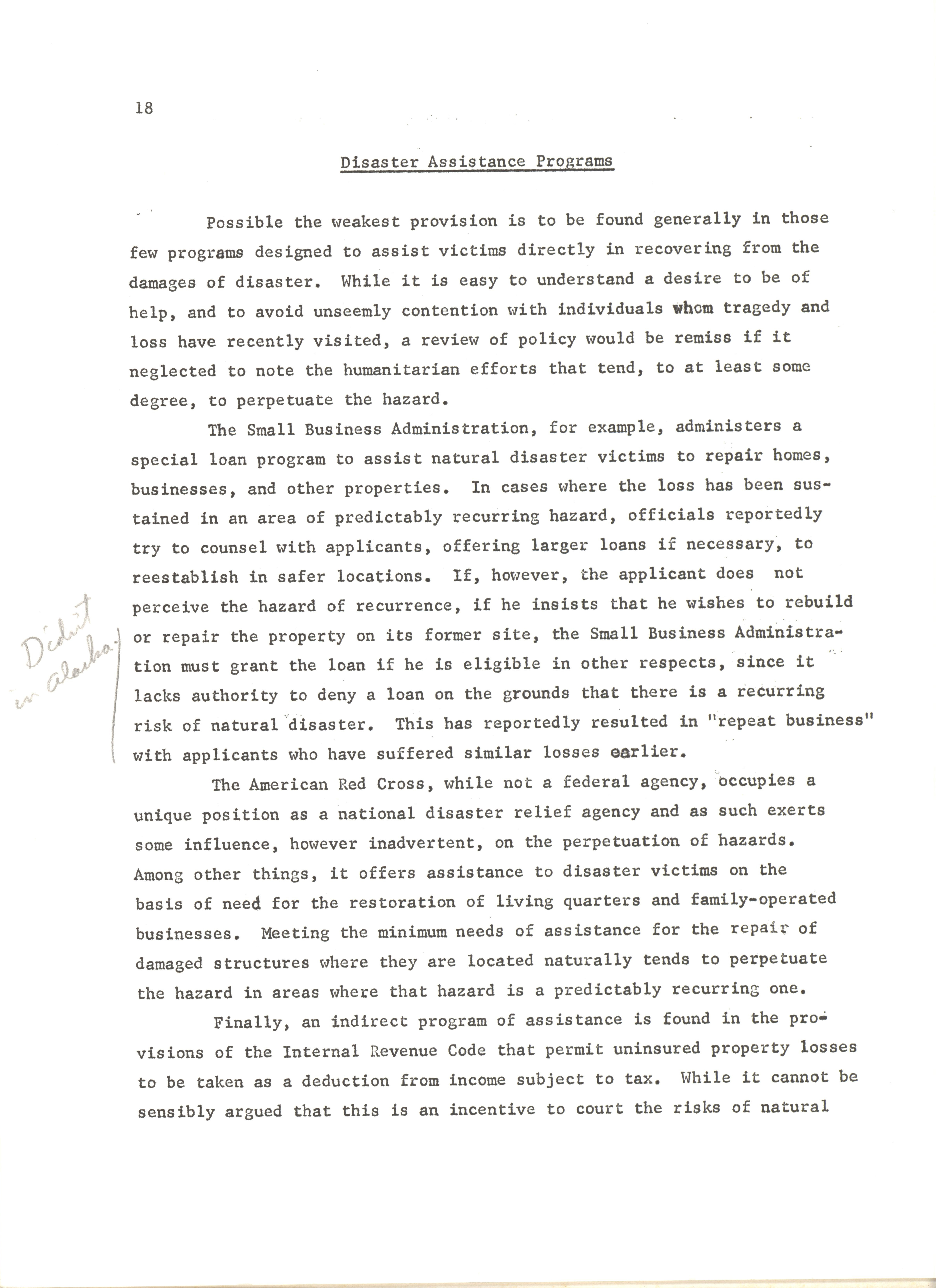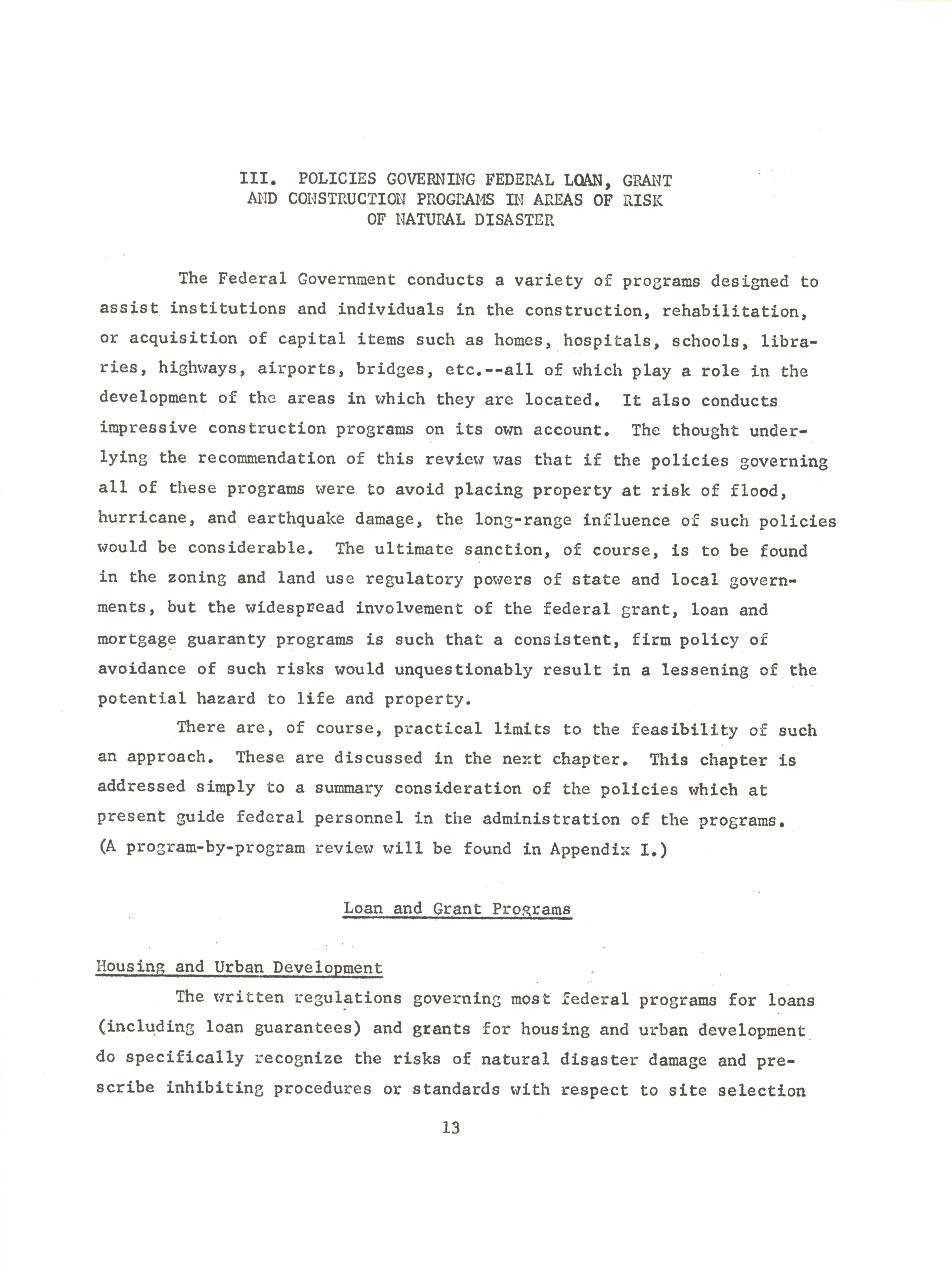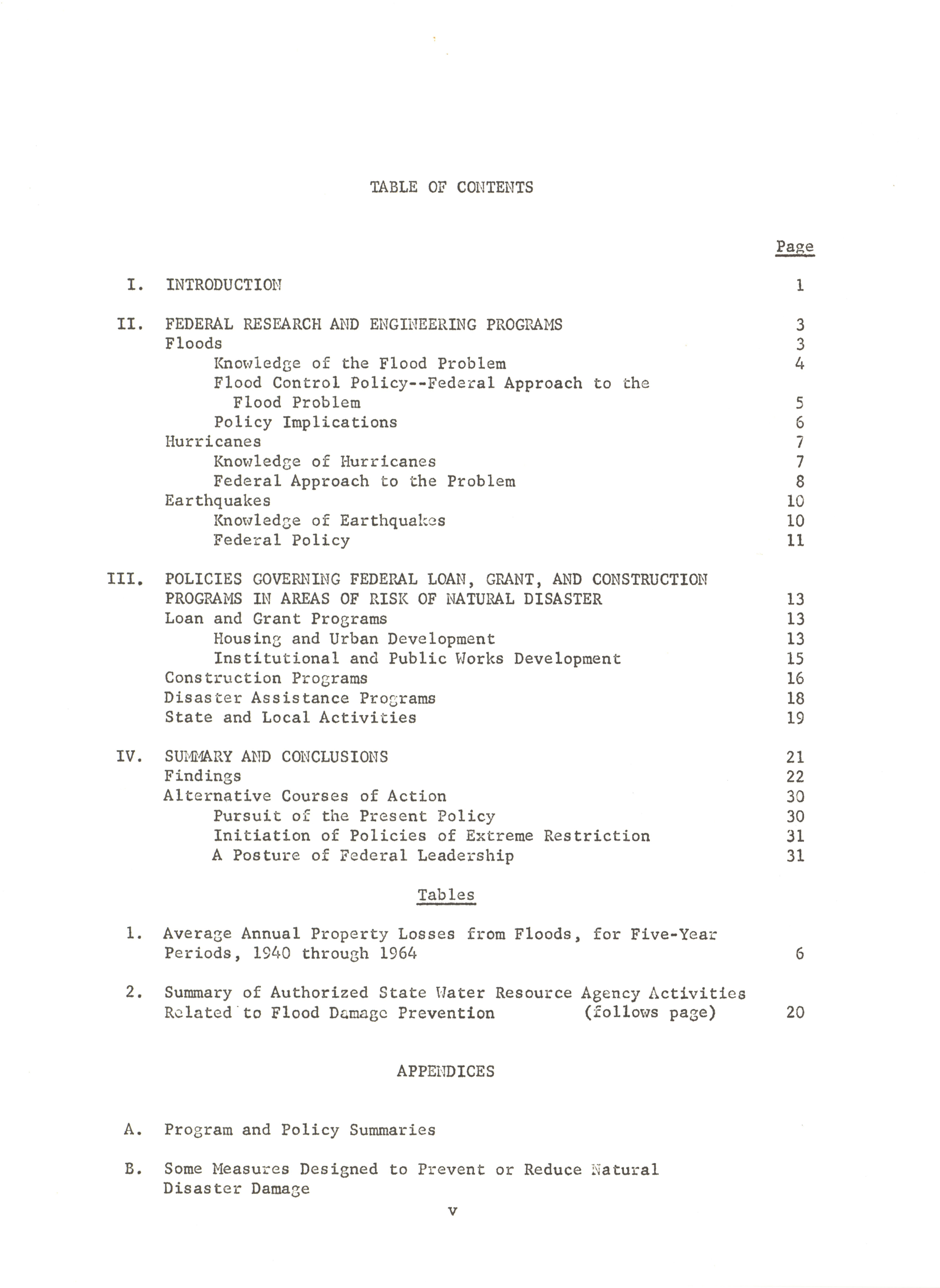 - "Report on a review of federal policy in grant, loan, and construction programs in areas of high risk of natural disaster damage", Dwight Ink Collection, Iowa State University Library Digital Collections
