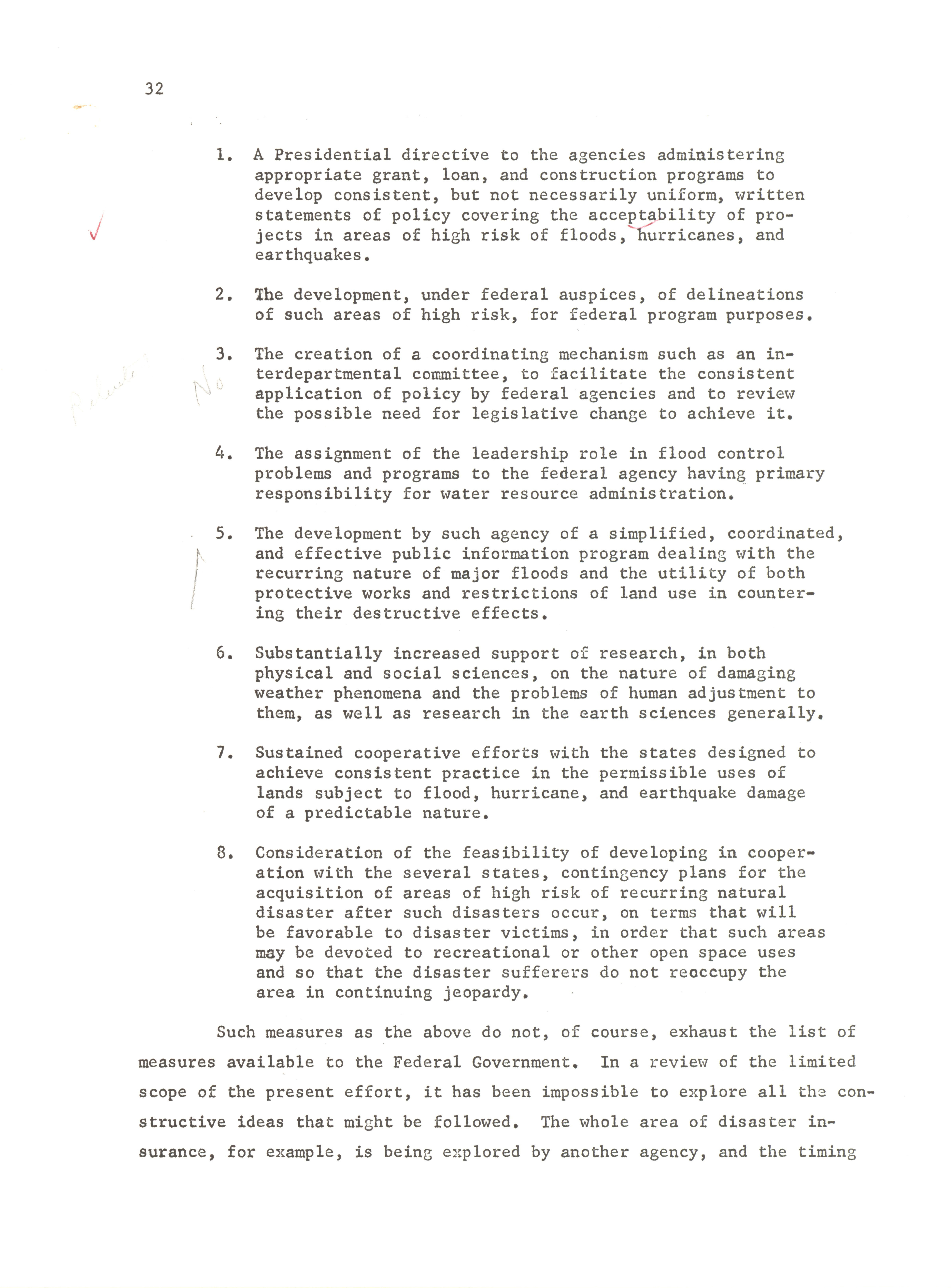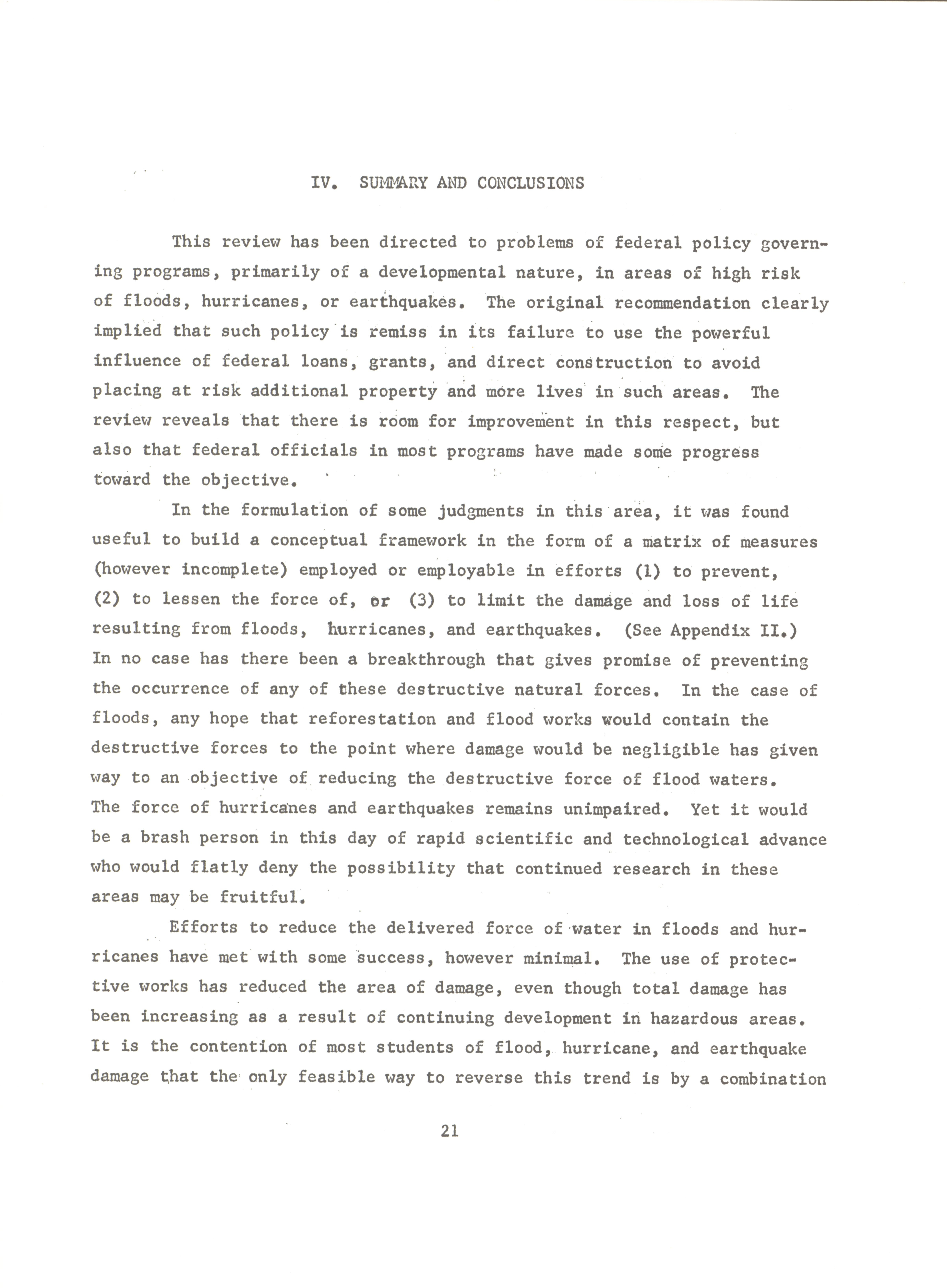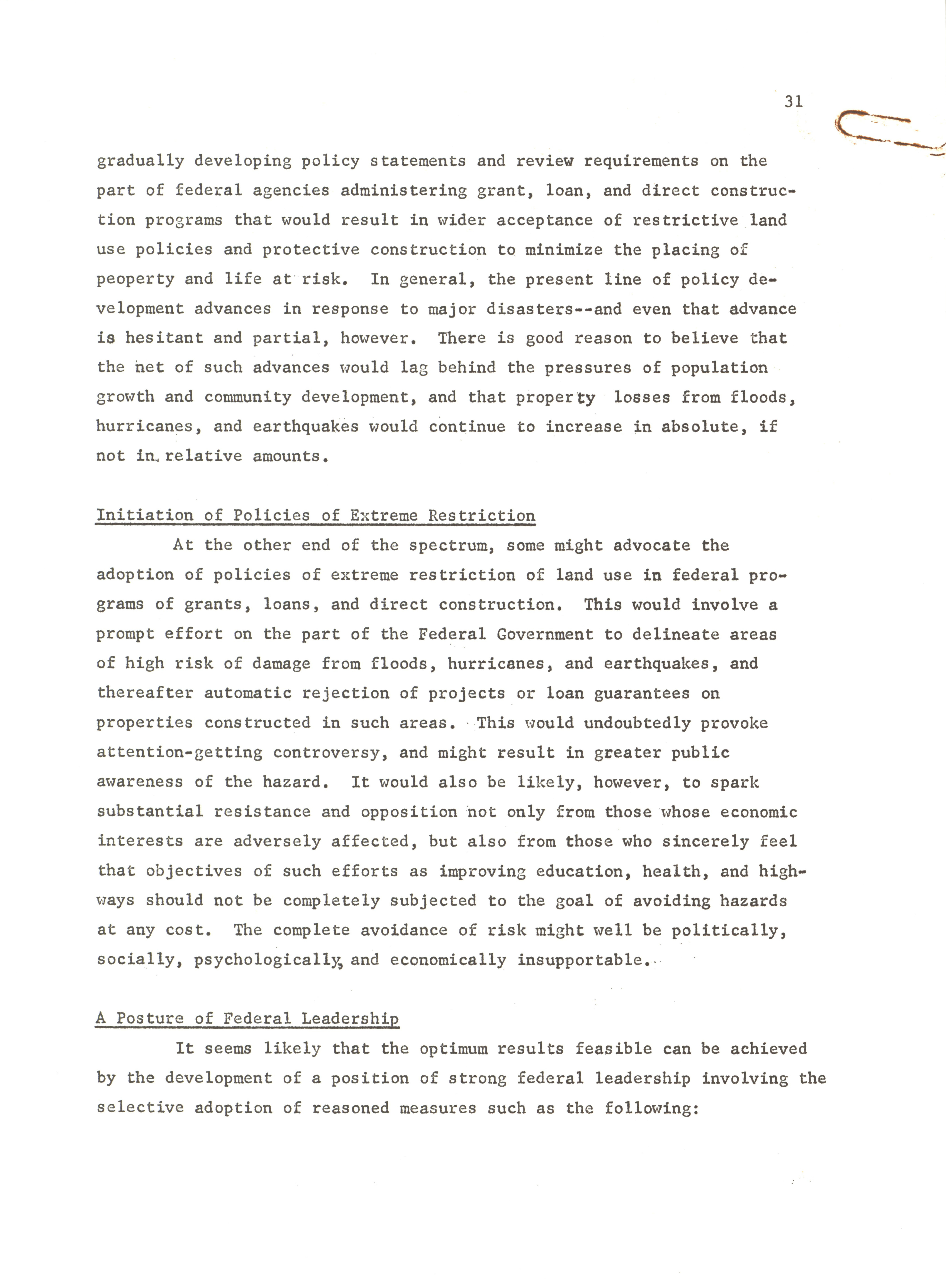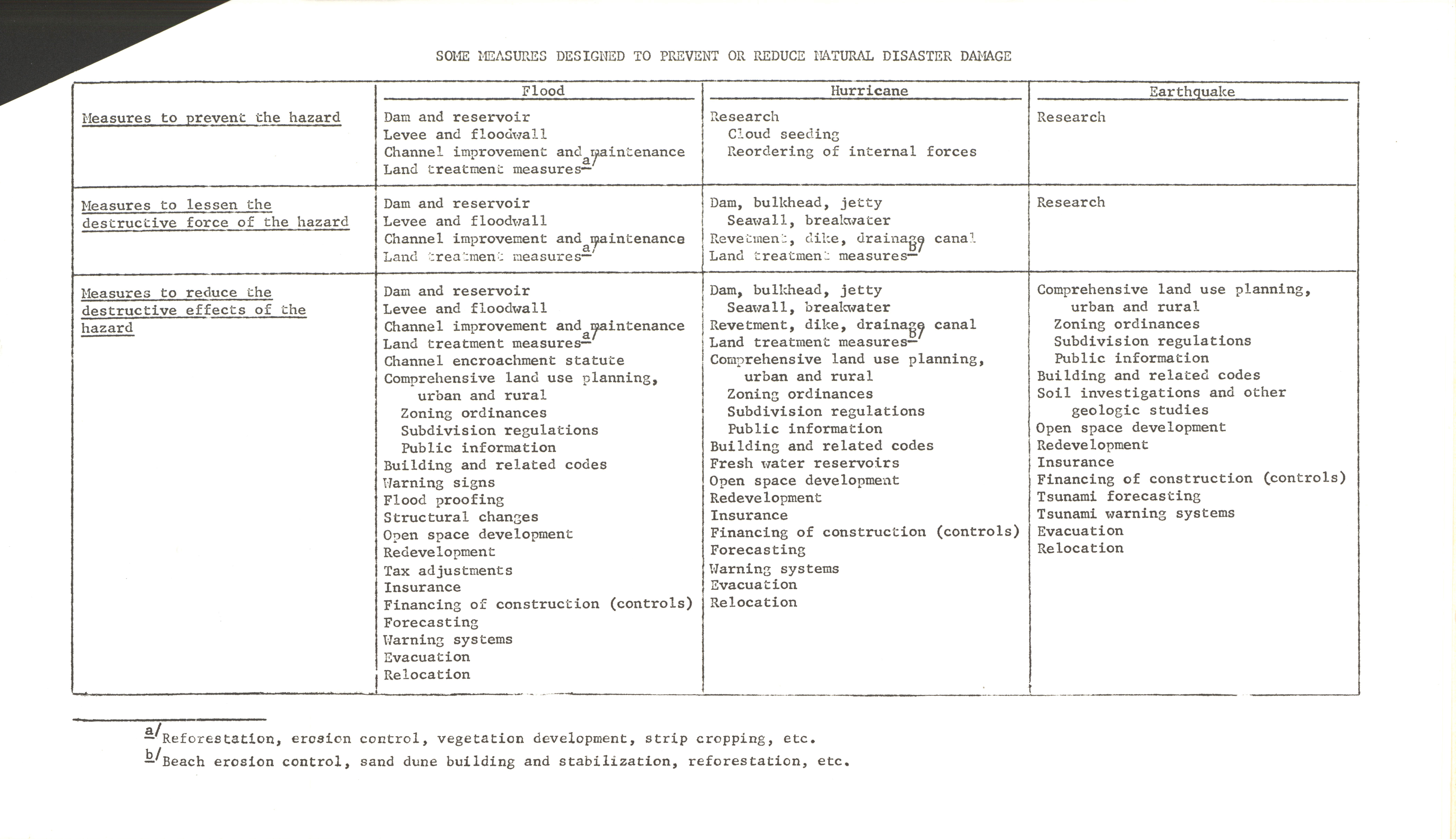 - "Report on a review of federal policy in grant, loan, and construction programs in areas of high risk of natural disaster damage", Dwight Ink Collection, Iowa State University Library Digital Collections