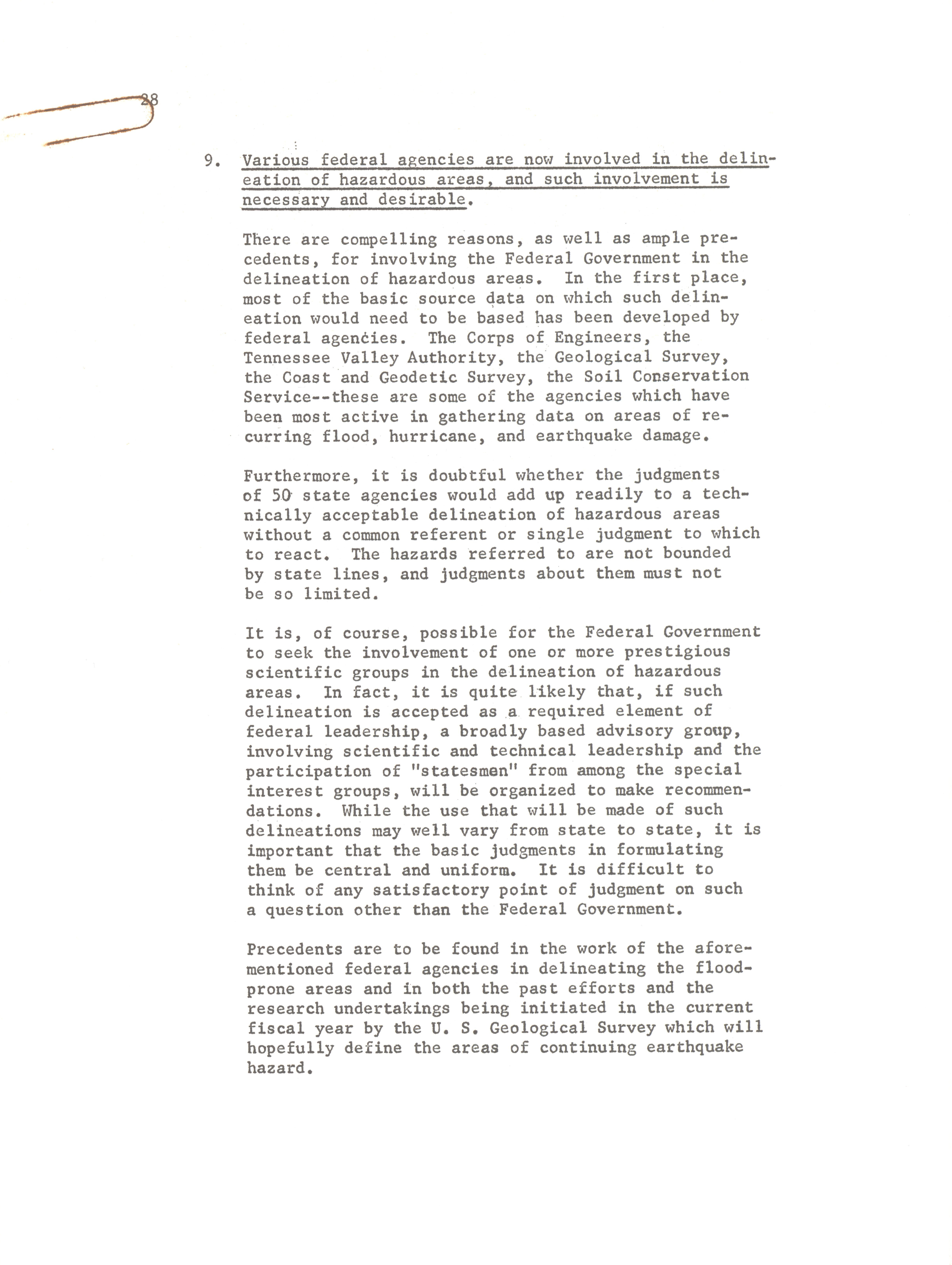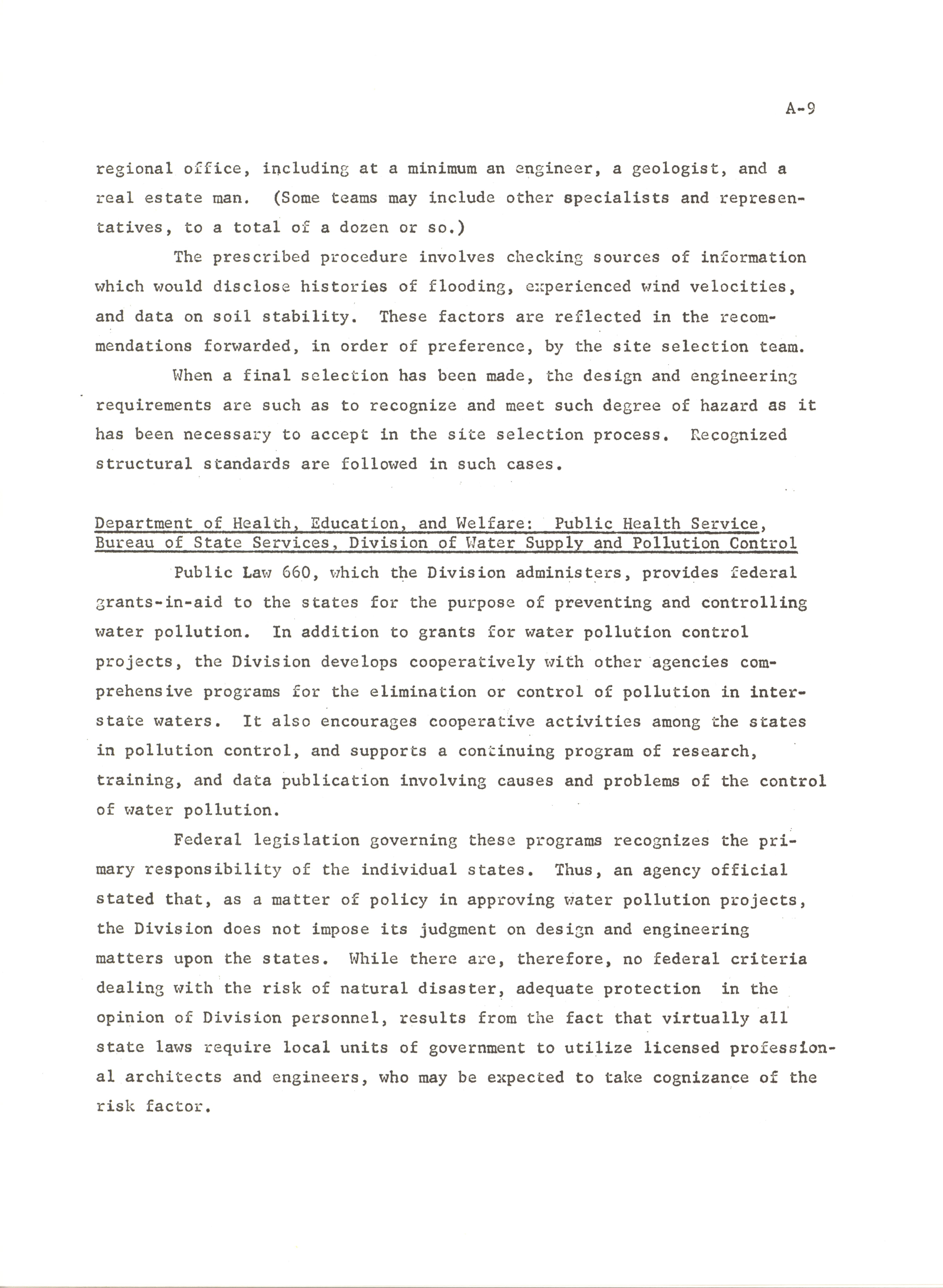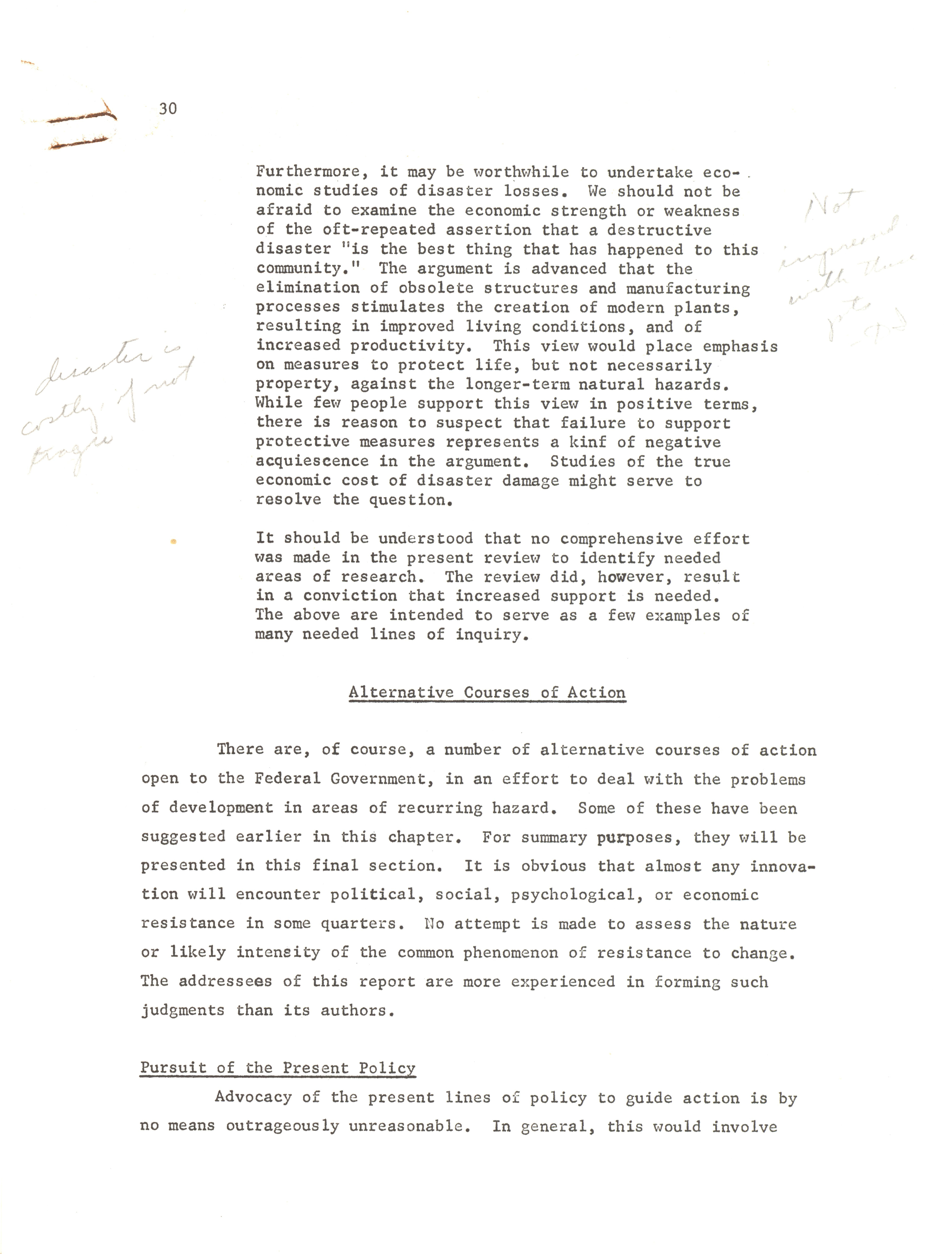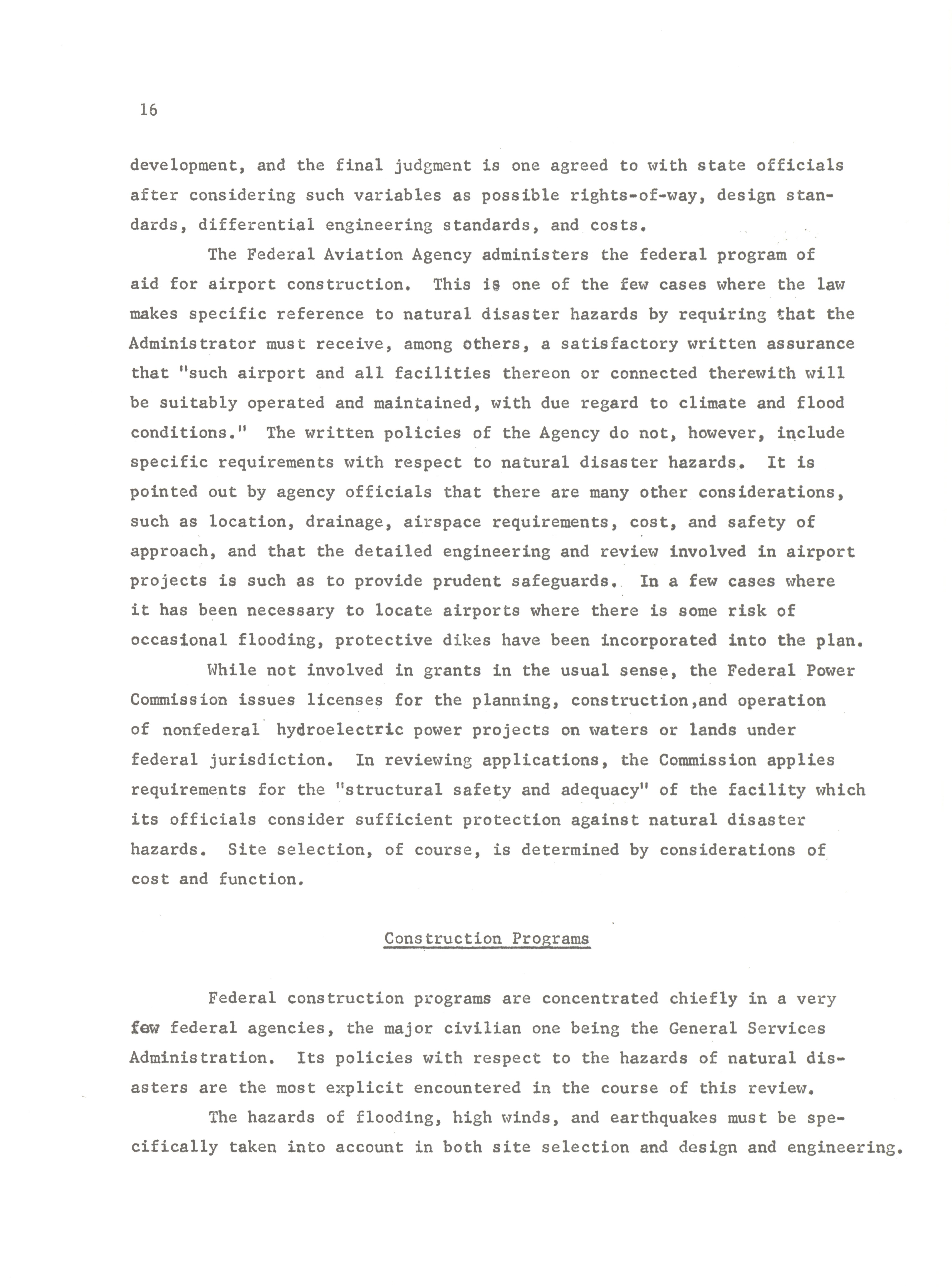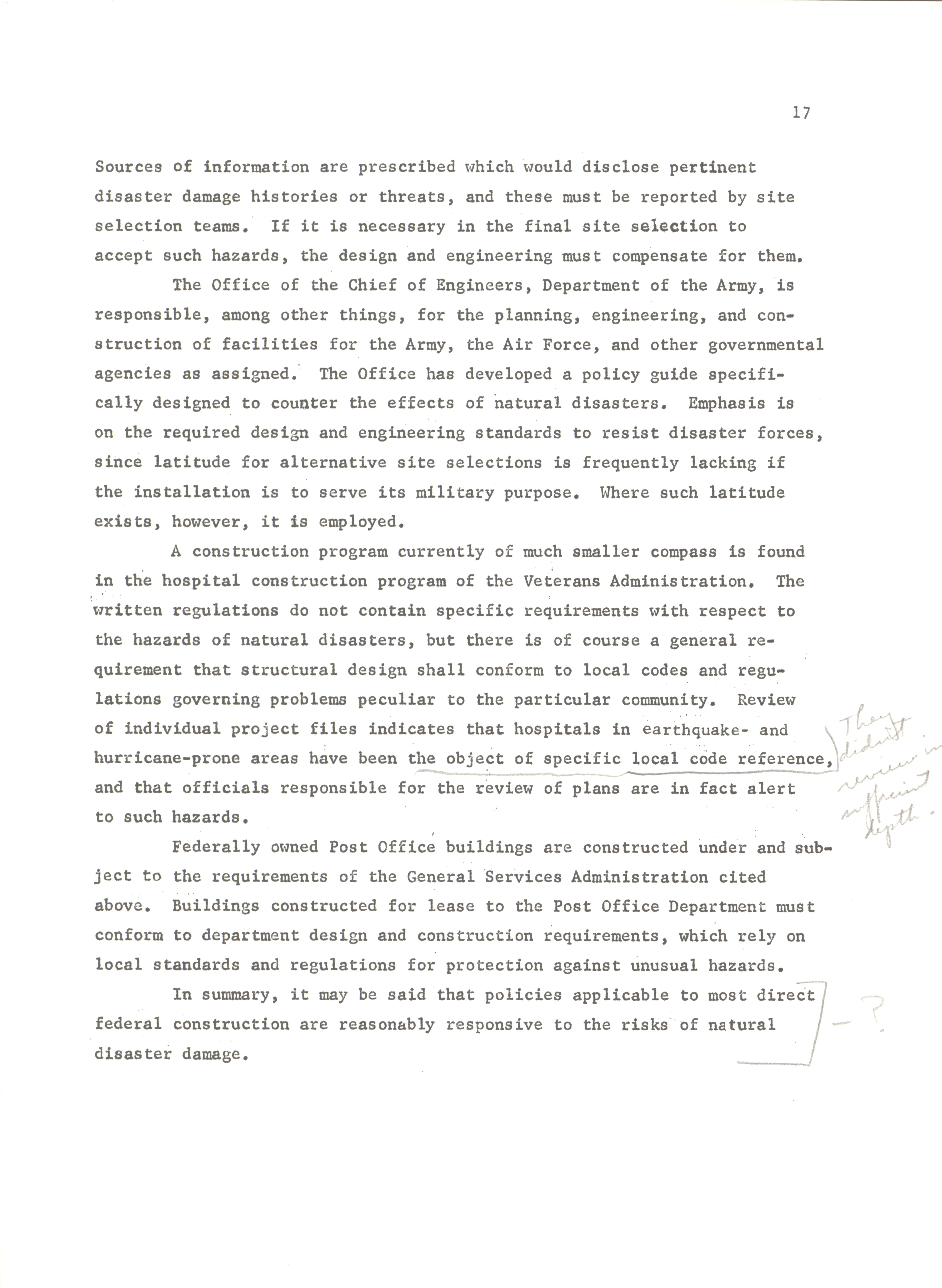 - "Report on a review of federal policy in grant, loan, and construction programs in areas of high risk of natural disaster damage", Dwight Ink Collection, Iowa State University Library Digital Collections