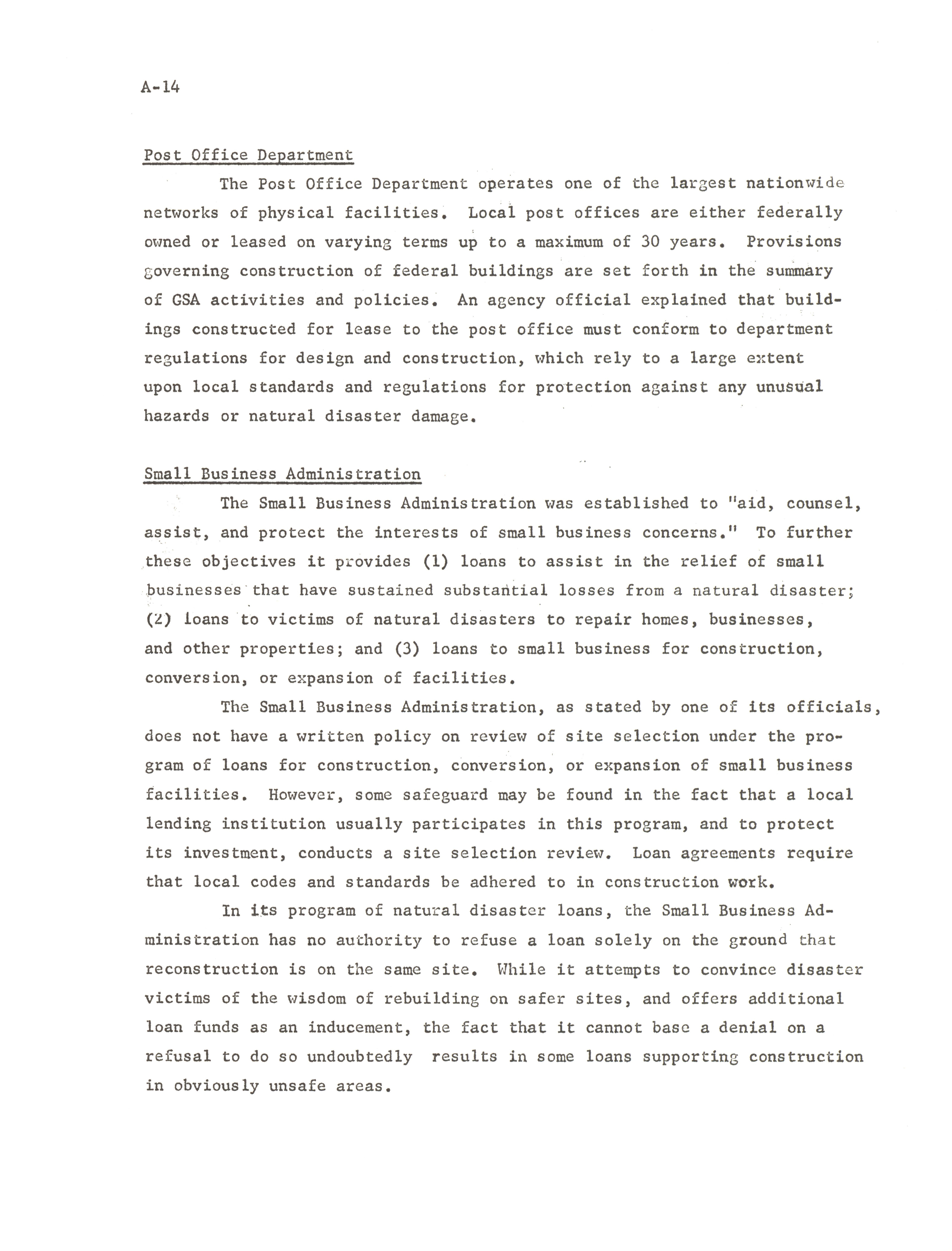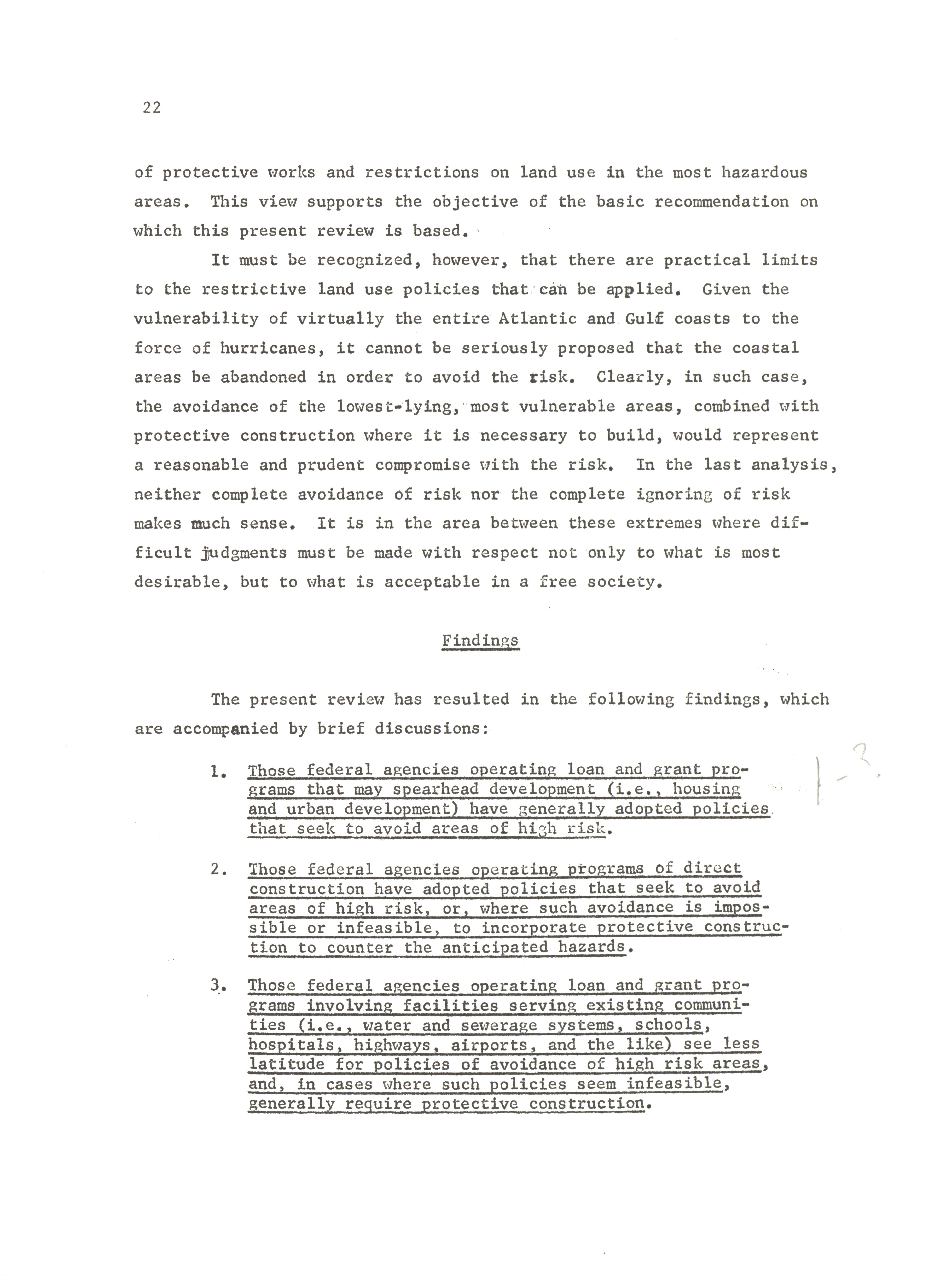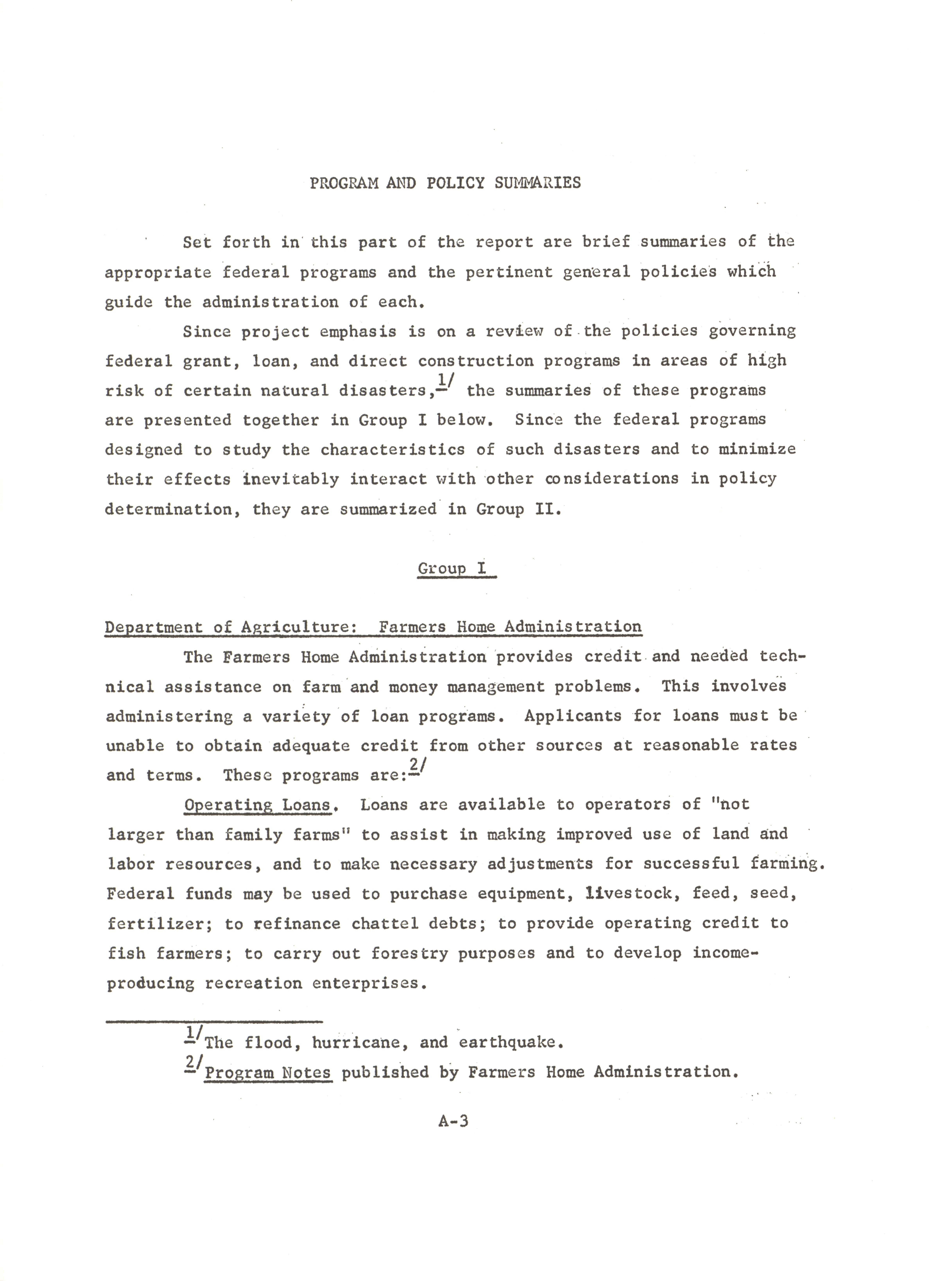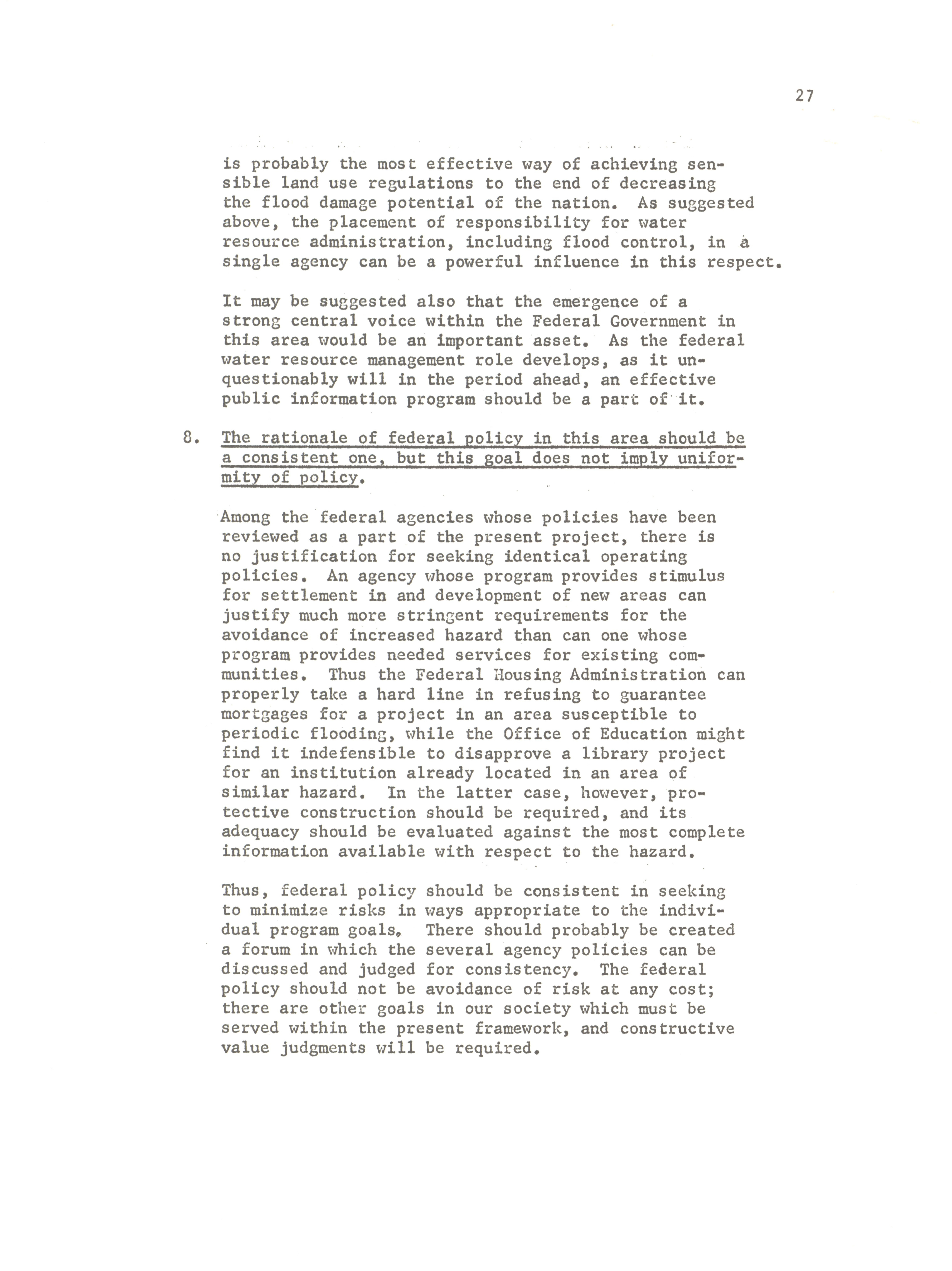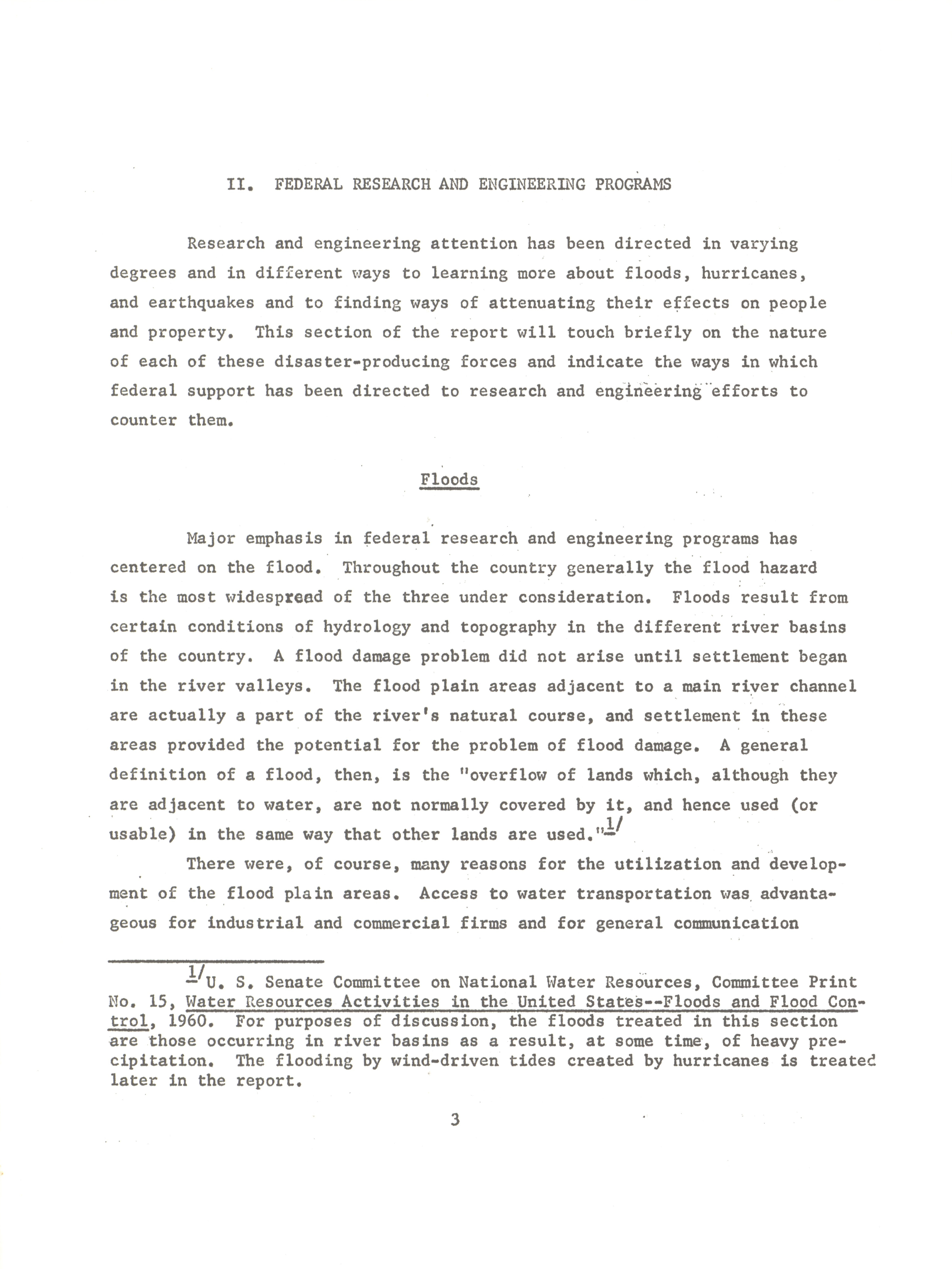 - "Report on a review of federal policy in grant, loan, and construction programs in areas of high risk of natural disaster damage", Dwight Ink Collection, Iowa State University Library Digital Collections