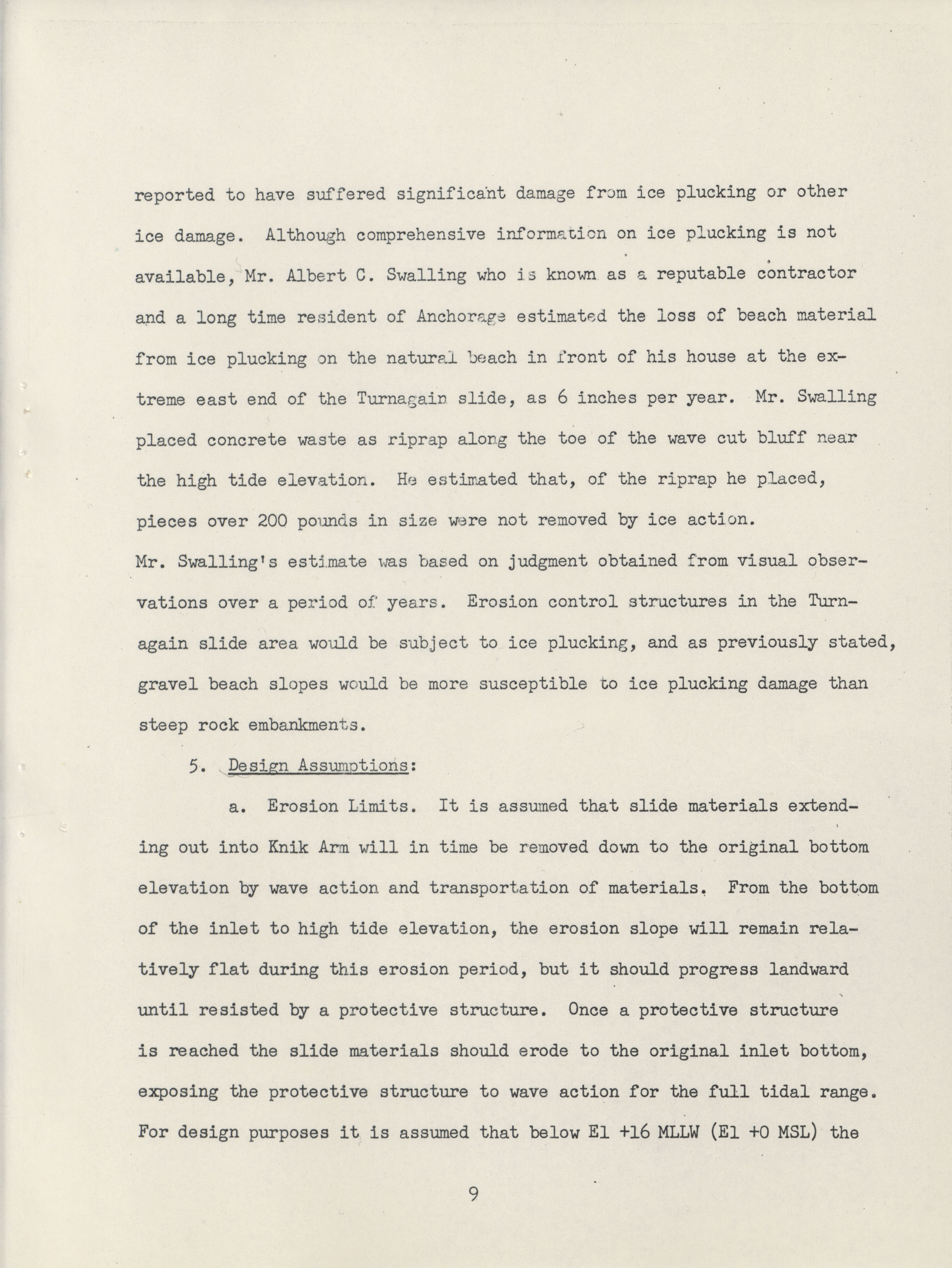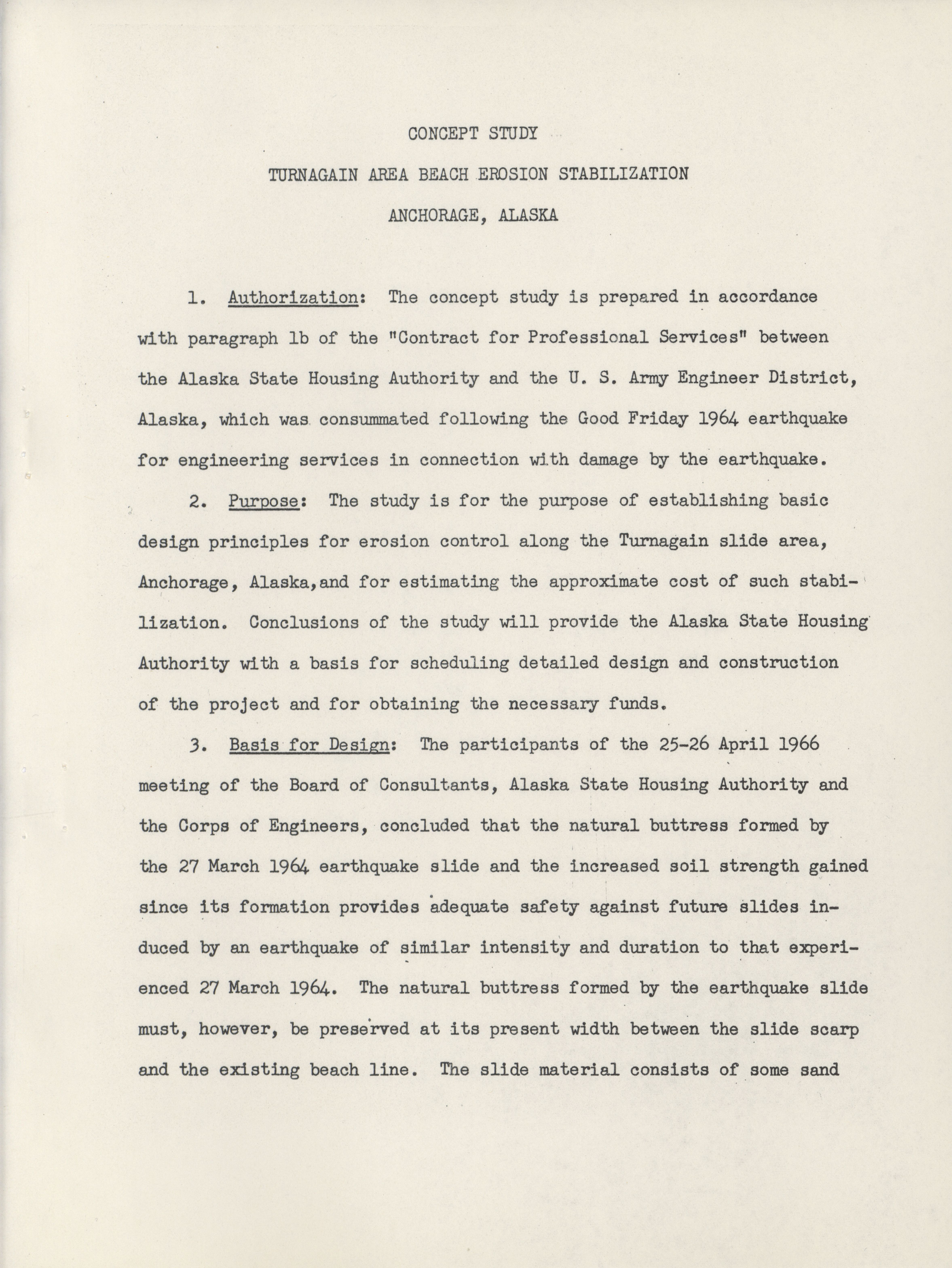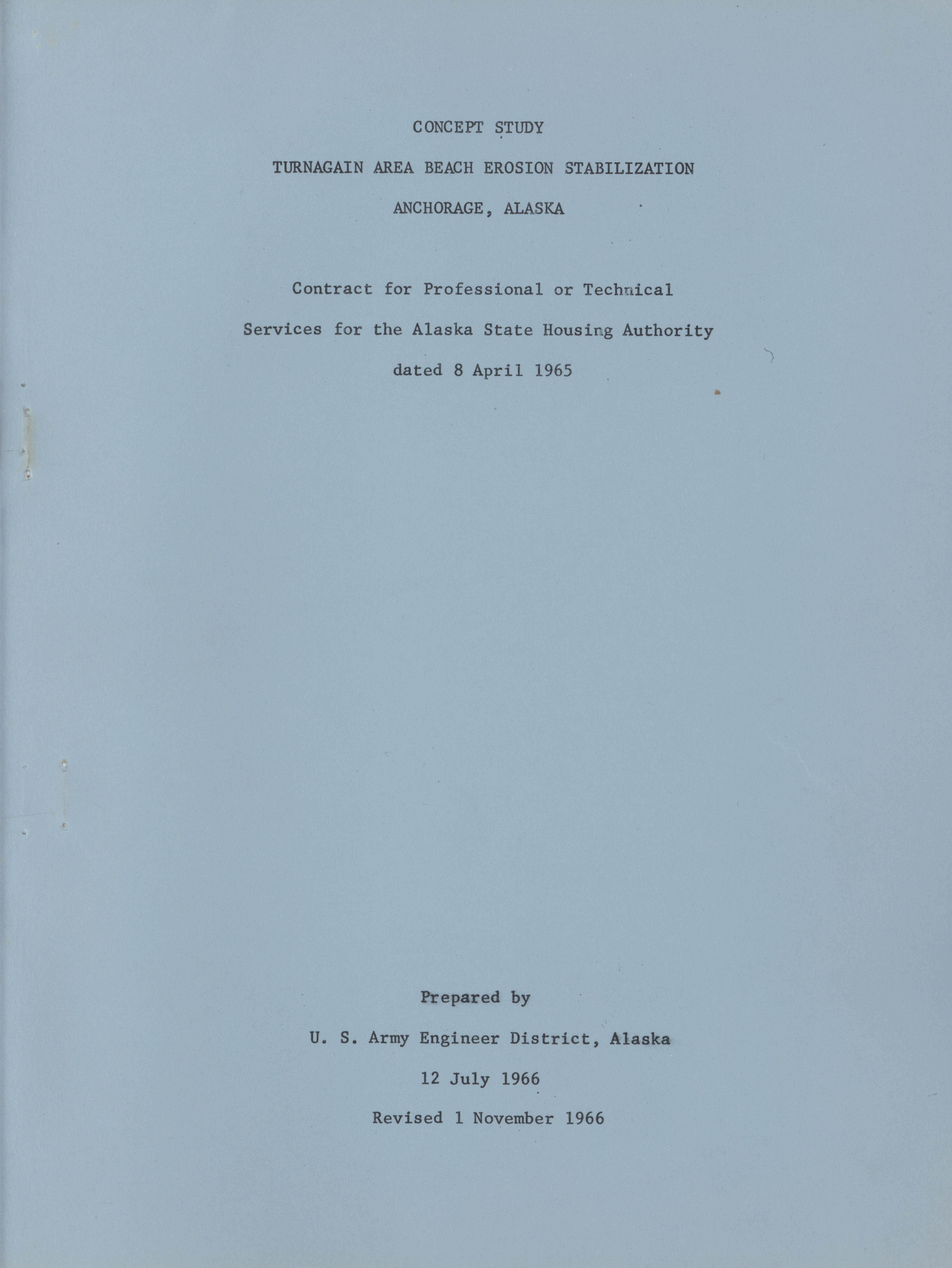 - U.S. Army Corps of Engineers. "Concept Study: Turnagain Beach Erosion Stabilization," report, 1966