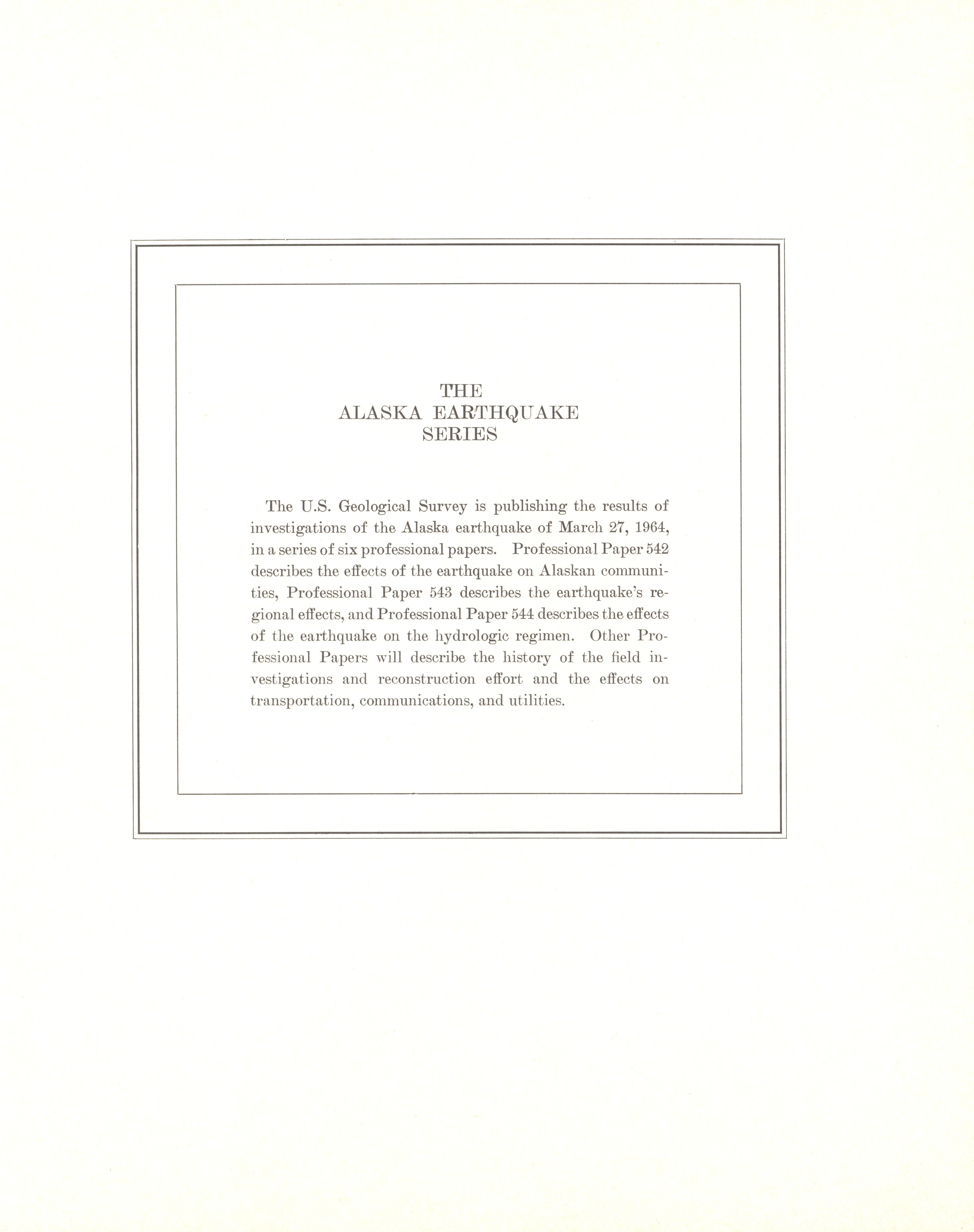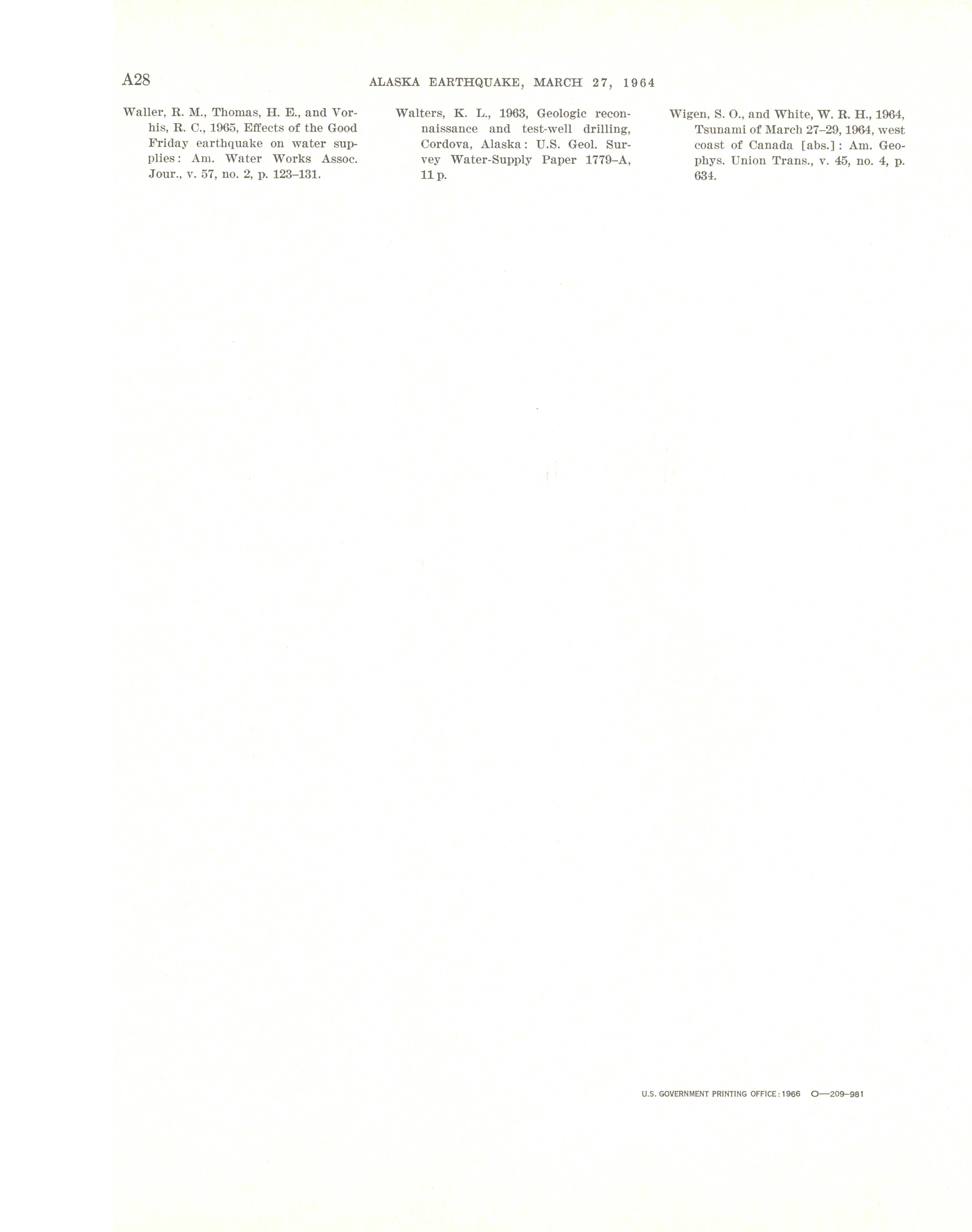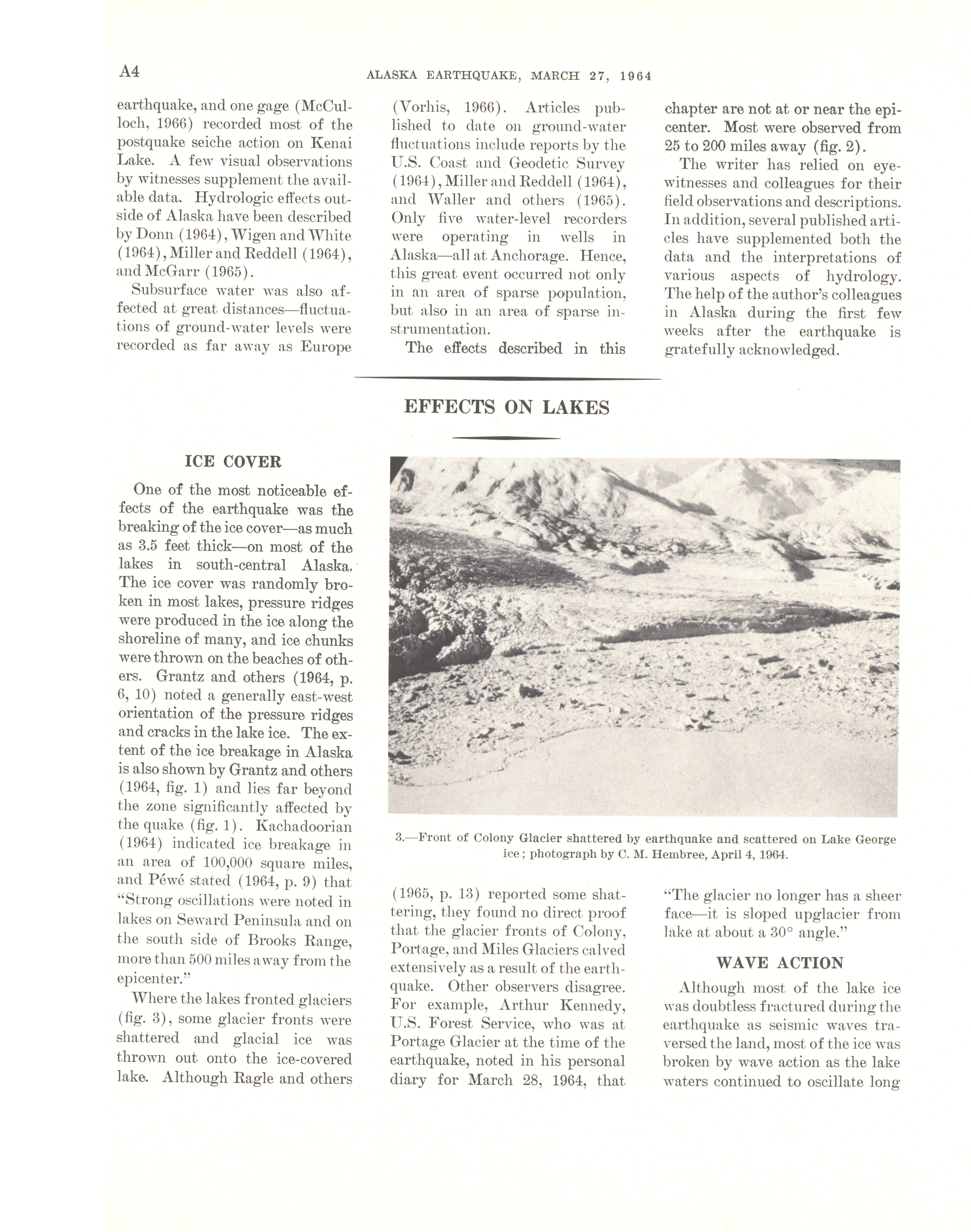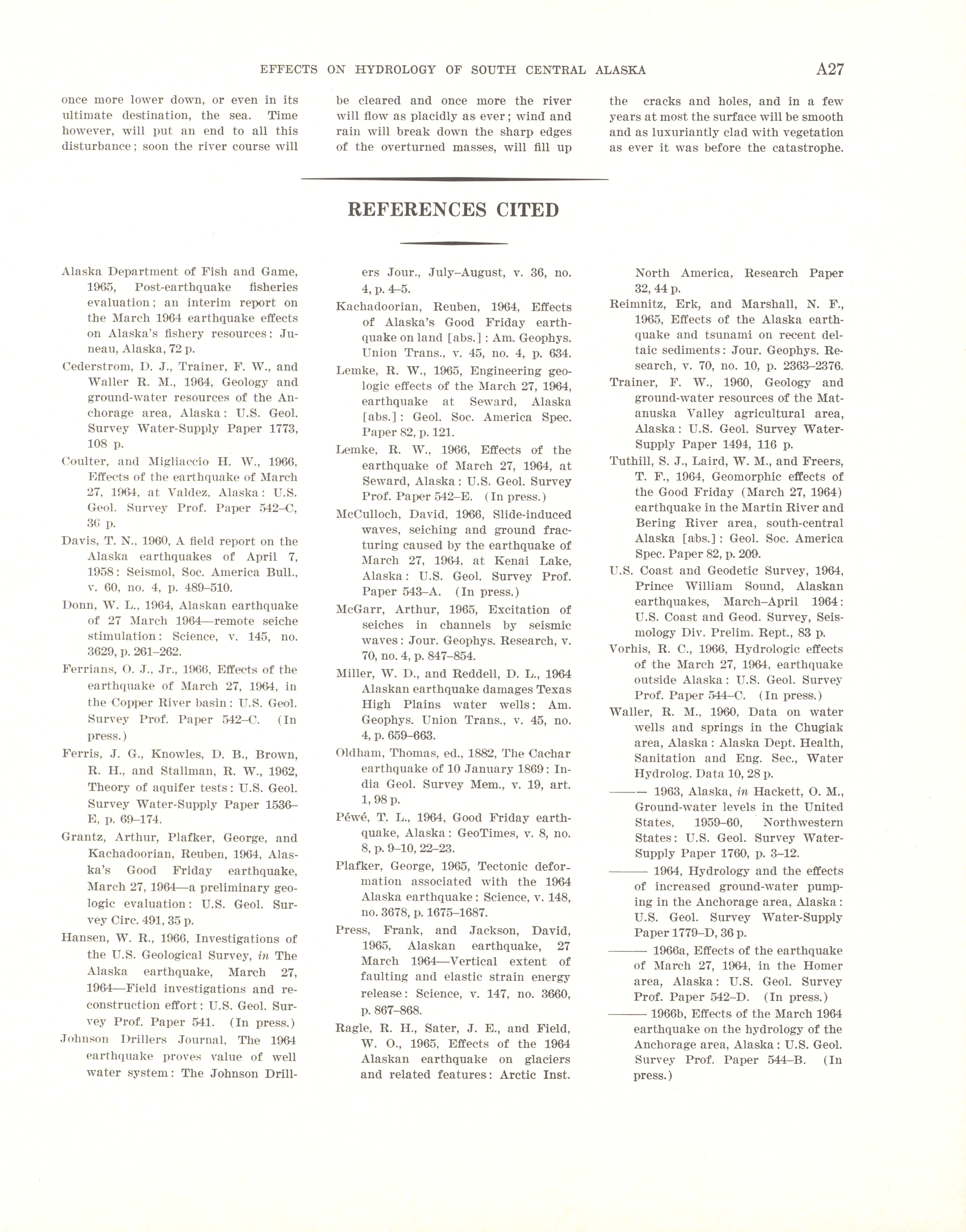 - "The Alaska earthquake, March 27, 1964: effects on hydrologic regimen. South-central Alaska", Dwight Ink Collection, Iowa State University Library Digital Collections