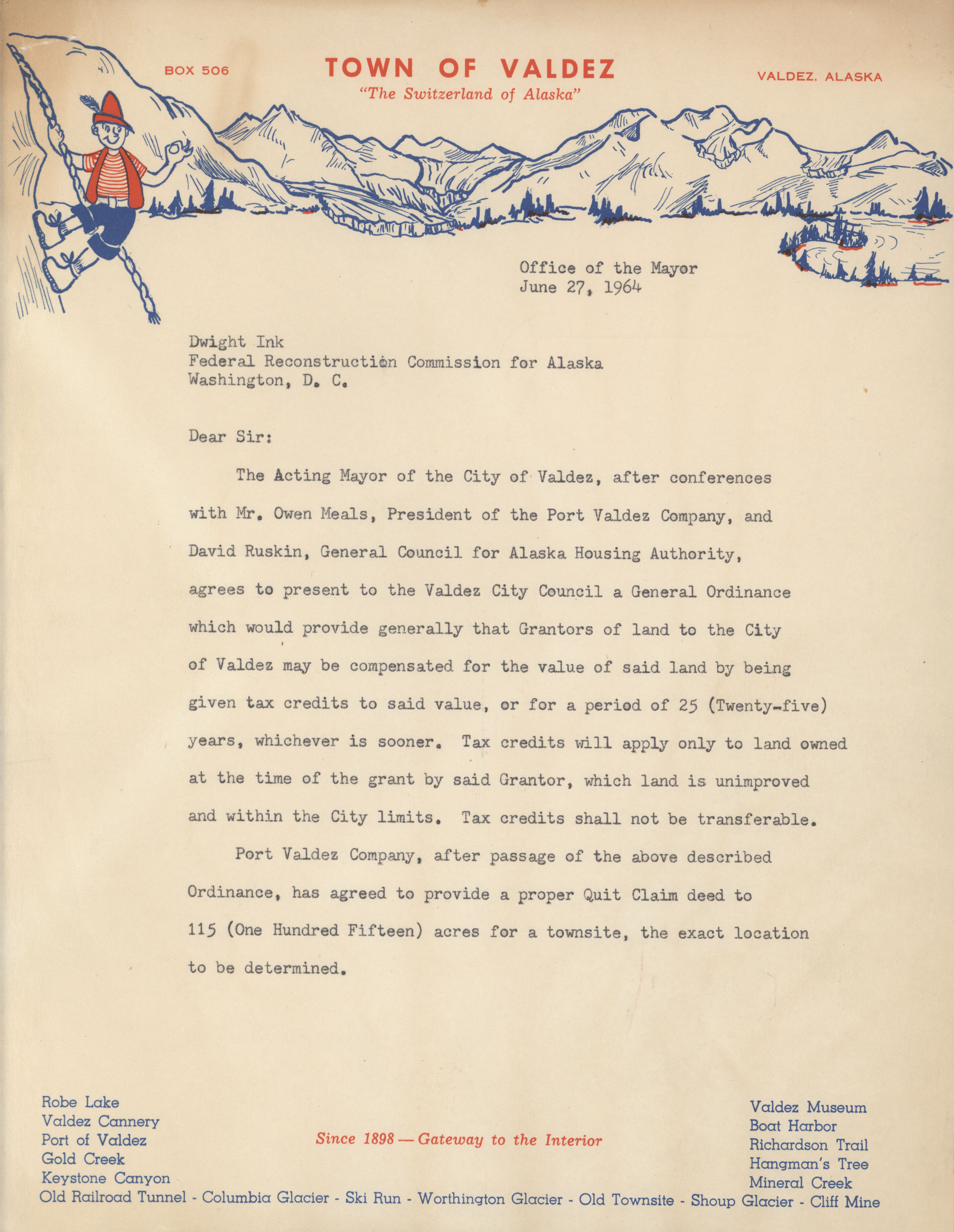 - Valdez reconstruction correspondence, memorandums, and costs, 1964-1965