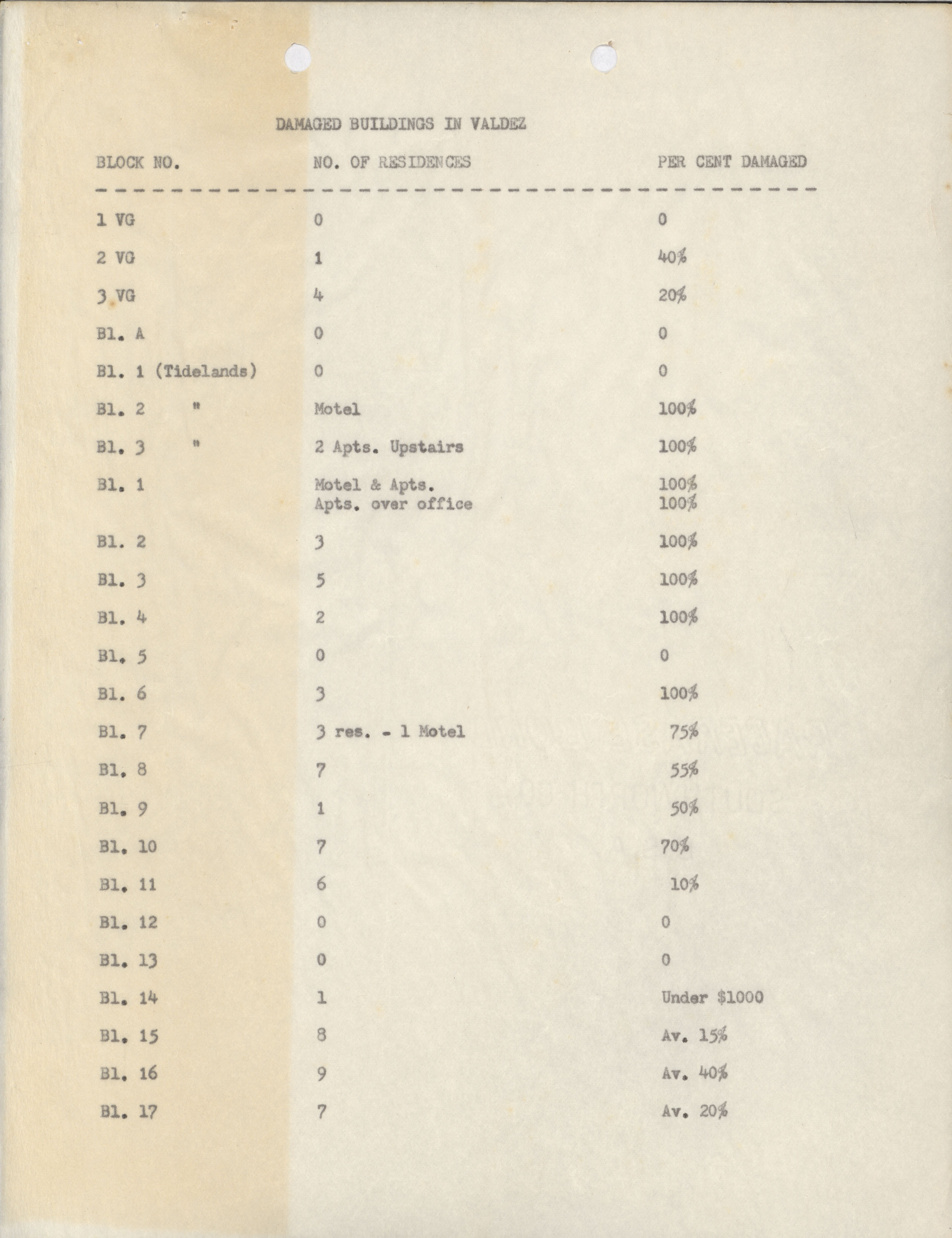 - "Damaged buildings in Valdez", Dwight Ink Collection, Iowa State University Library Digital Collections