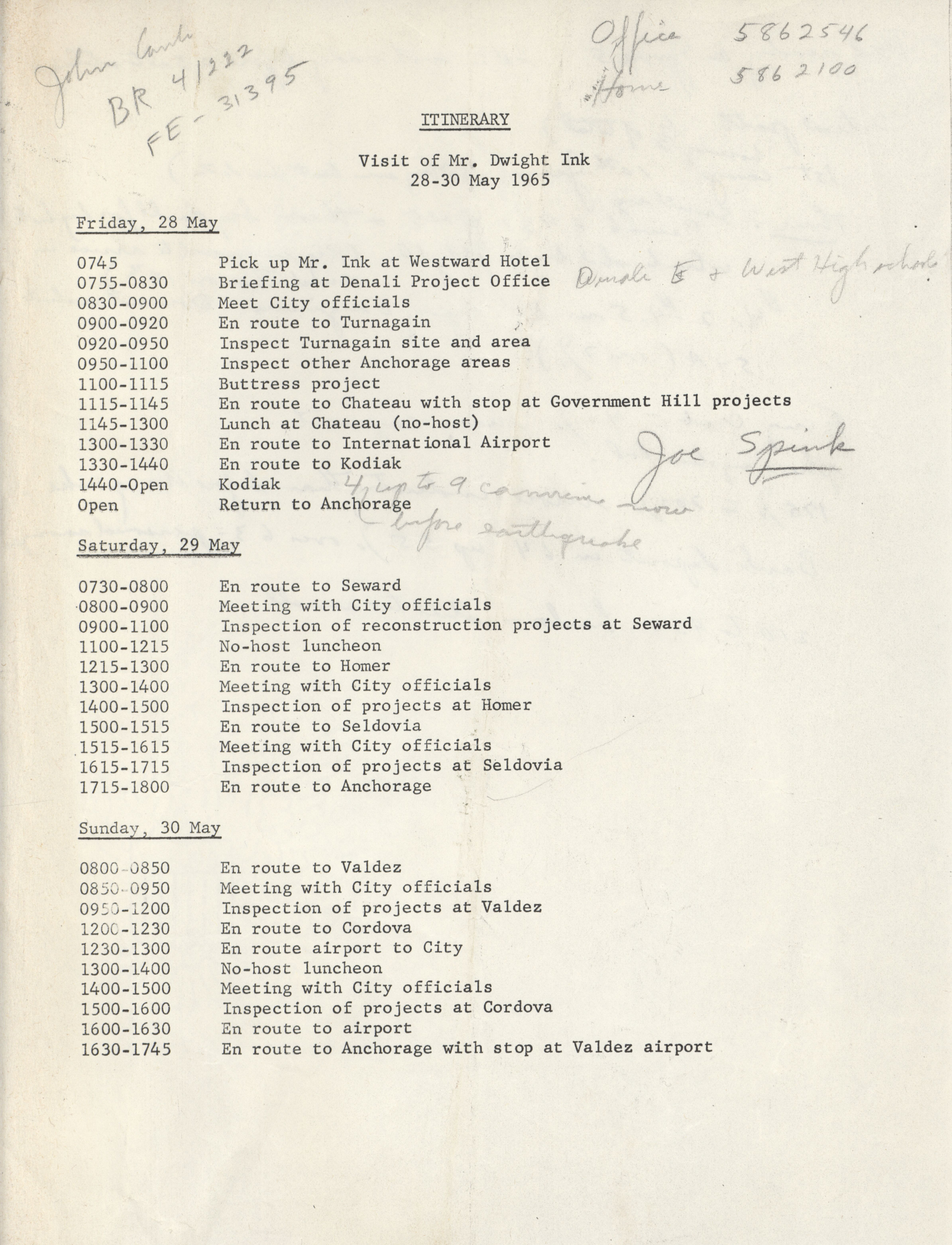 Itinerary: visit of Mr. Dwight Ink, 28-30 May, 1965 Item Info