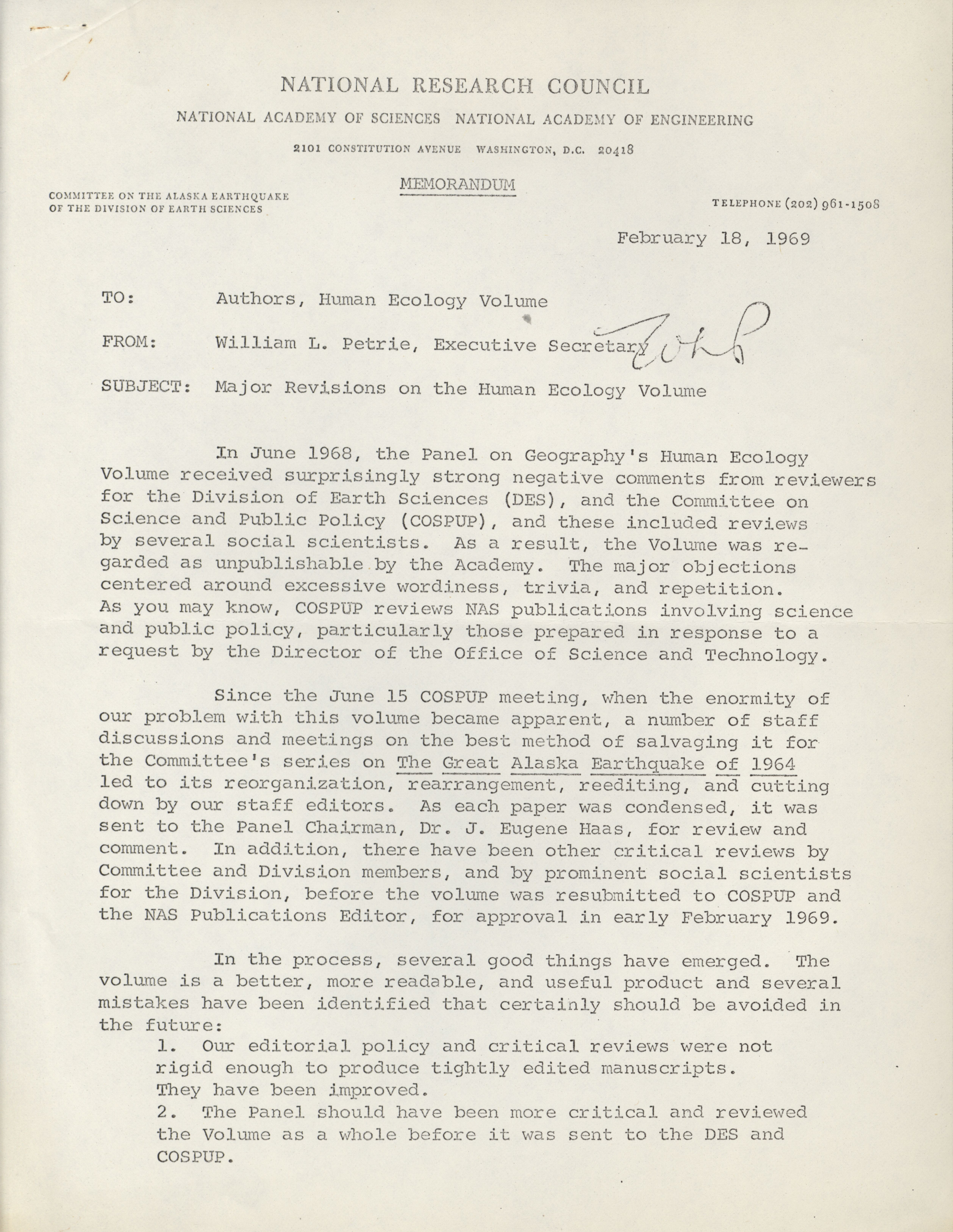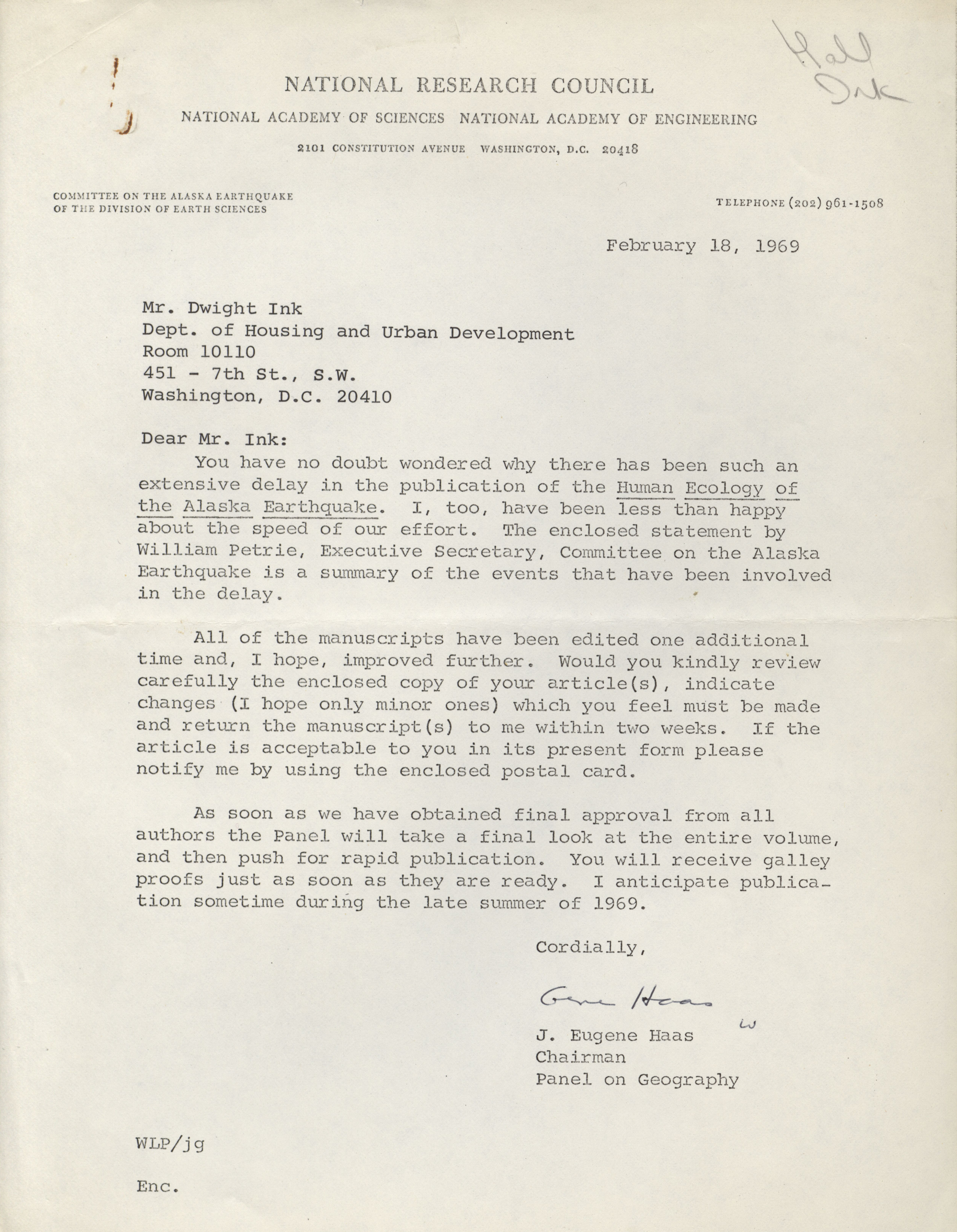- Writings: Ink, Dwight. "Federal Reconstruction and Development Planning Commission for Alaska," for National Academy of Sciences, 1966-1969 circa