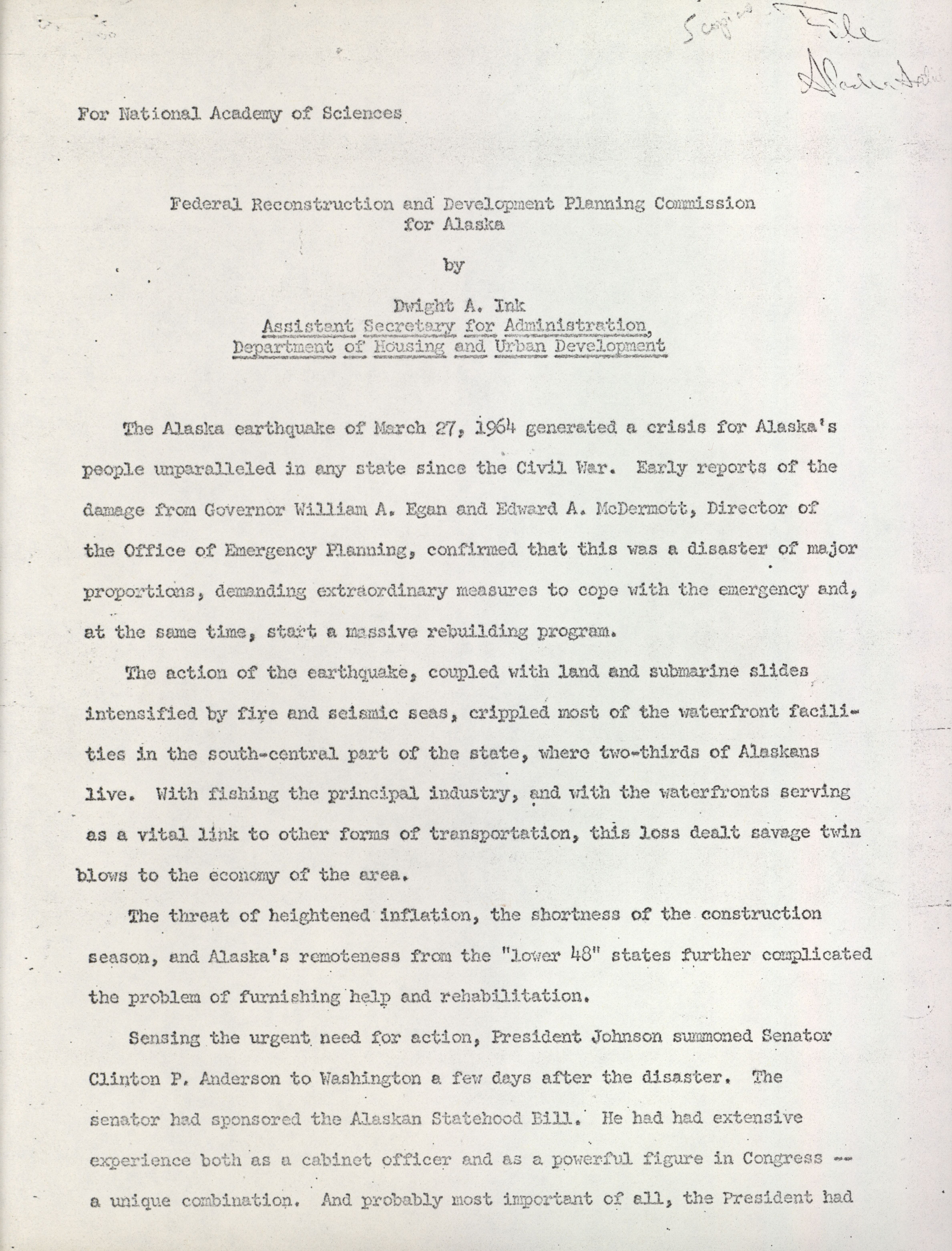 - Writings: Ink, Dwight. "Federal Reconstruction and Development Planning Commission for Alaska," for National Academy of Sciences, 1966-1969 circa