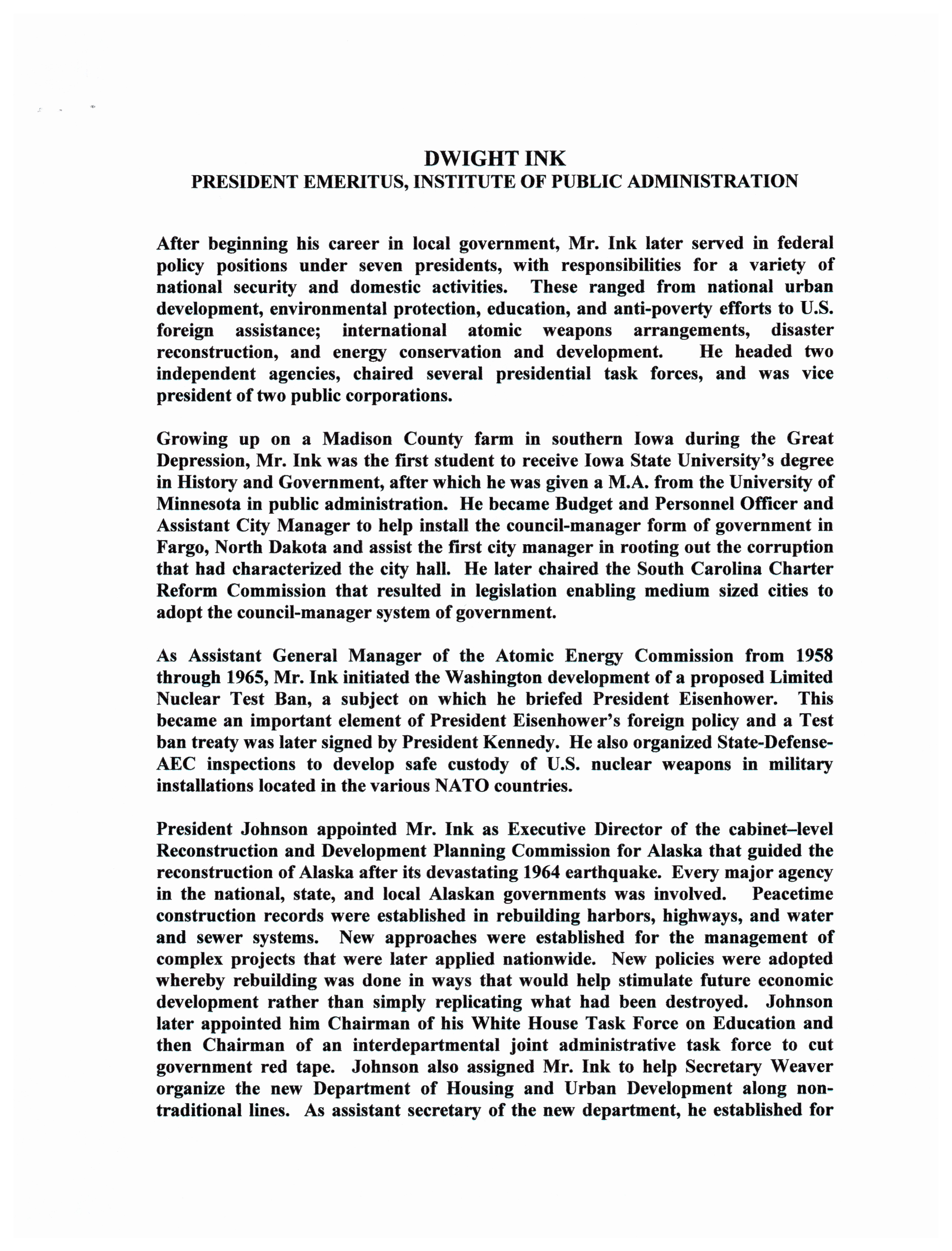 - "Dwight Ink: President Emeritus, Institute of Public Administration", Dwight Ink Collection, Iowa State University Library Digital Collections