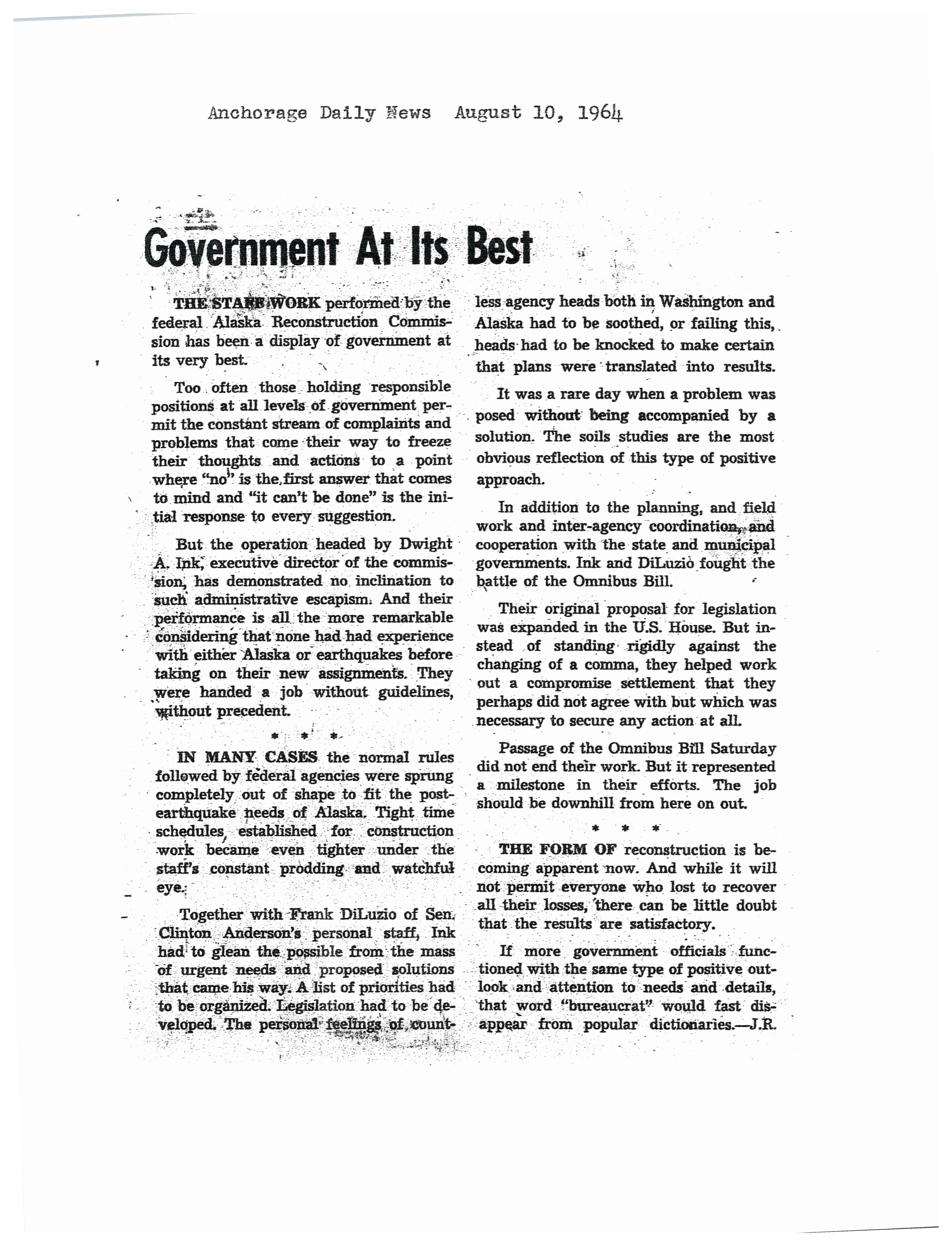 - Writings: Ink, Dwight. Hurricane Katrina recovery in context of Alaska earthquake manuscripts and notes, 2005-2010 circa