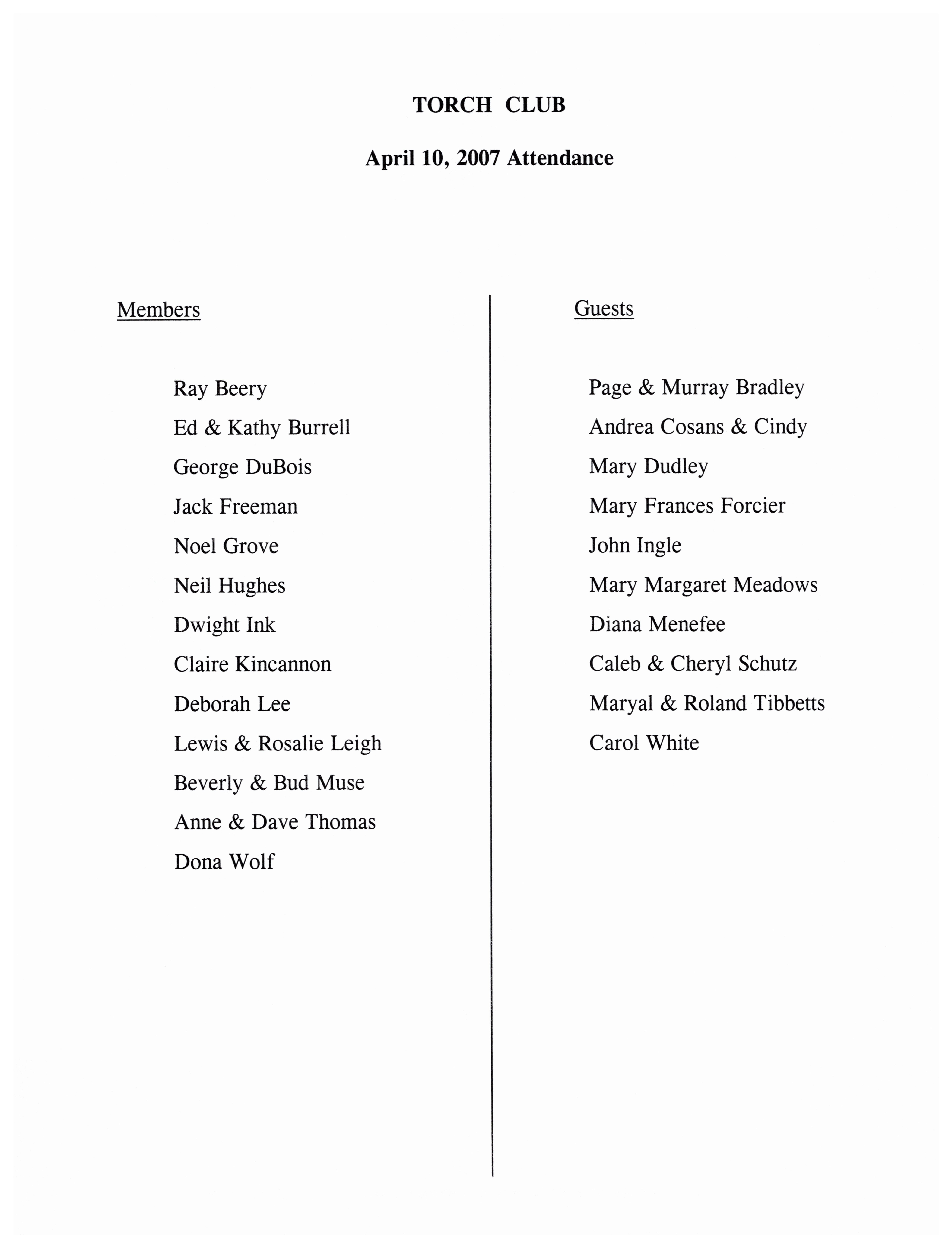 - "Torch Club April 10, 2007 attendance", Dwight Ink Collection, Iowa State University Library Digital Collections