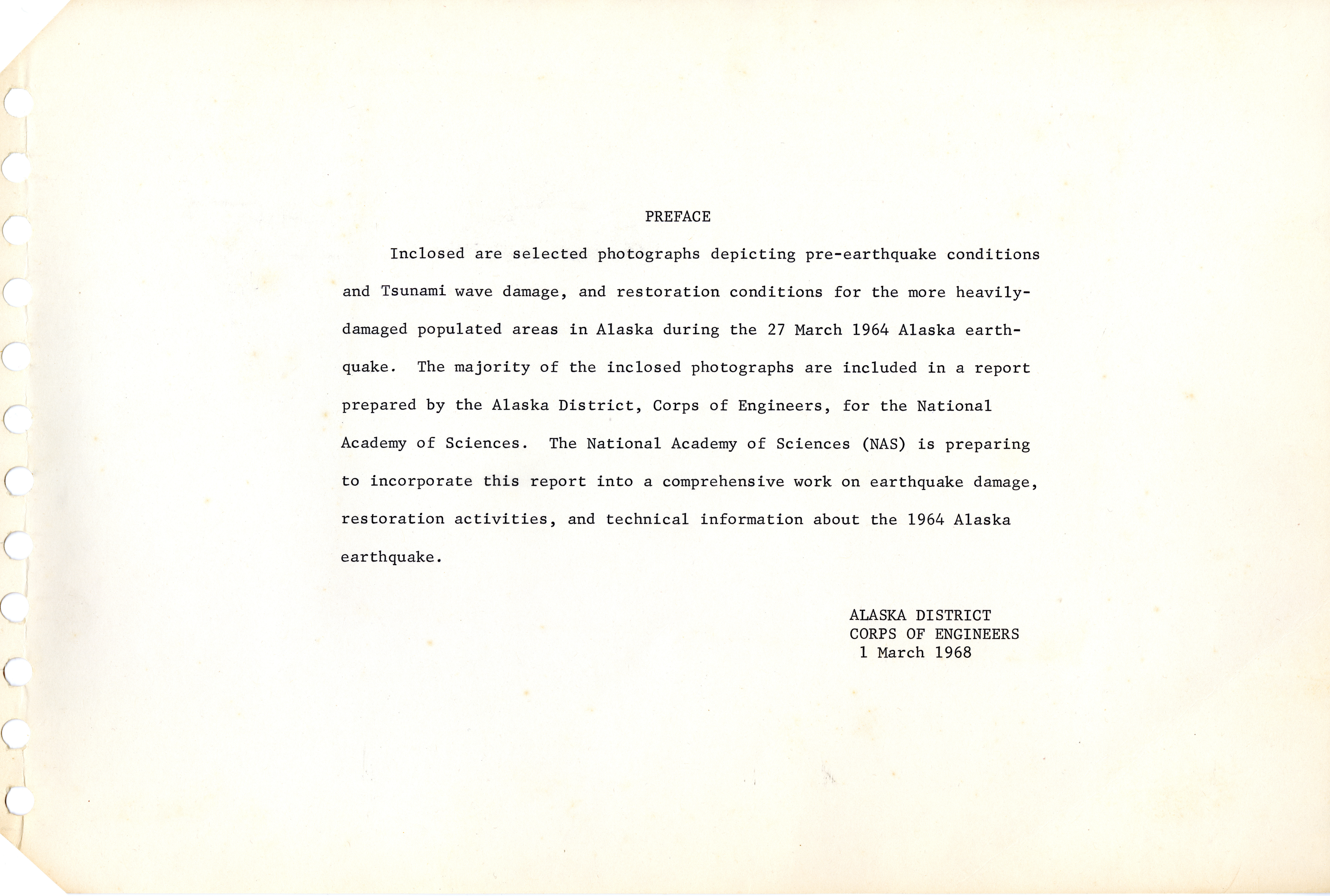 - Annotation: Preface: Inclosed are selected photographs depicting pre-earthquake conditions and tsunami wave damage, and restoration conditions for the more heavily damaged populated areas in Alaska during the 27 March 1964 Alaska earthquake. The majority of the inclosed photographs are included in a report prepared by the Alaska District, Corps of Engineers, for the National Academy of Sciences. The National Academy of Sciences (NAS) is preparing to incorporate this report into a comprehensive work on earthquake damage, restoration activities, and technical information about the 1964 Alaska earthquake. Alaska District. Corps of Engineers. 1 March 1968