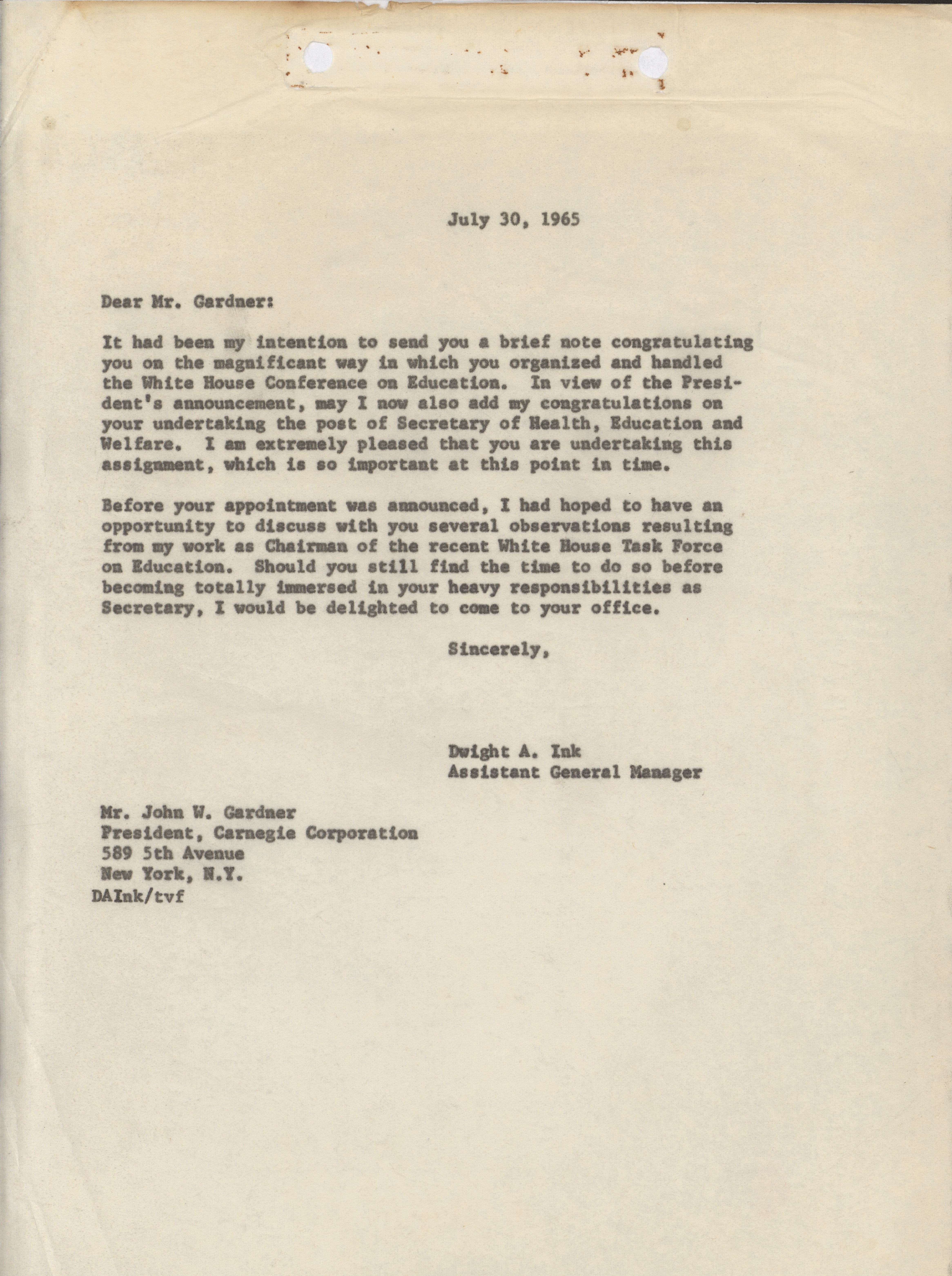 - Dwight A. Ink letter to John W. Gardner, July 30, 1965