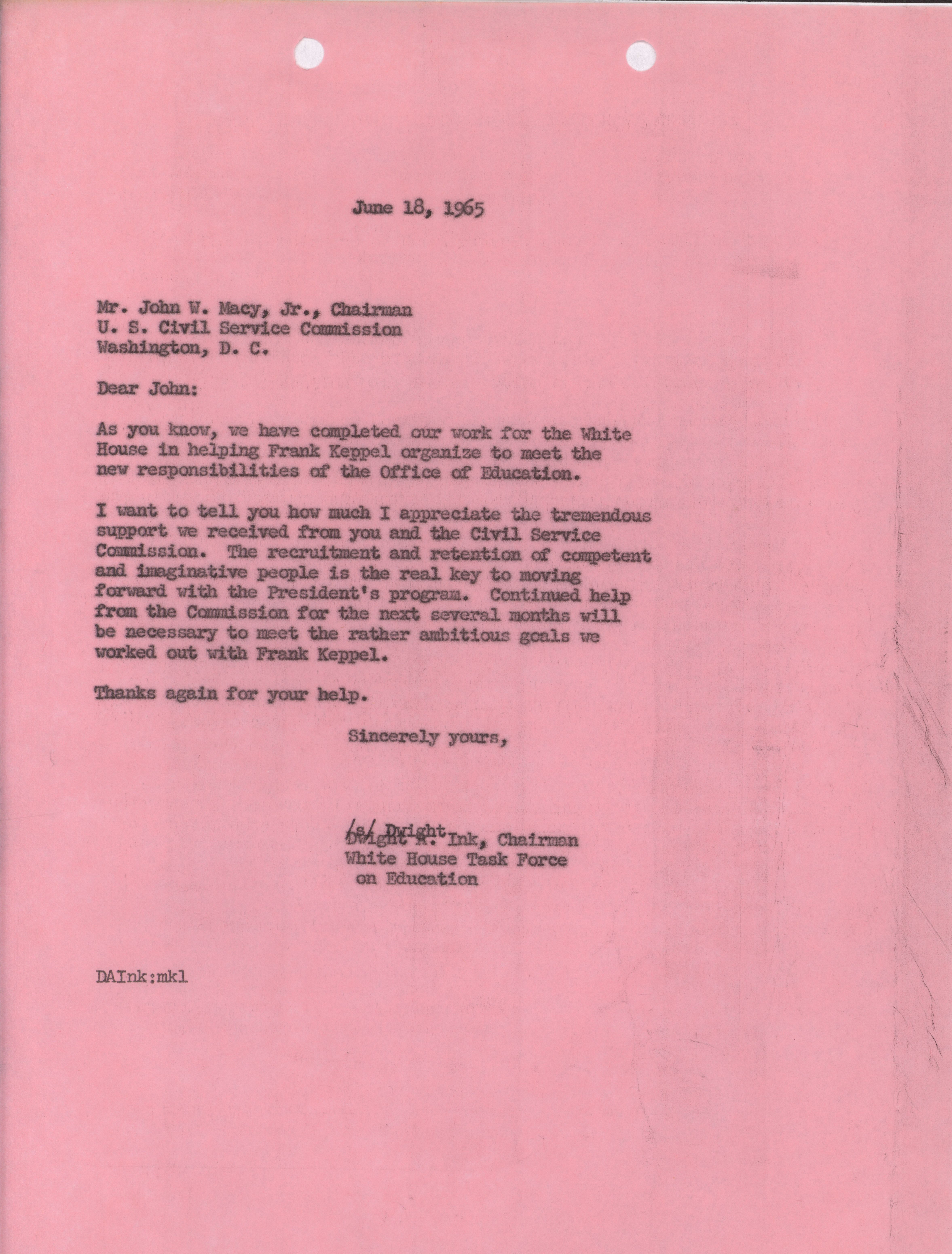 - Dwight A. Ink letter to John W. Macy, June 18, 1965
