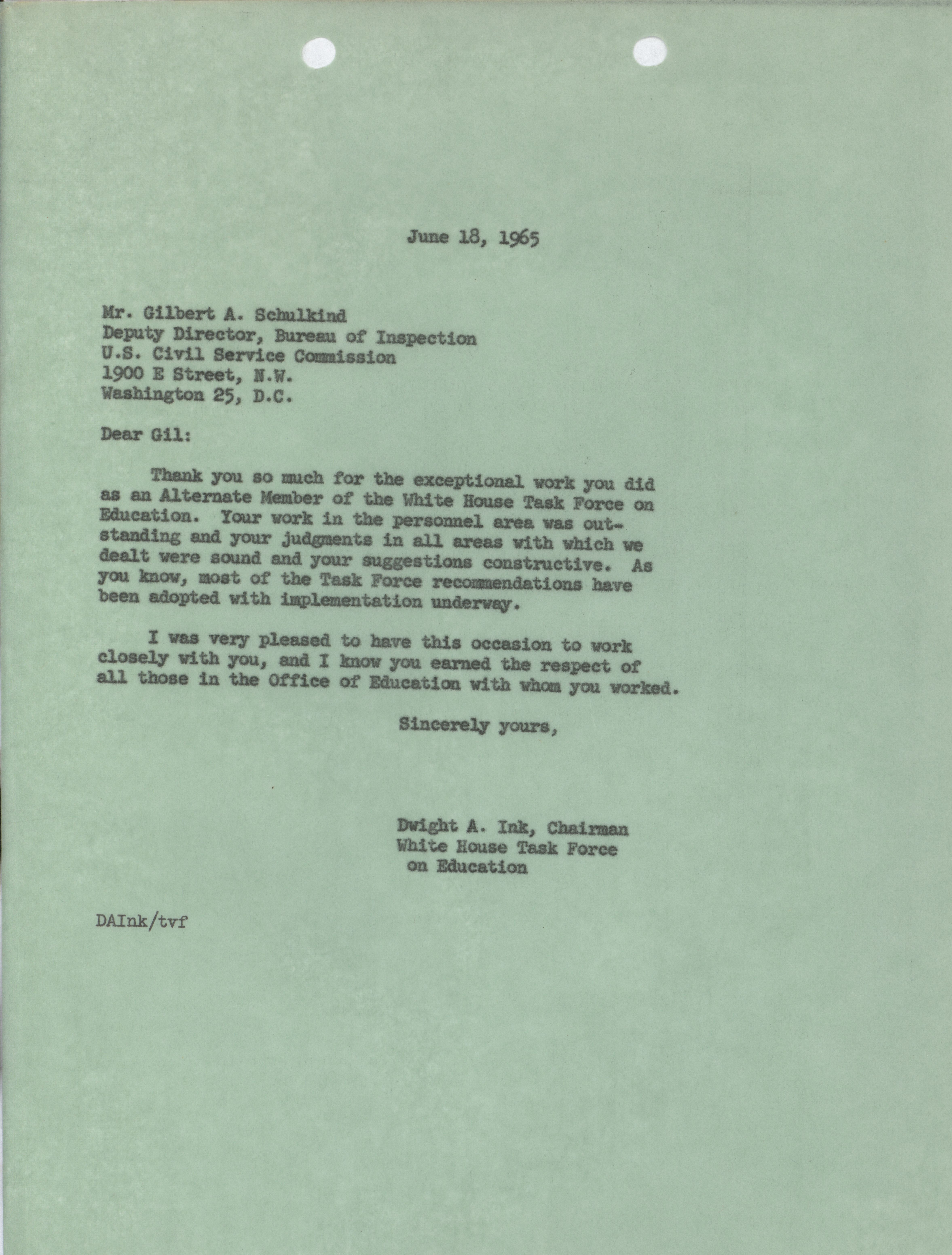 - Dwight A. Ink letter to Gilbert A. Schulkind, June 18, 1965