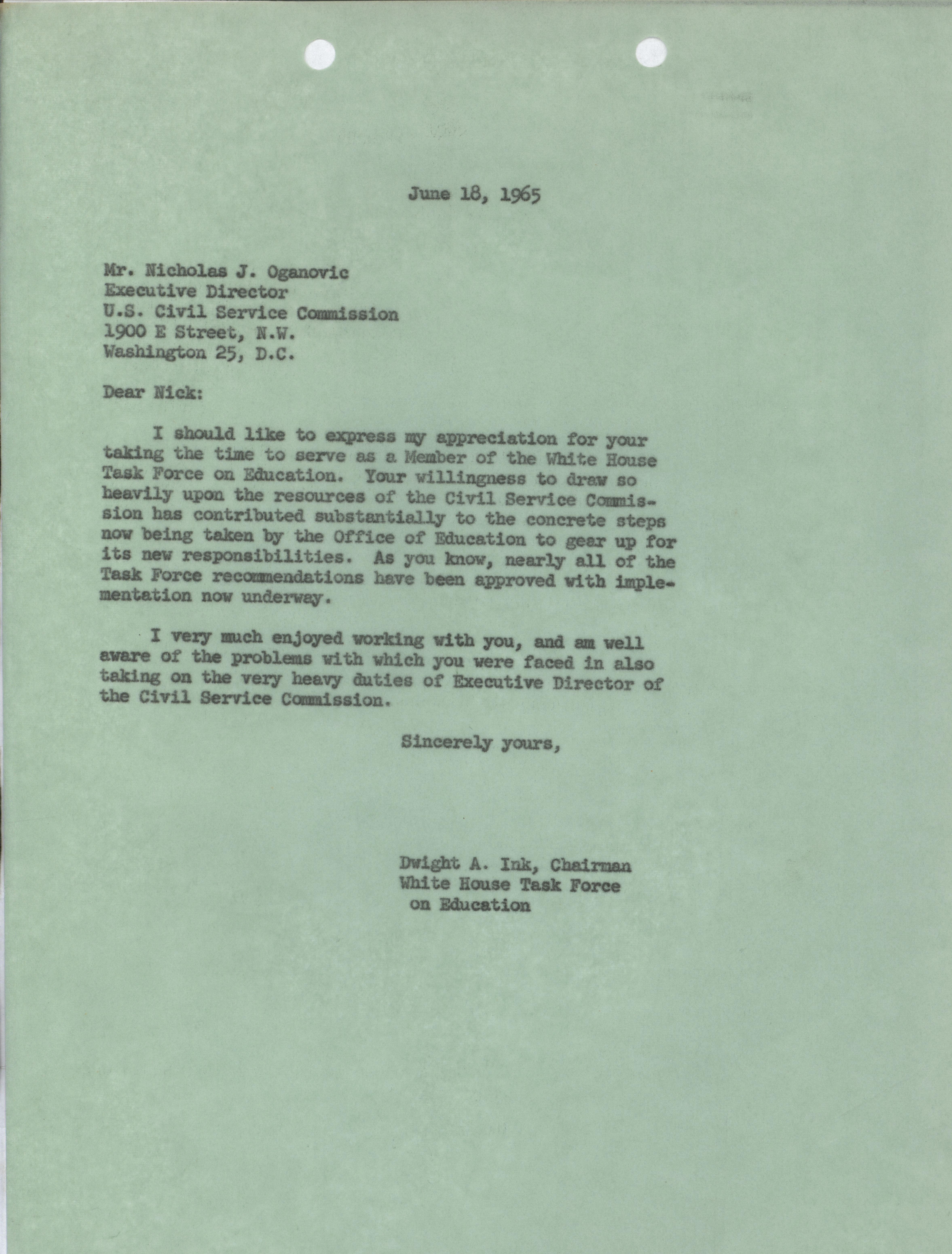 - Dwight A. Ink letter to Nicholas J. Oganovic, June 18, 1965
