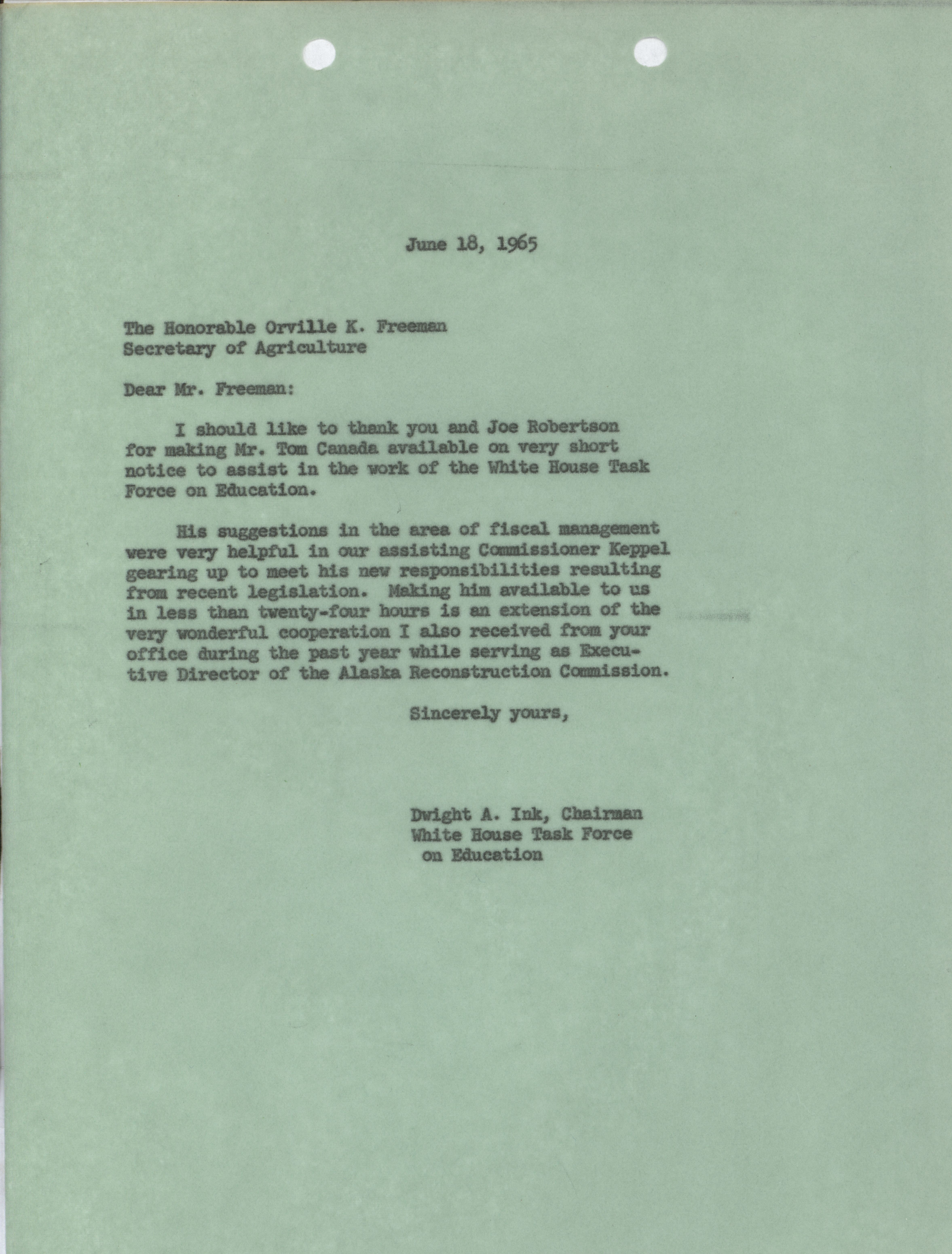 - Dwight A. Ink letter to Orville K. Freeman, June 18, 1965