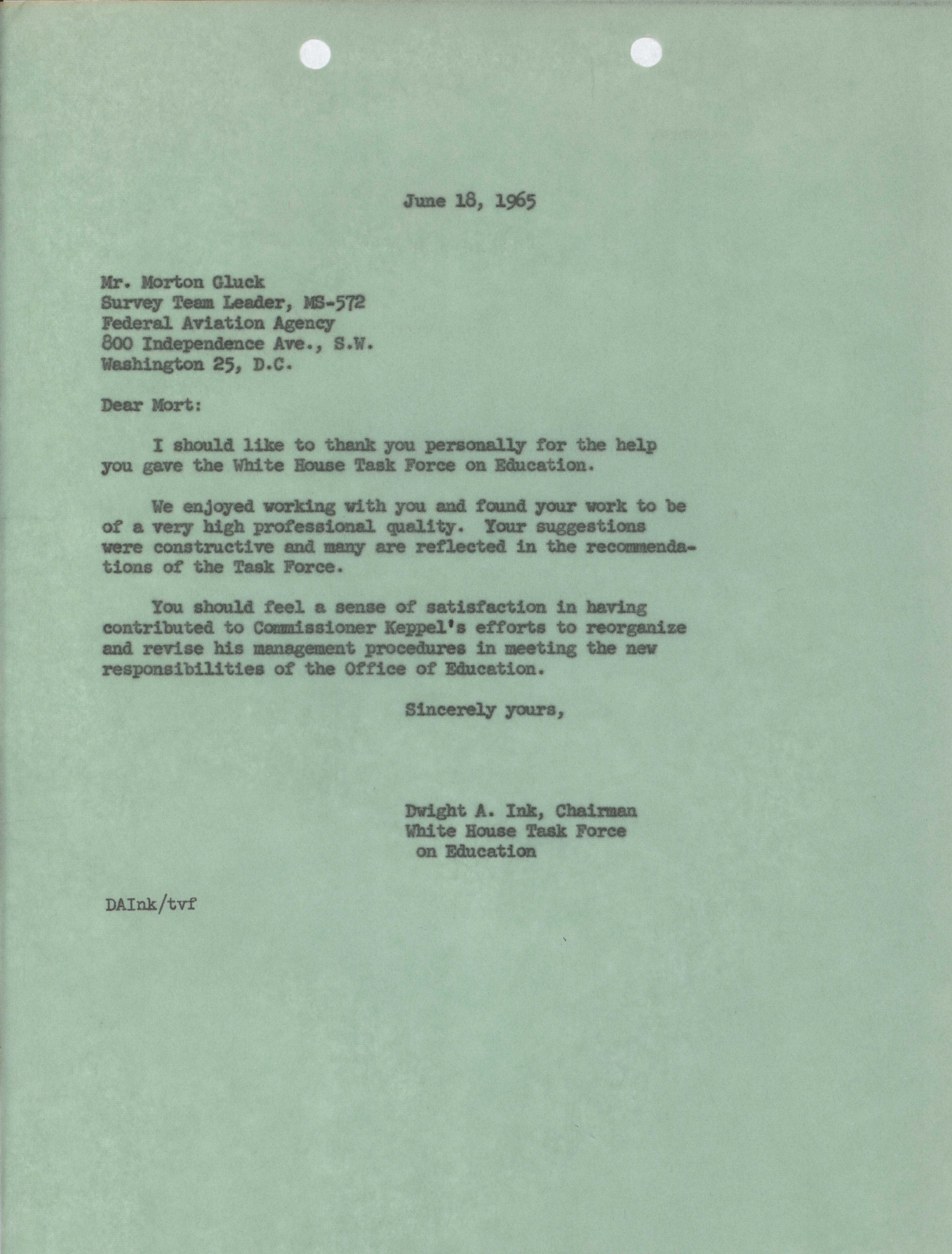 - Dwight A. Ink letter to Morton Gluck, June 18, 1965
