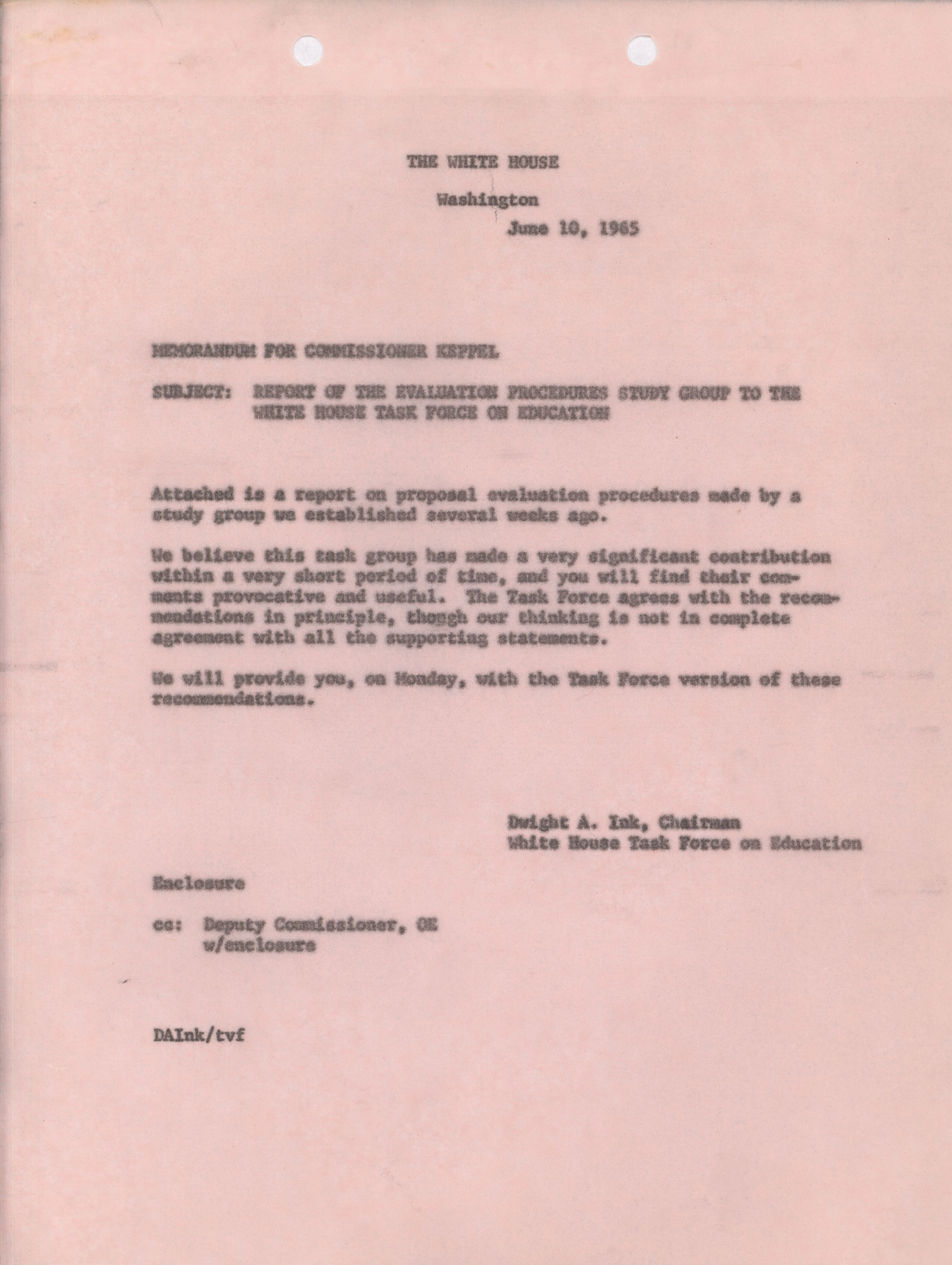 - Dwight A. Ink memorandum to Commissioner Keppel, June 10, 1965