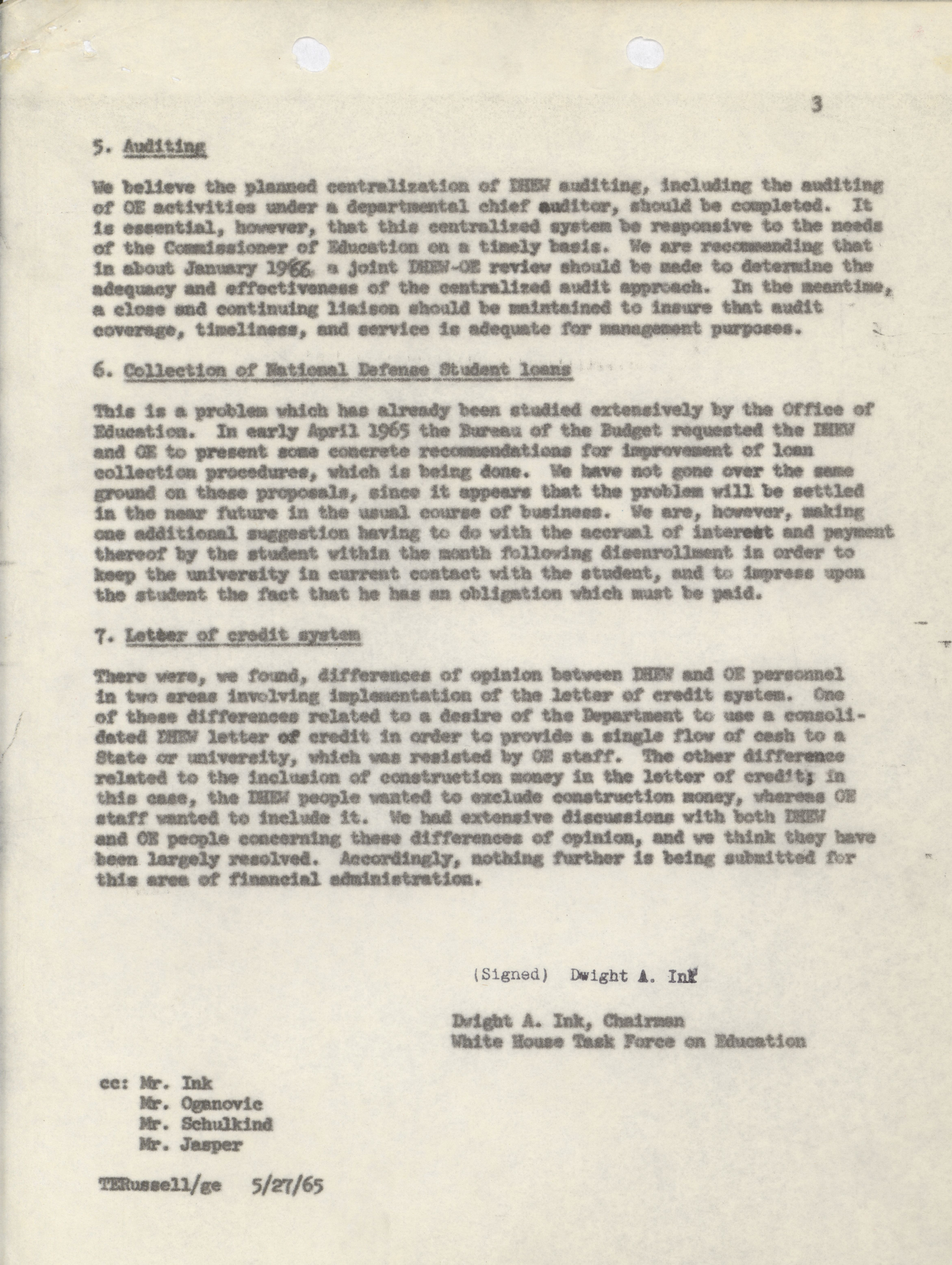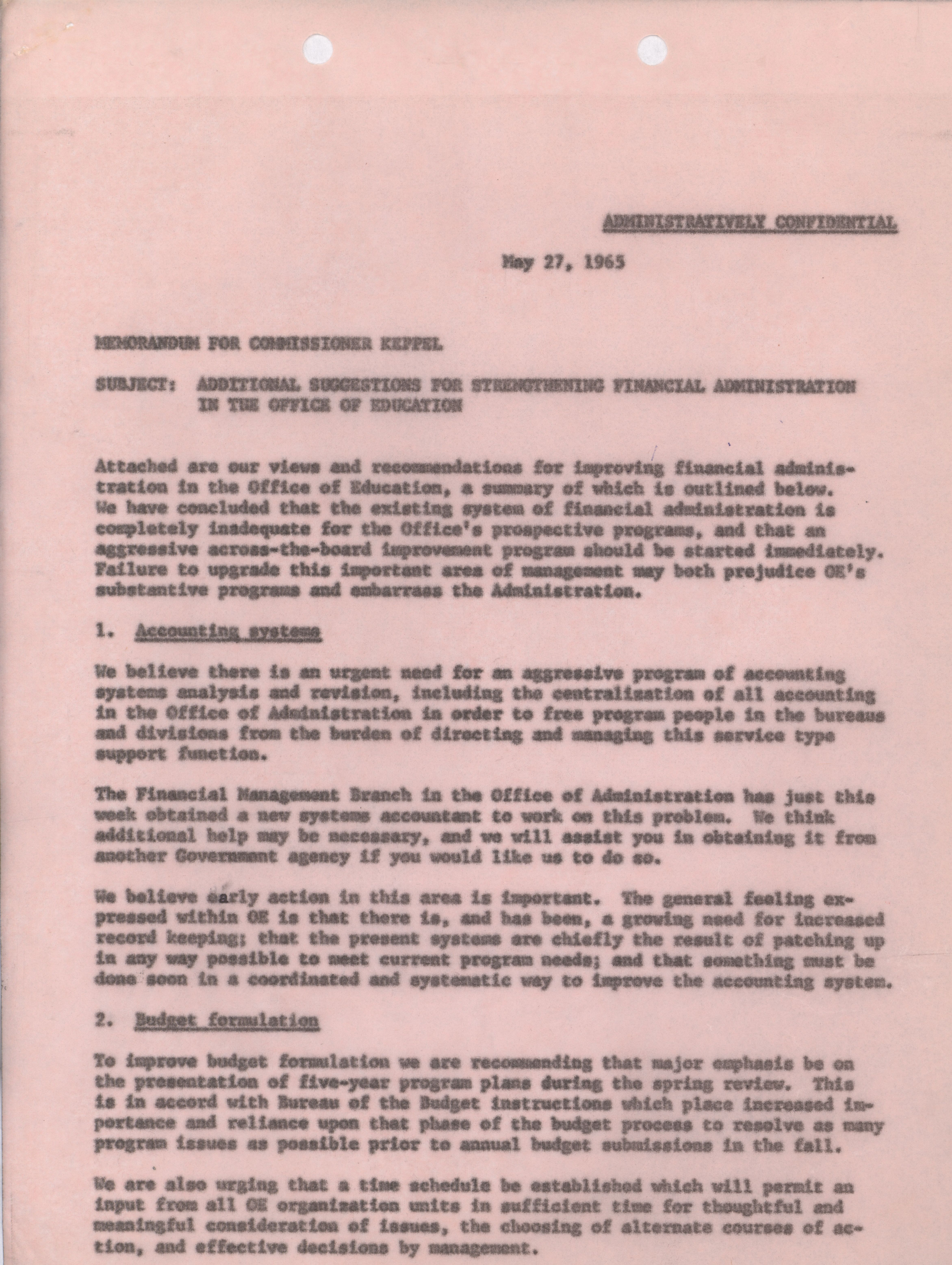 - Dwight A. Ink memorandum to Commissioner Keppel, May 27, 1965