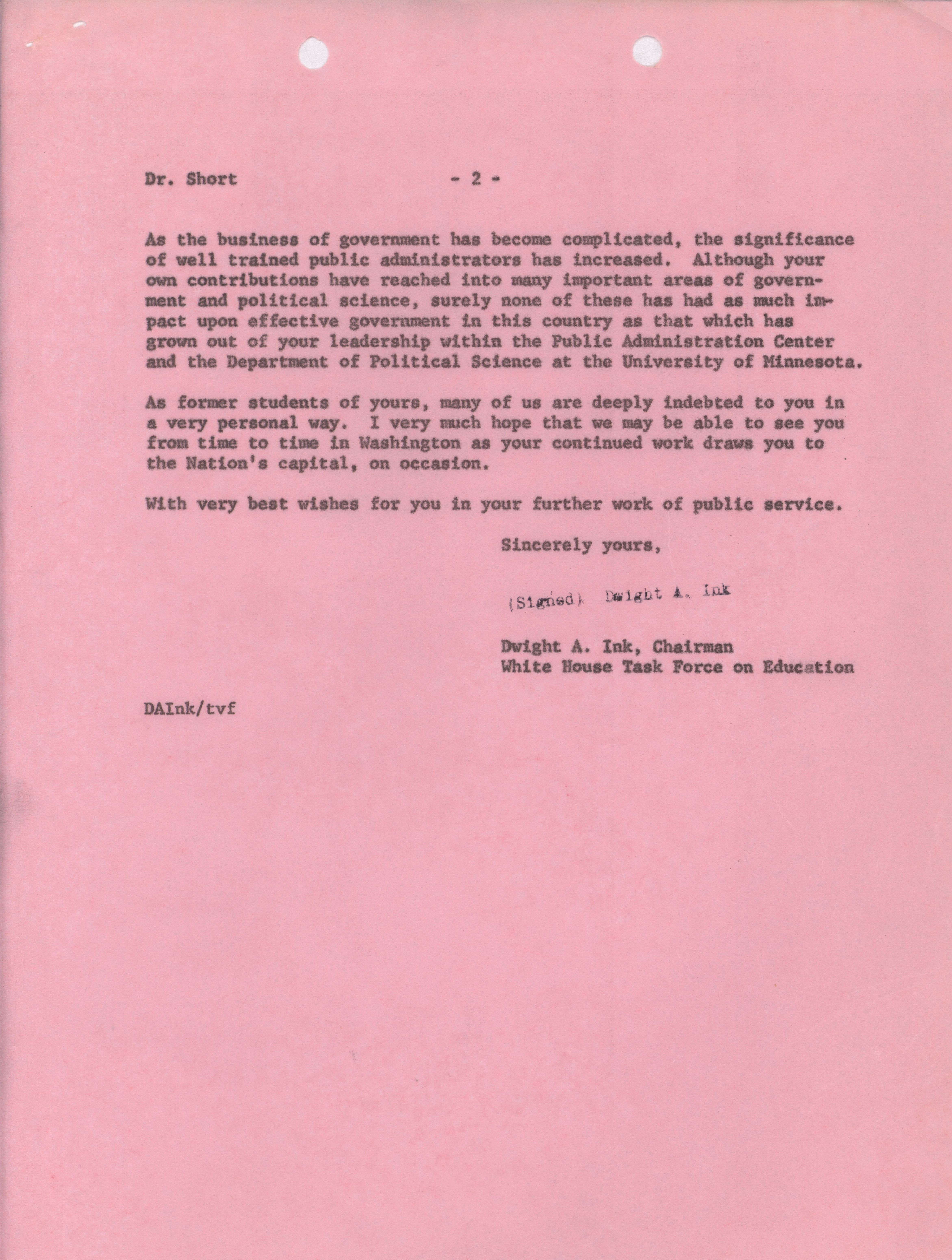 - Dwight A. Ink letter to Lloyd M. Short, May 26, 1965