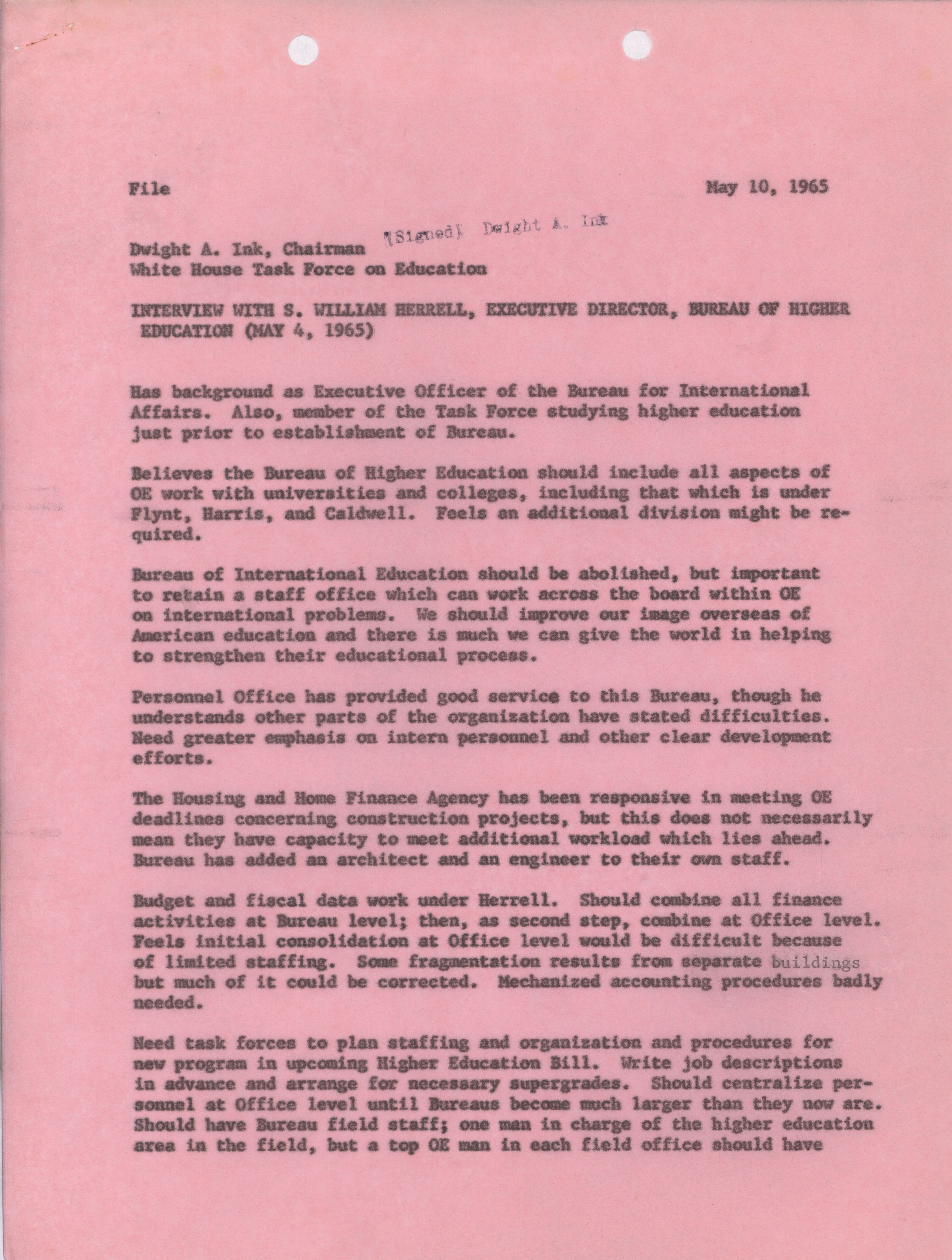 - Dwight A. Ink interview with S. William Herrell, May 10, 1965