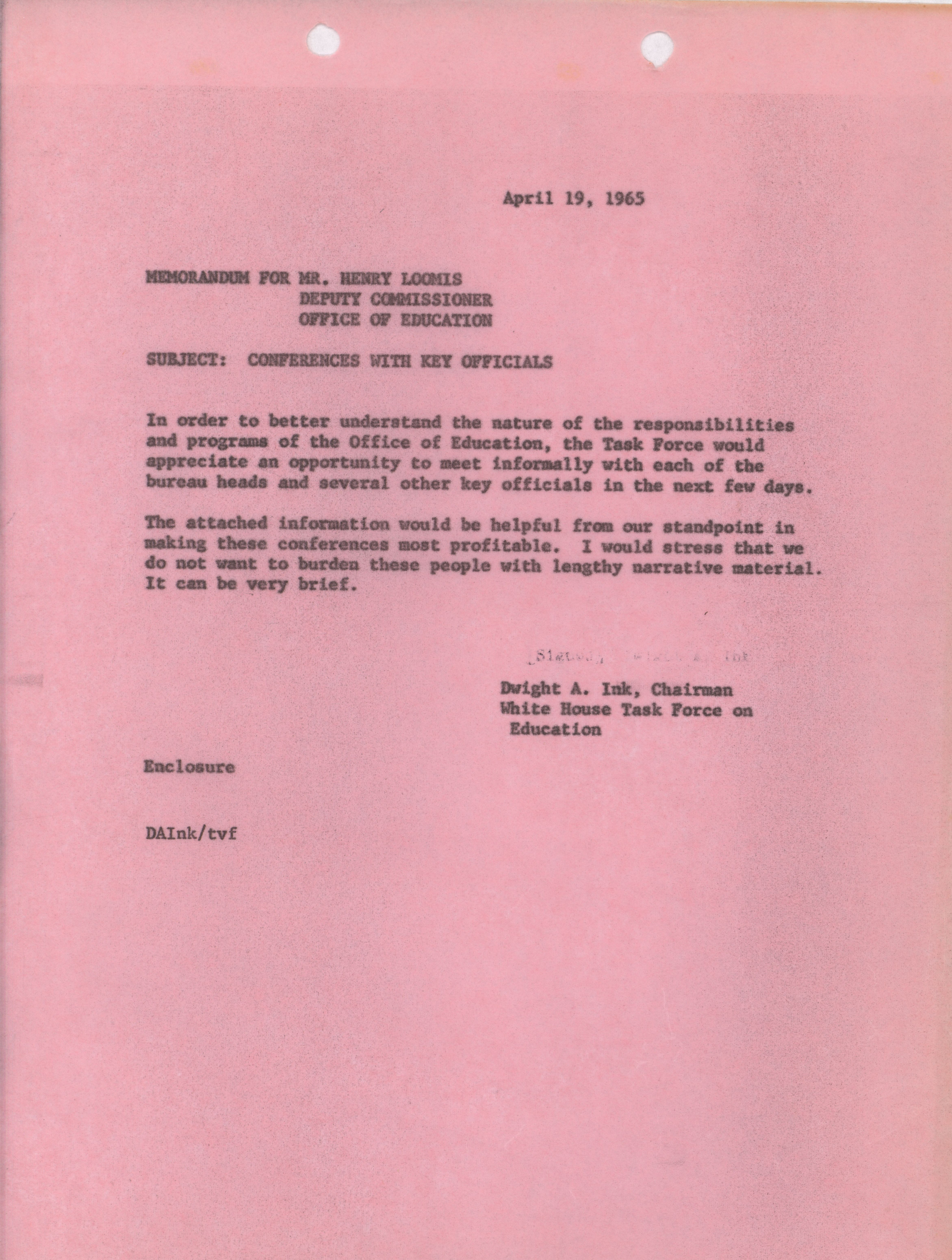 - Dwight A. Ink memorandum to Henry Loomis, April 19, 1965
