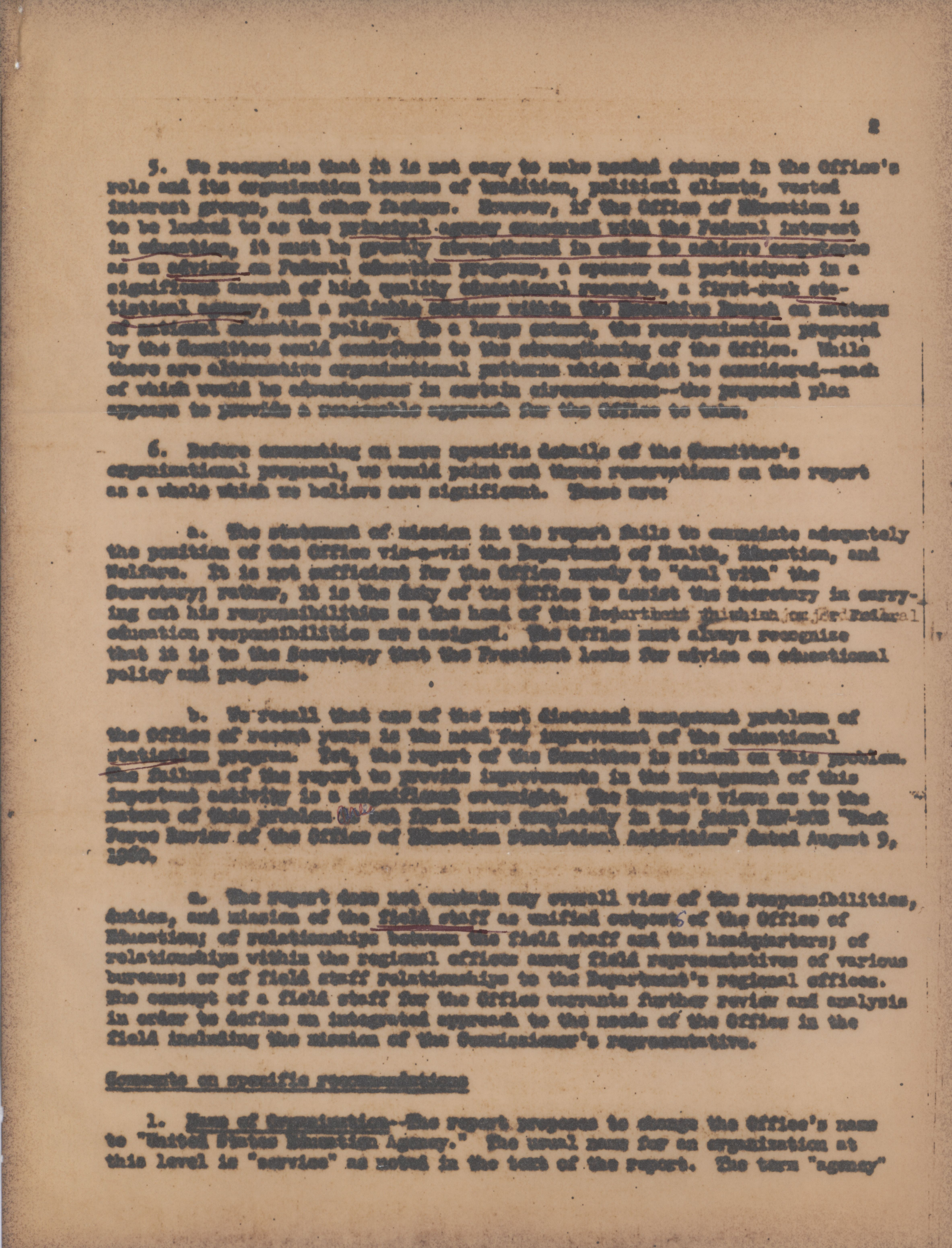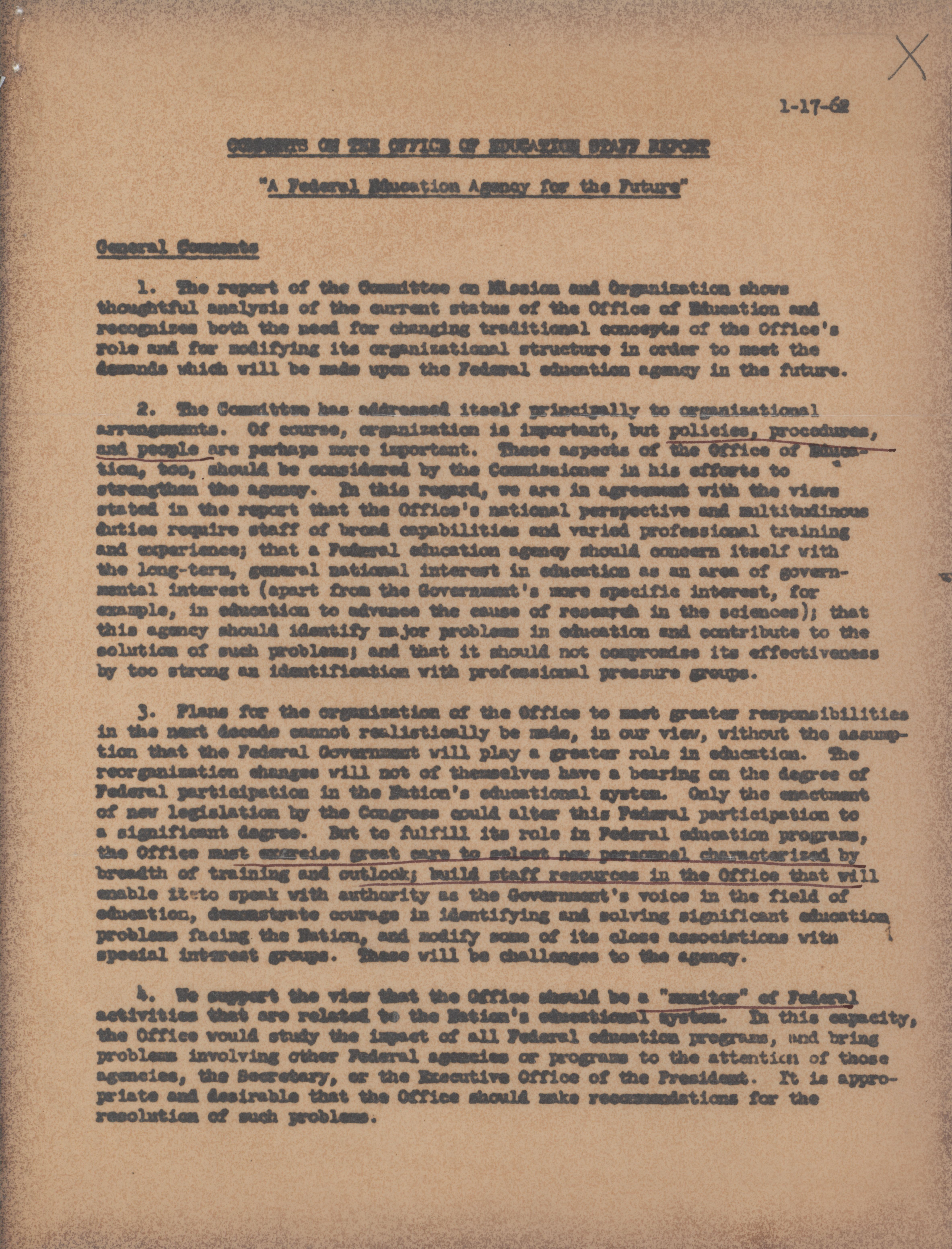 - Comments on the Office of Education staff report "A federal education agency for the future"