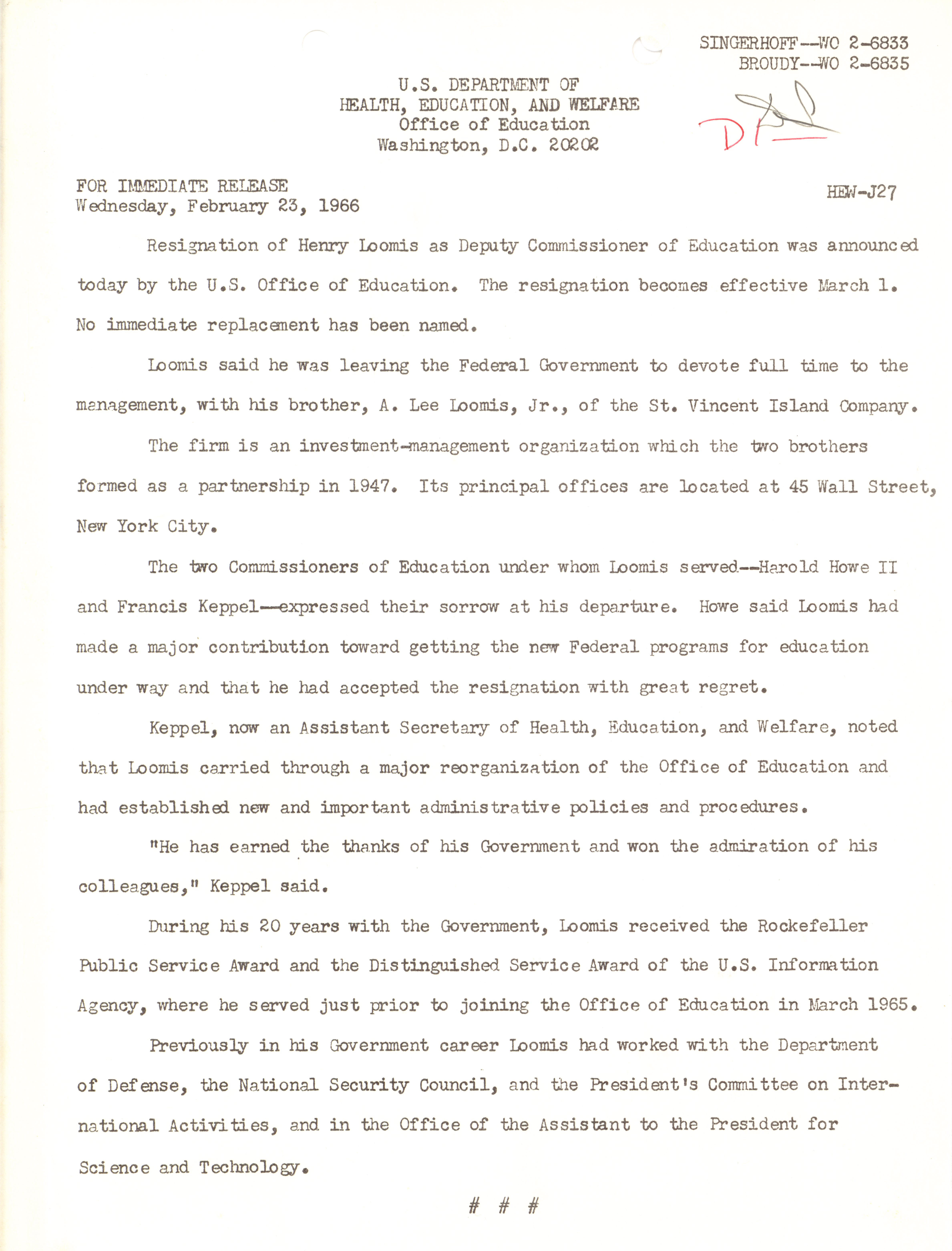 - Keppel, Francis, 1916-1990 Howe, Harold, II, 1918-2002 Loomis, Henry, 1919-2008