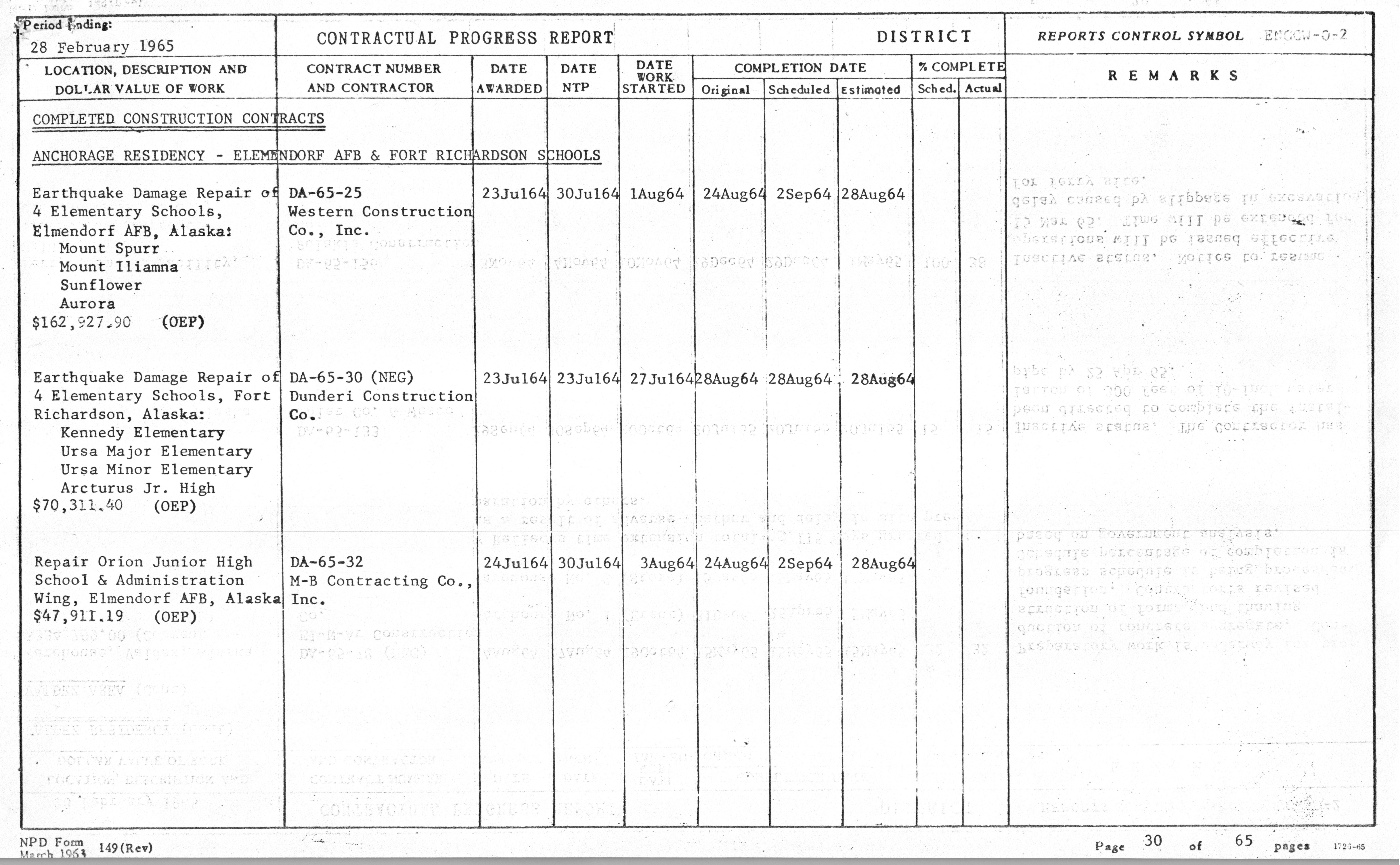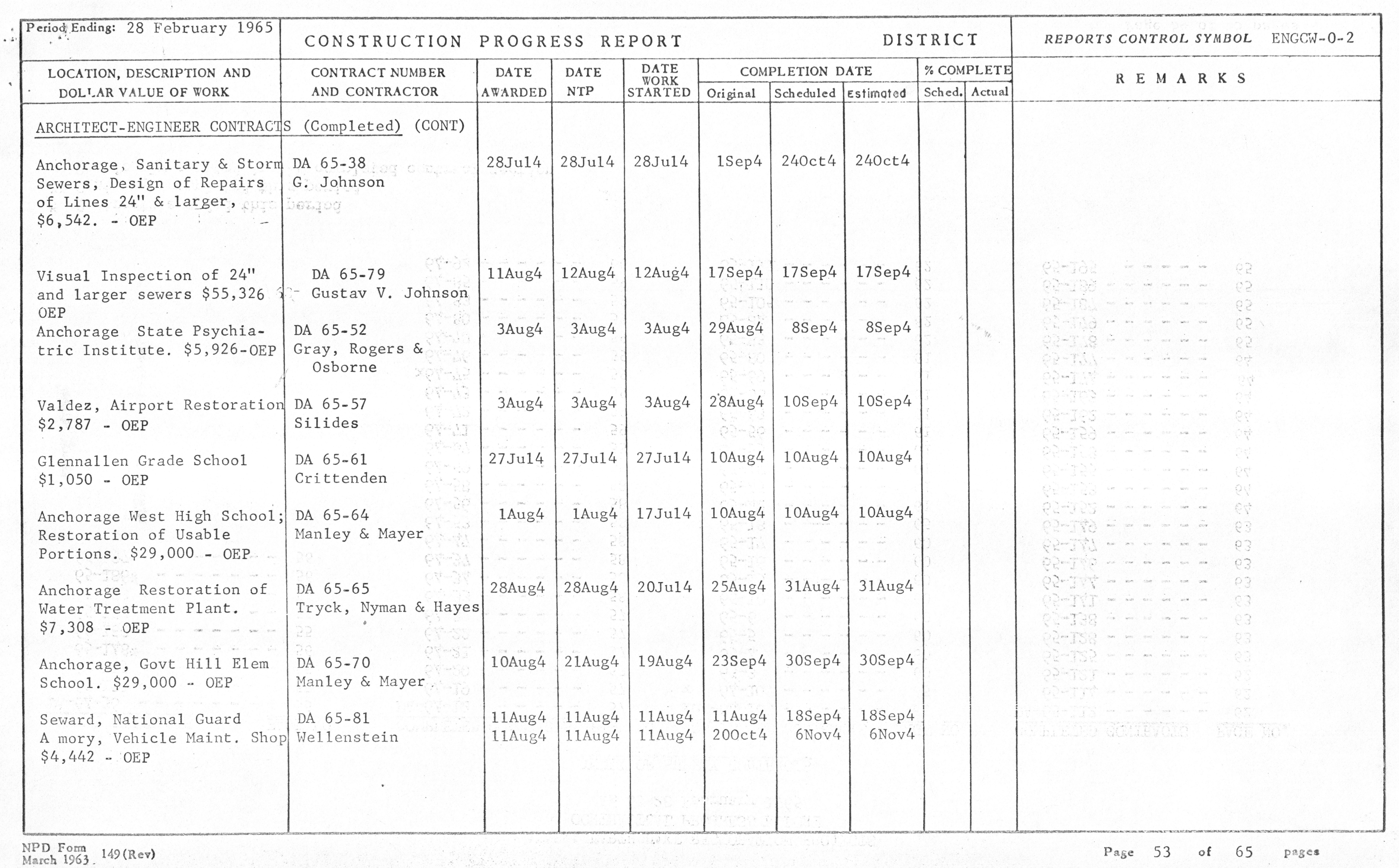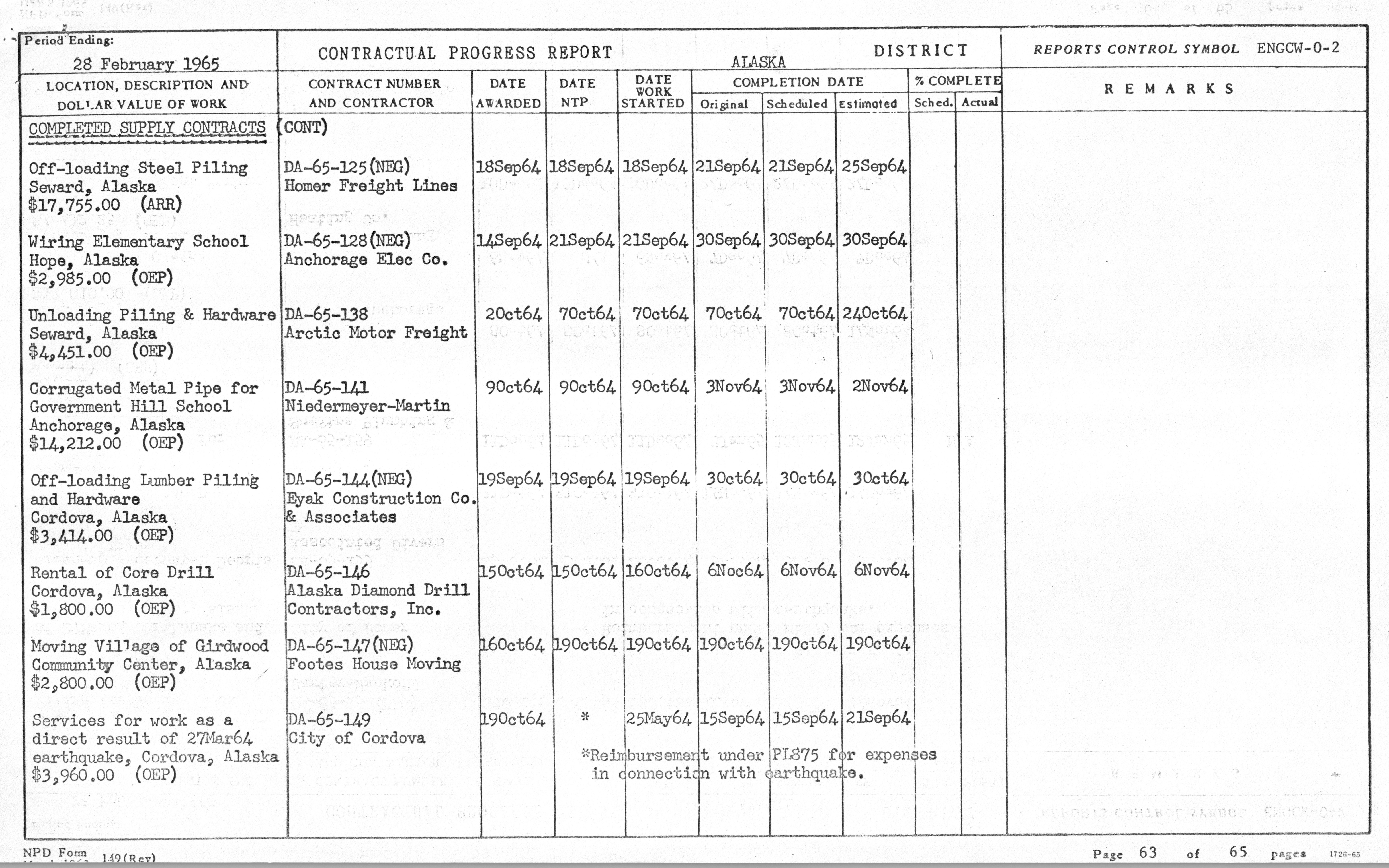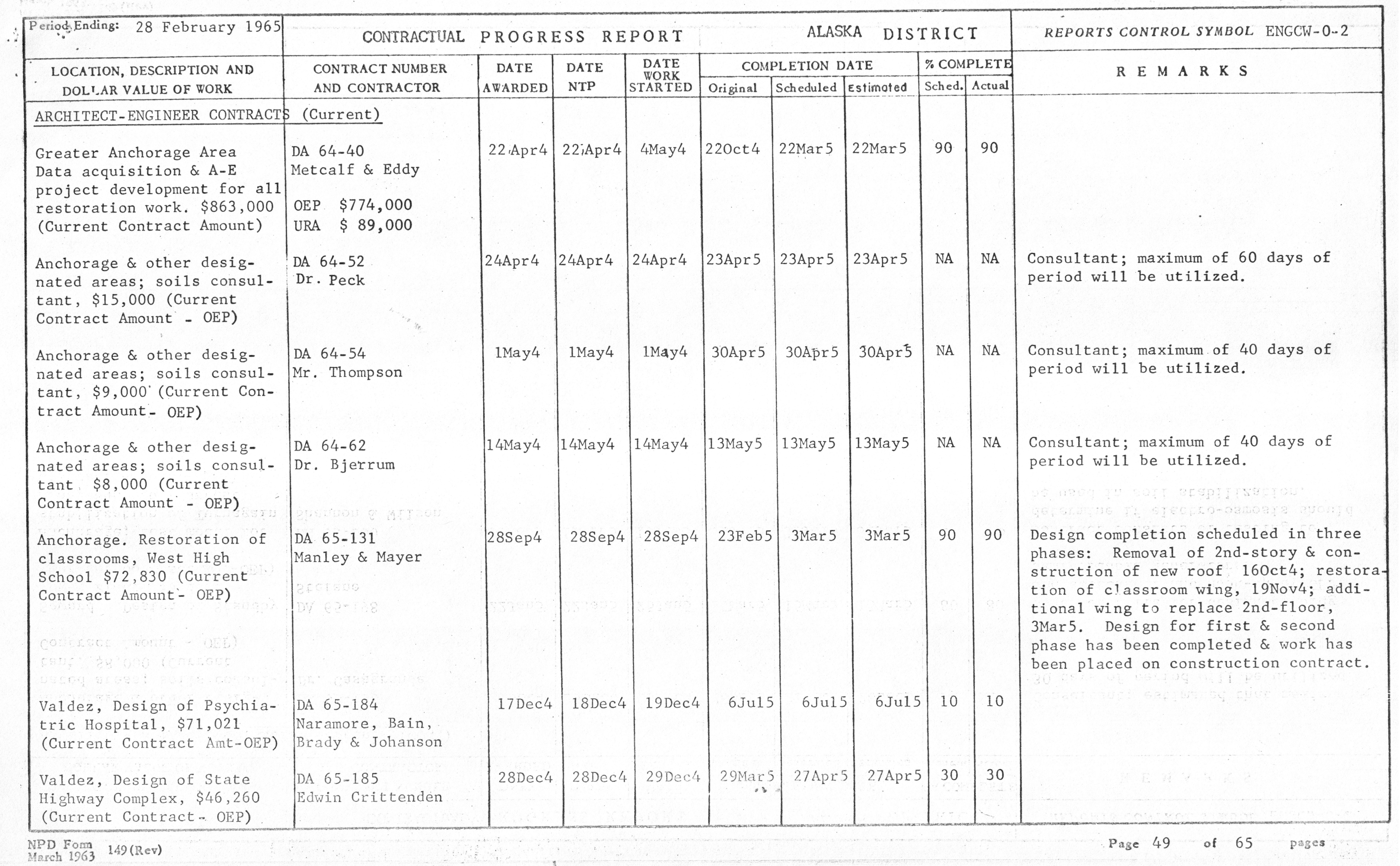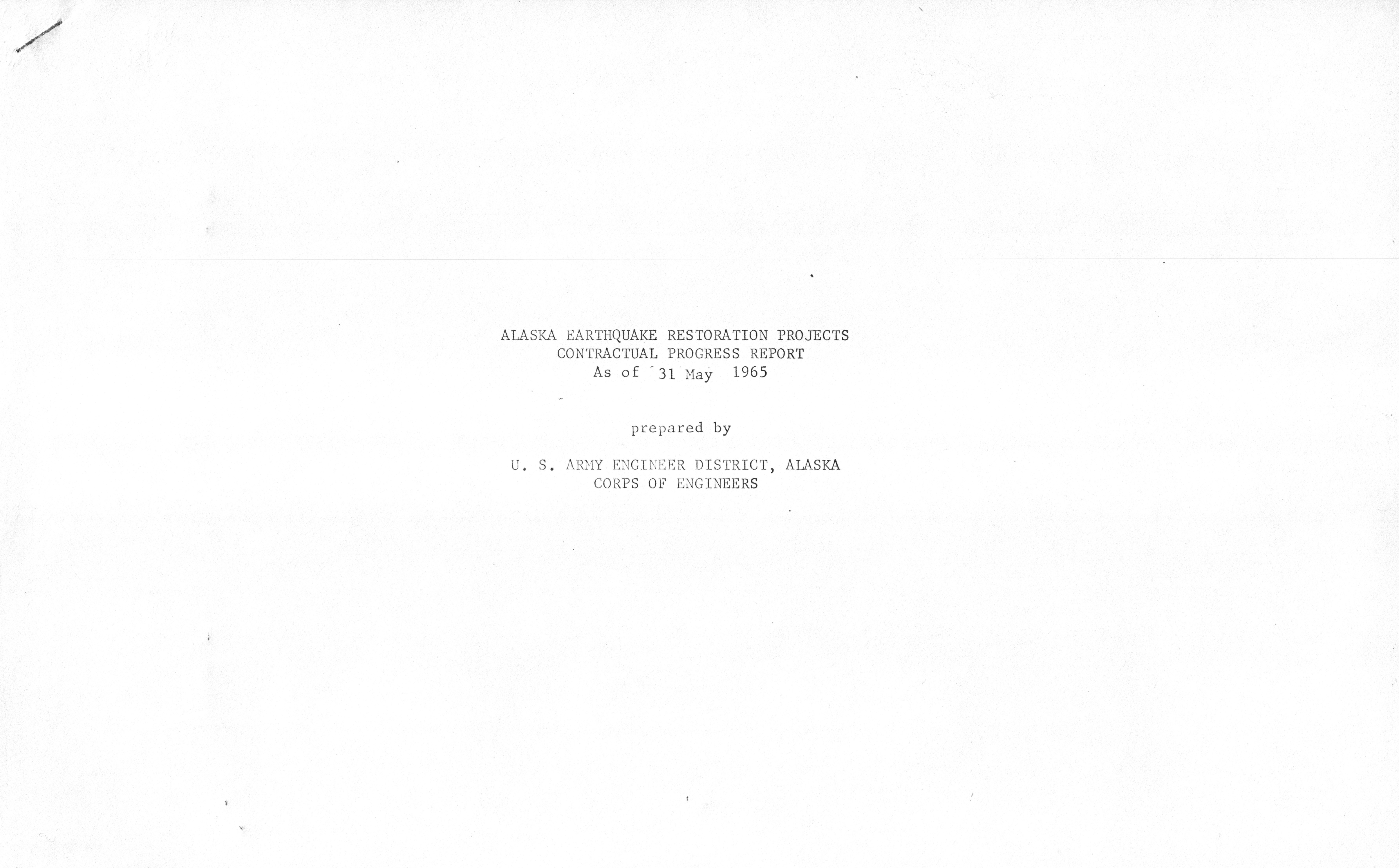 - "Alaska earthquake restoration projects contractual progress report, May 31, 1965", Dwight Ink Collection, Iowa State University Library Digital Collections