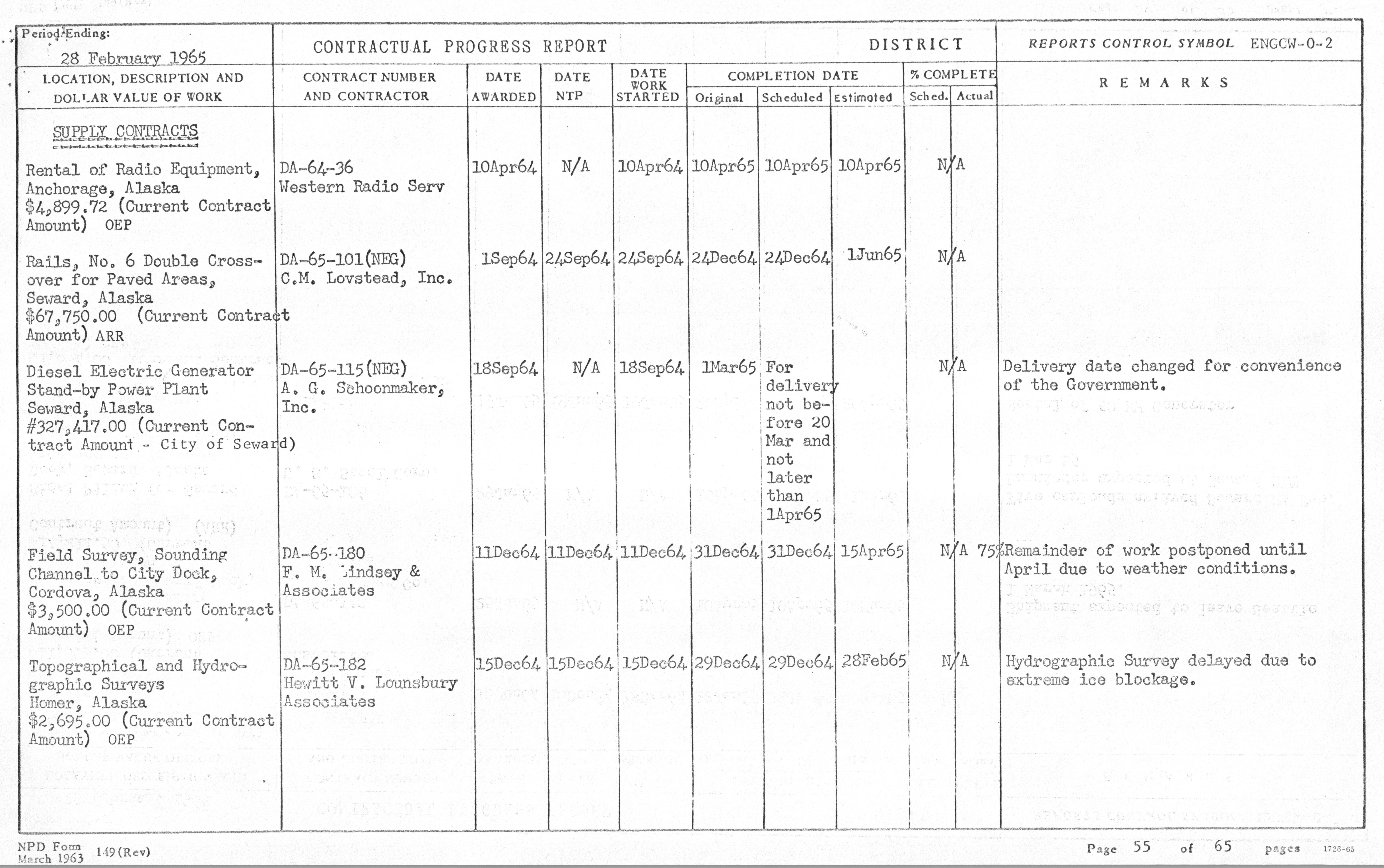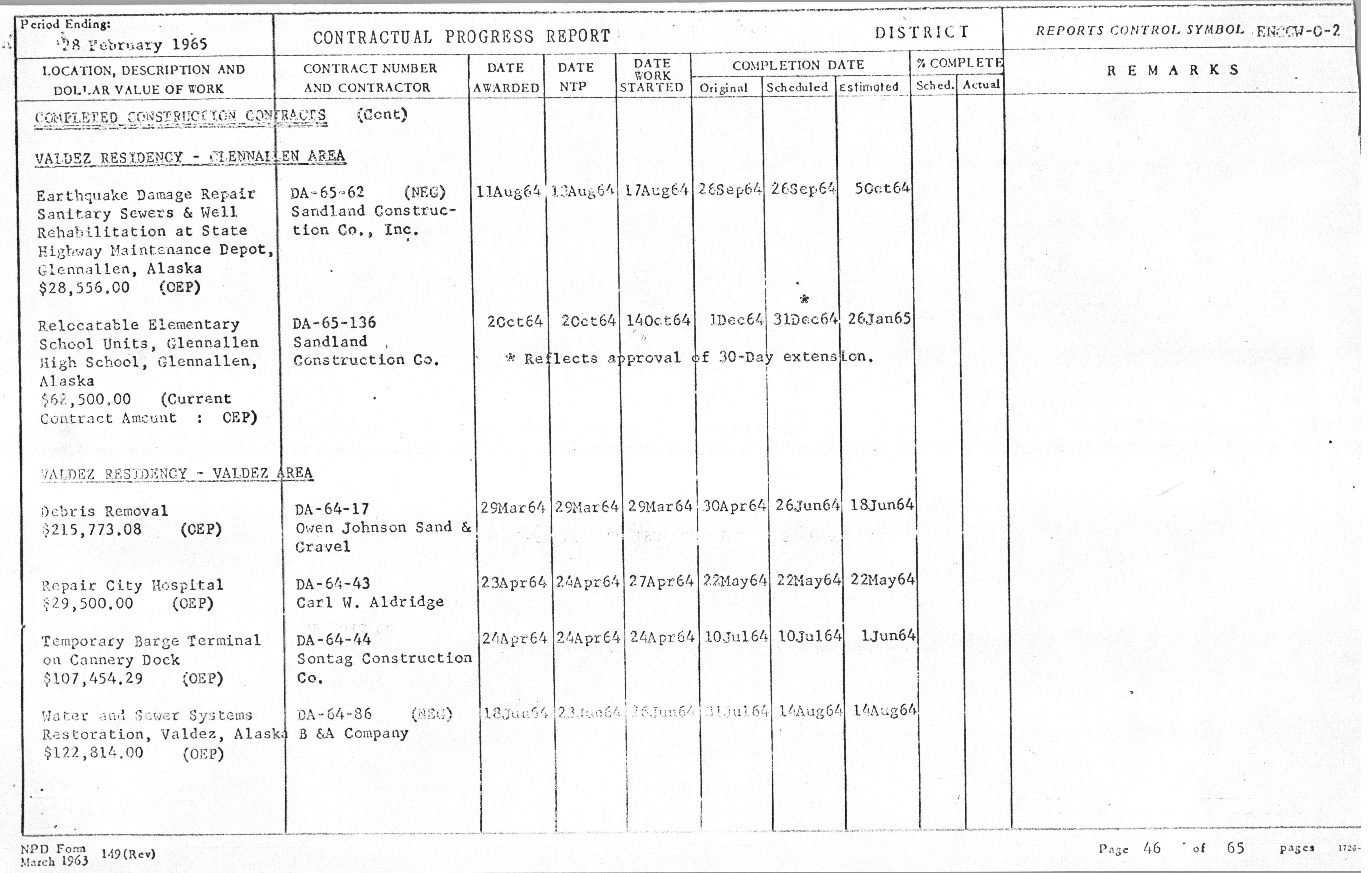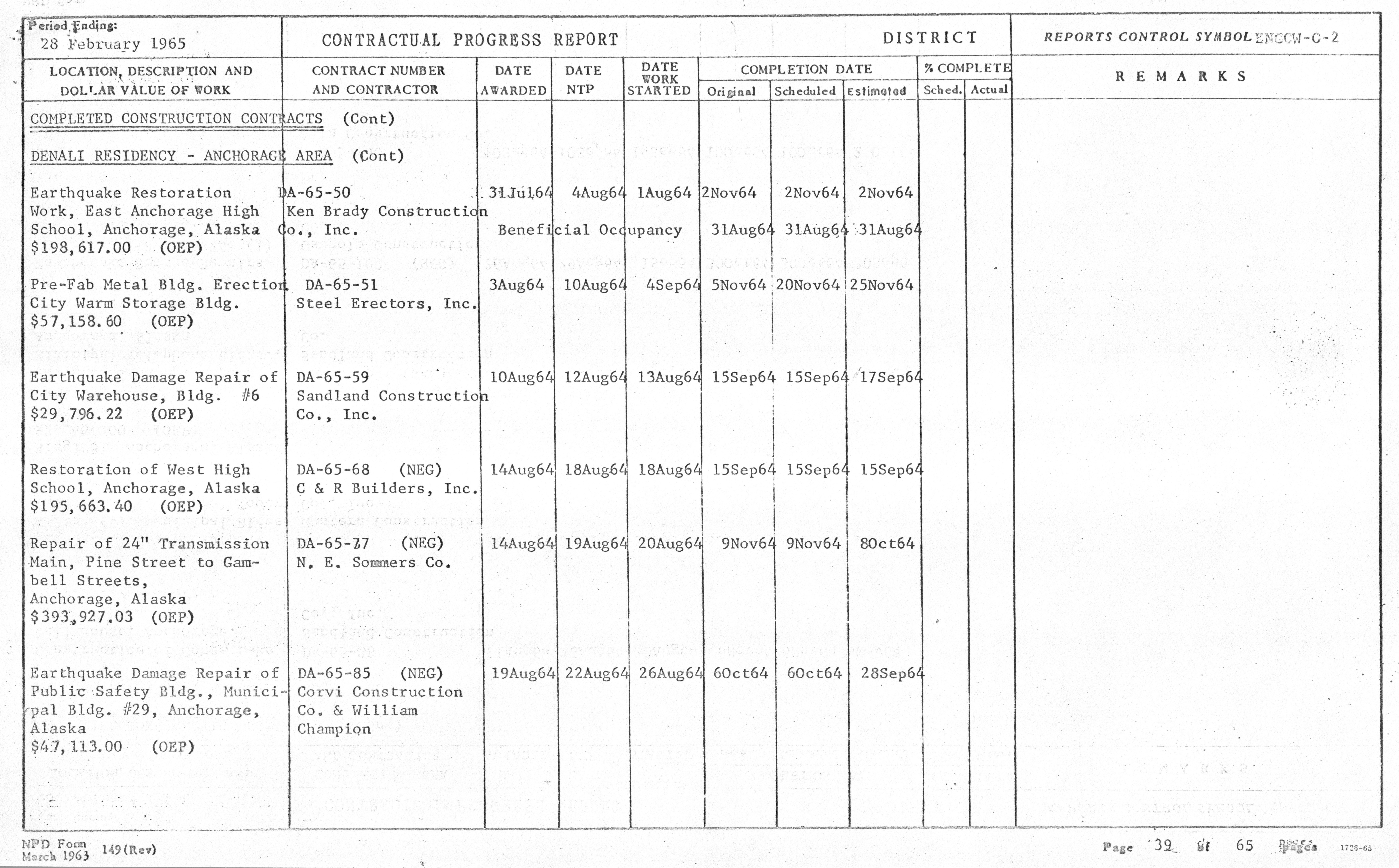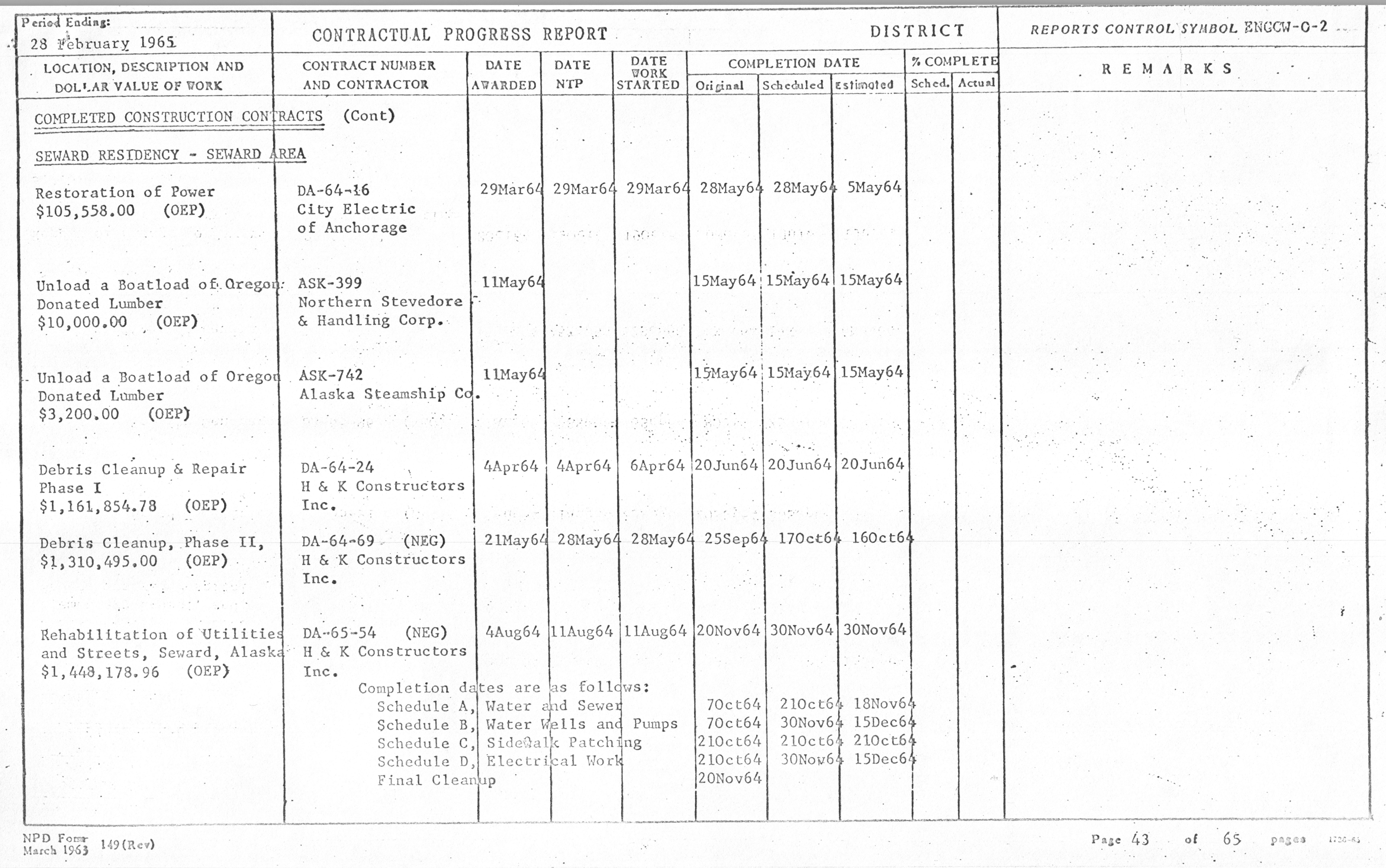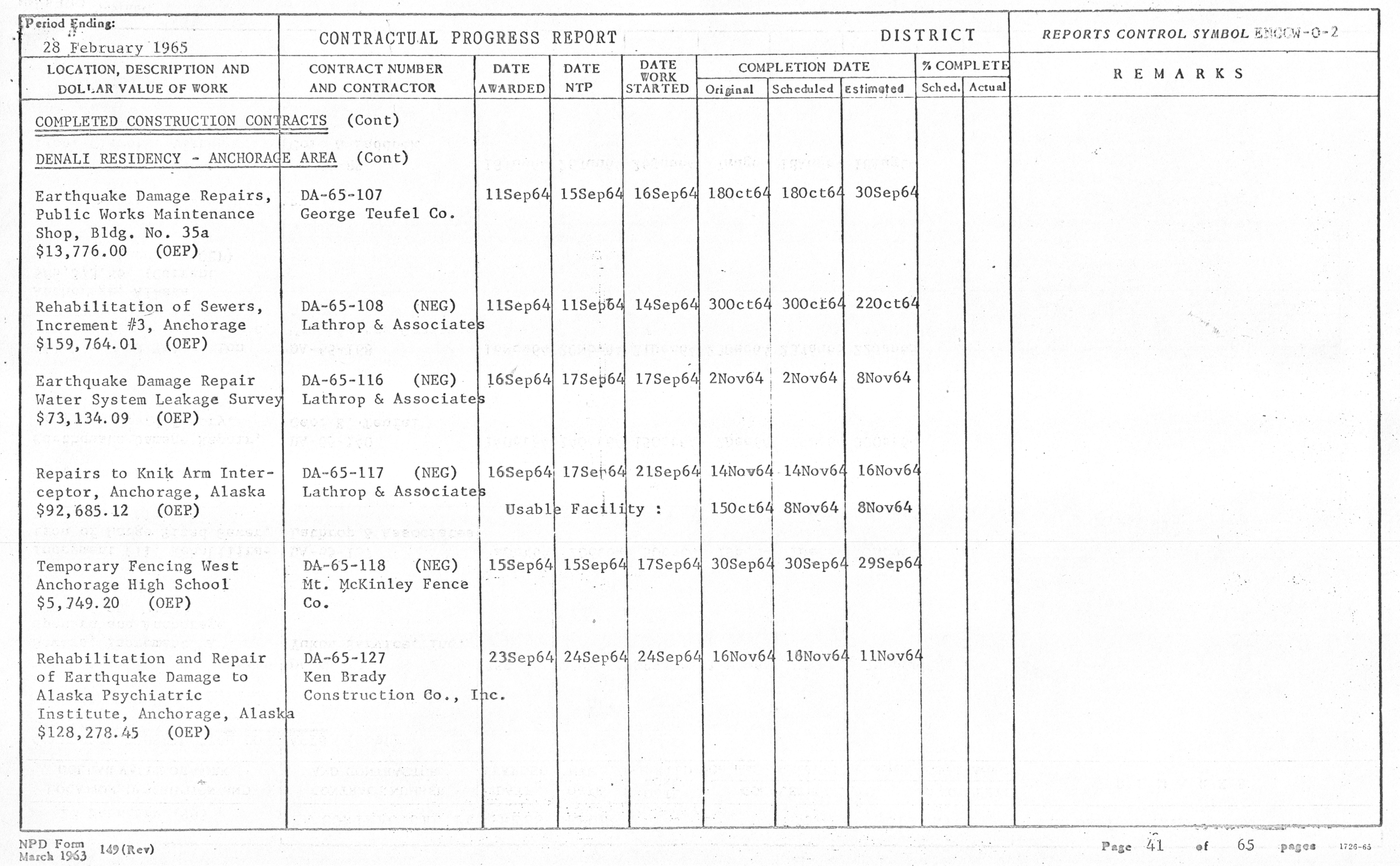- "Alaska earthquake restoration projects contractual progress report, May 31, 1965", Dwight Ink Collection, Iowa State University Library Digital Collections