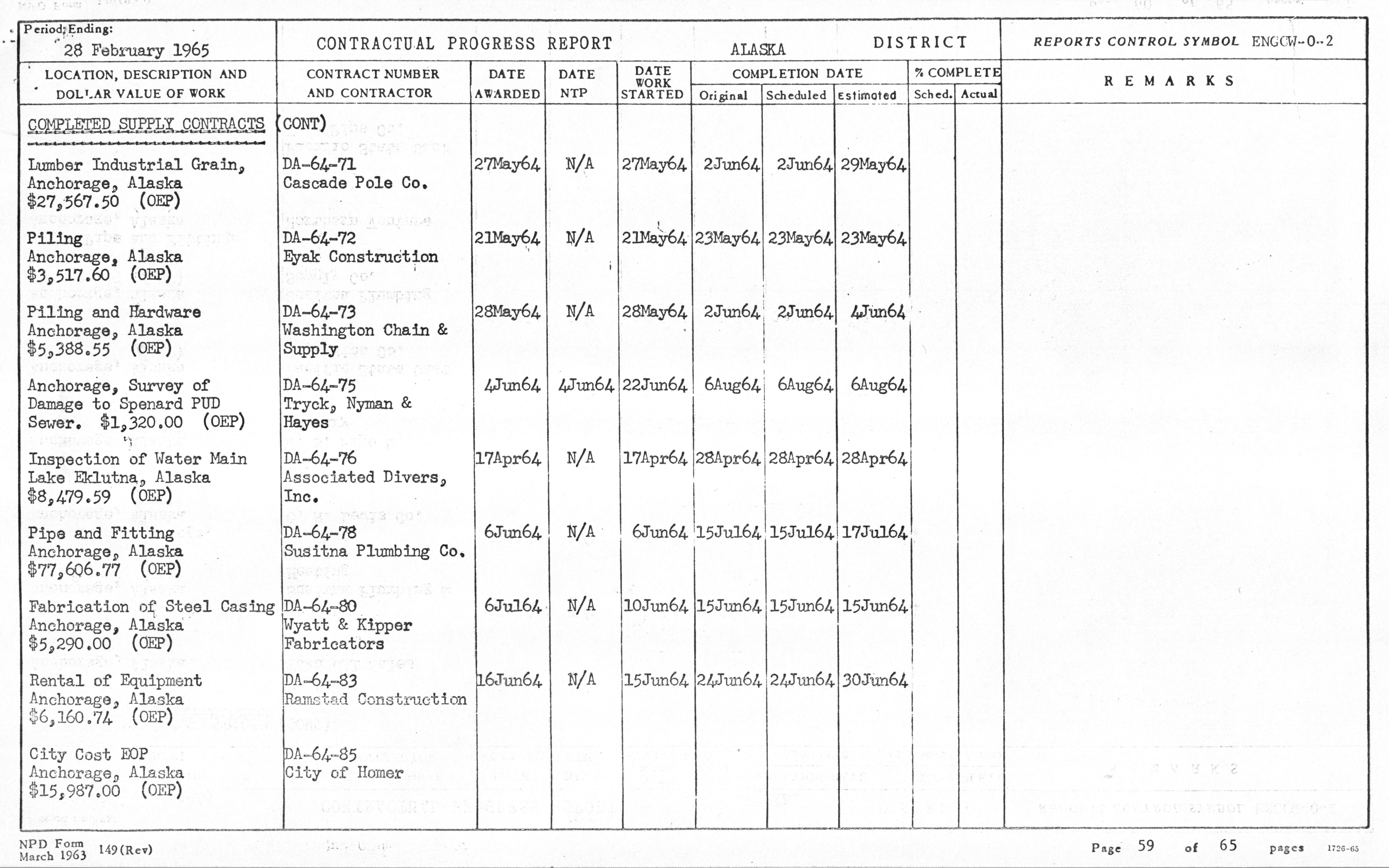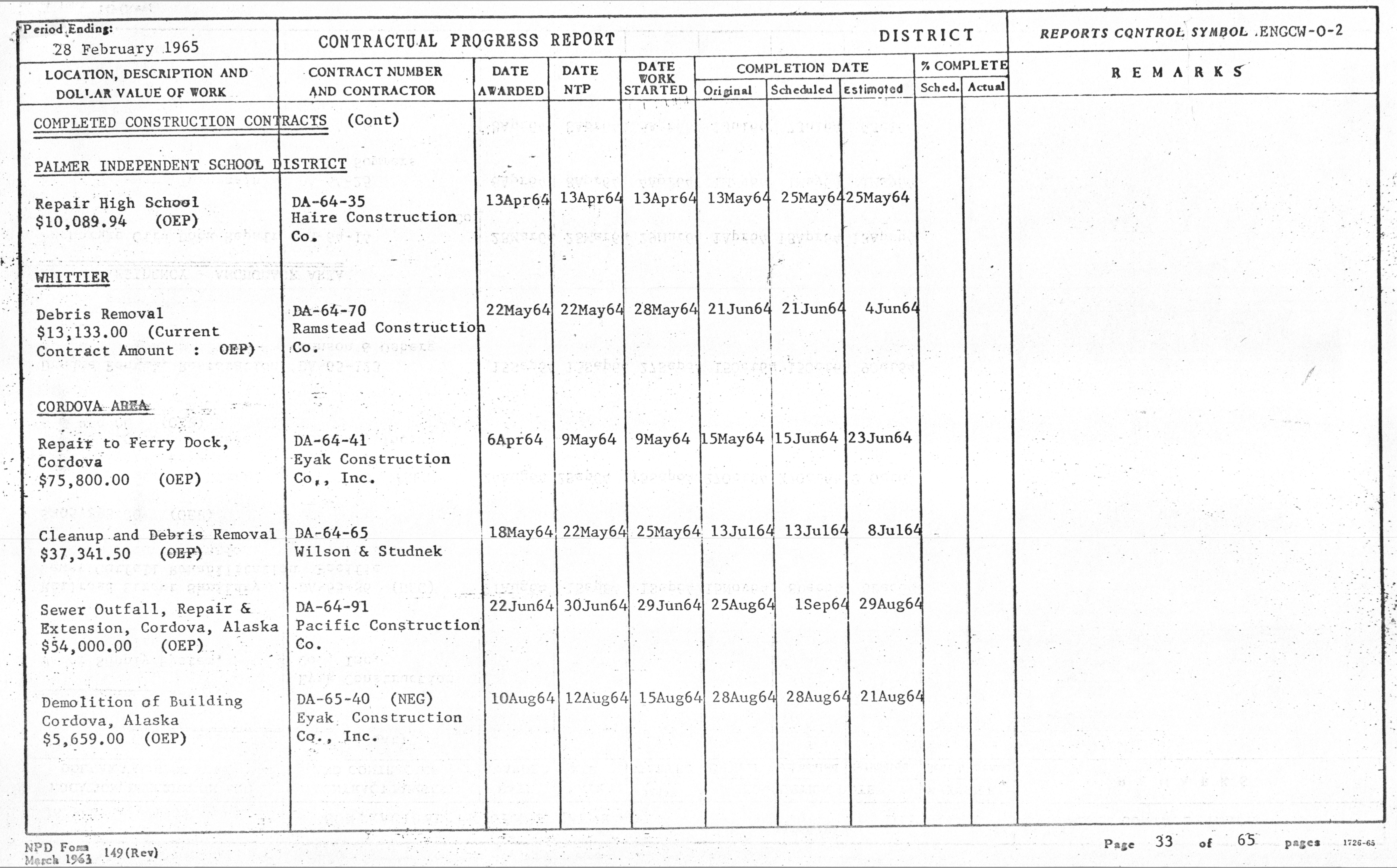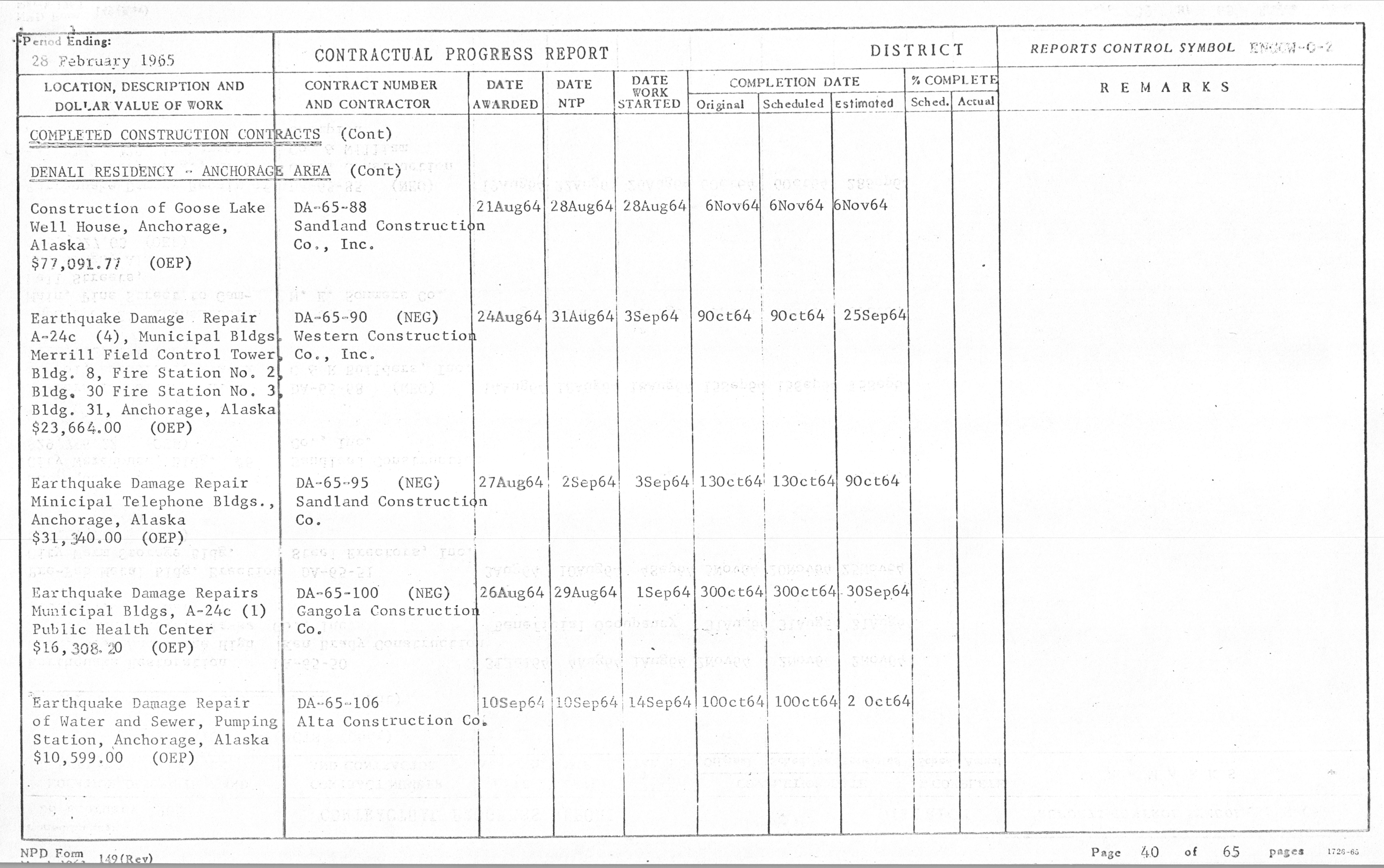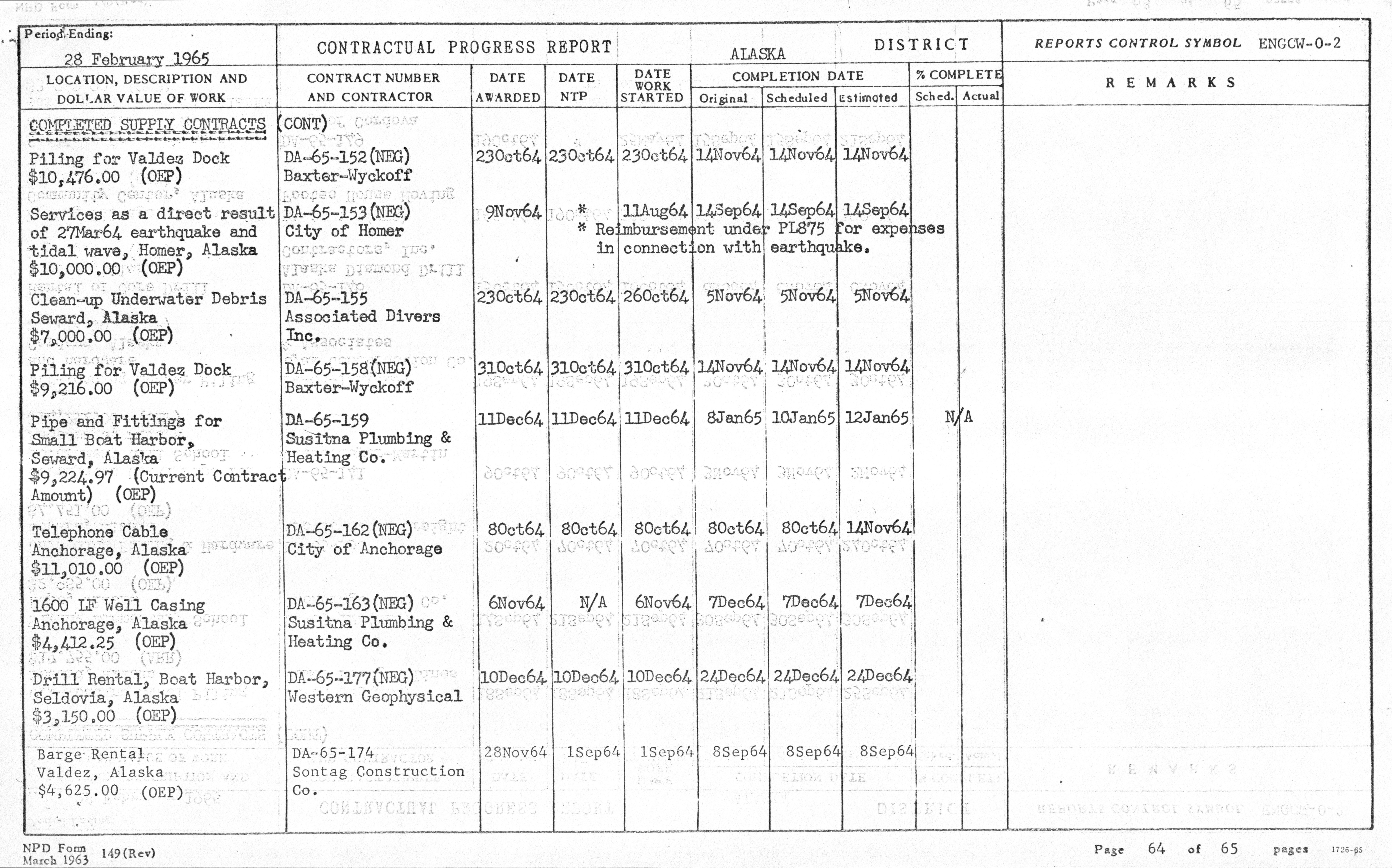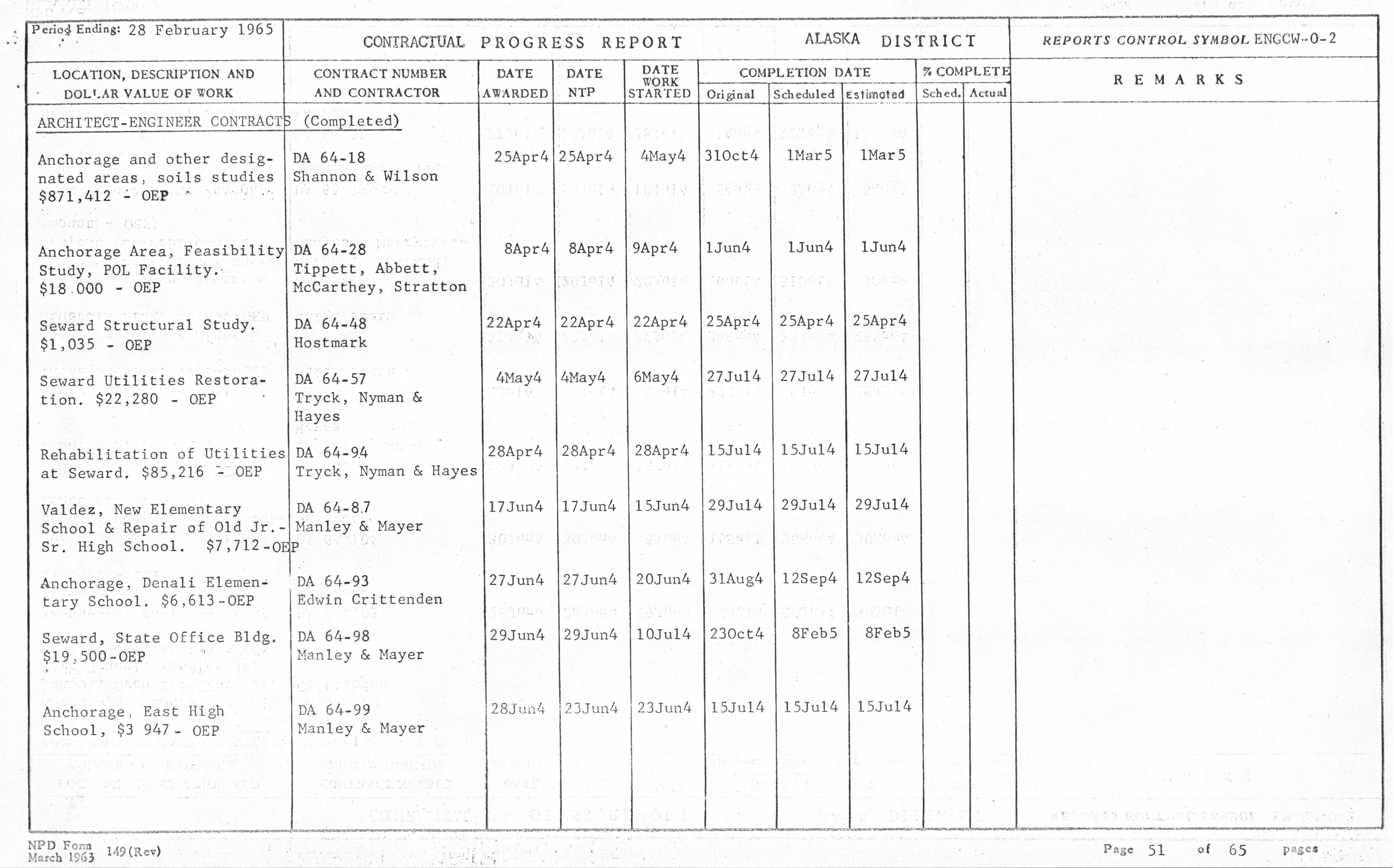 - "Alaska earthquake restoration projects contractual progress report, May 31, 1965", Dwight Ink Collection, Iowa State University Library Digital Collections