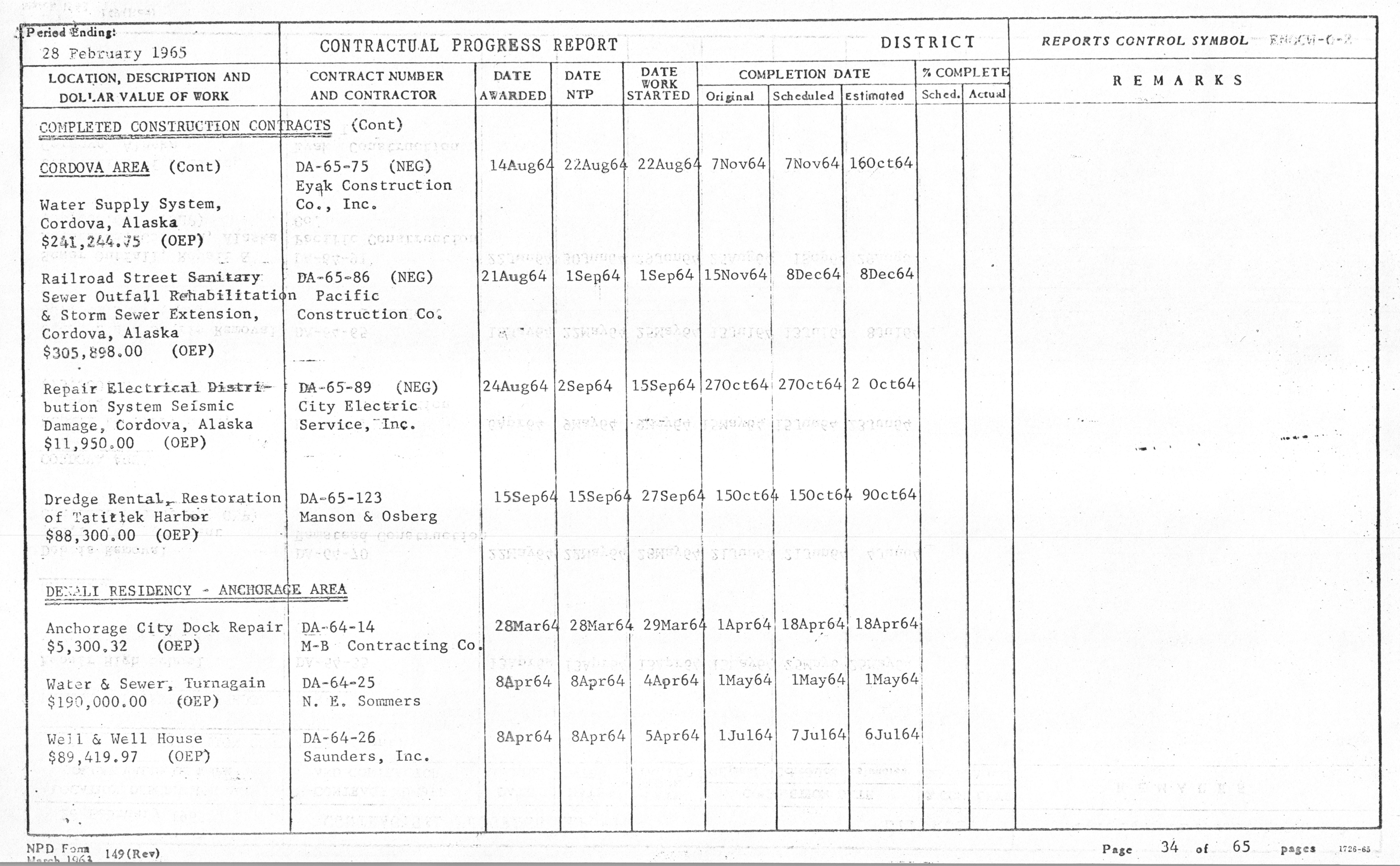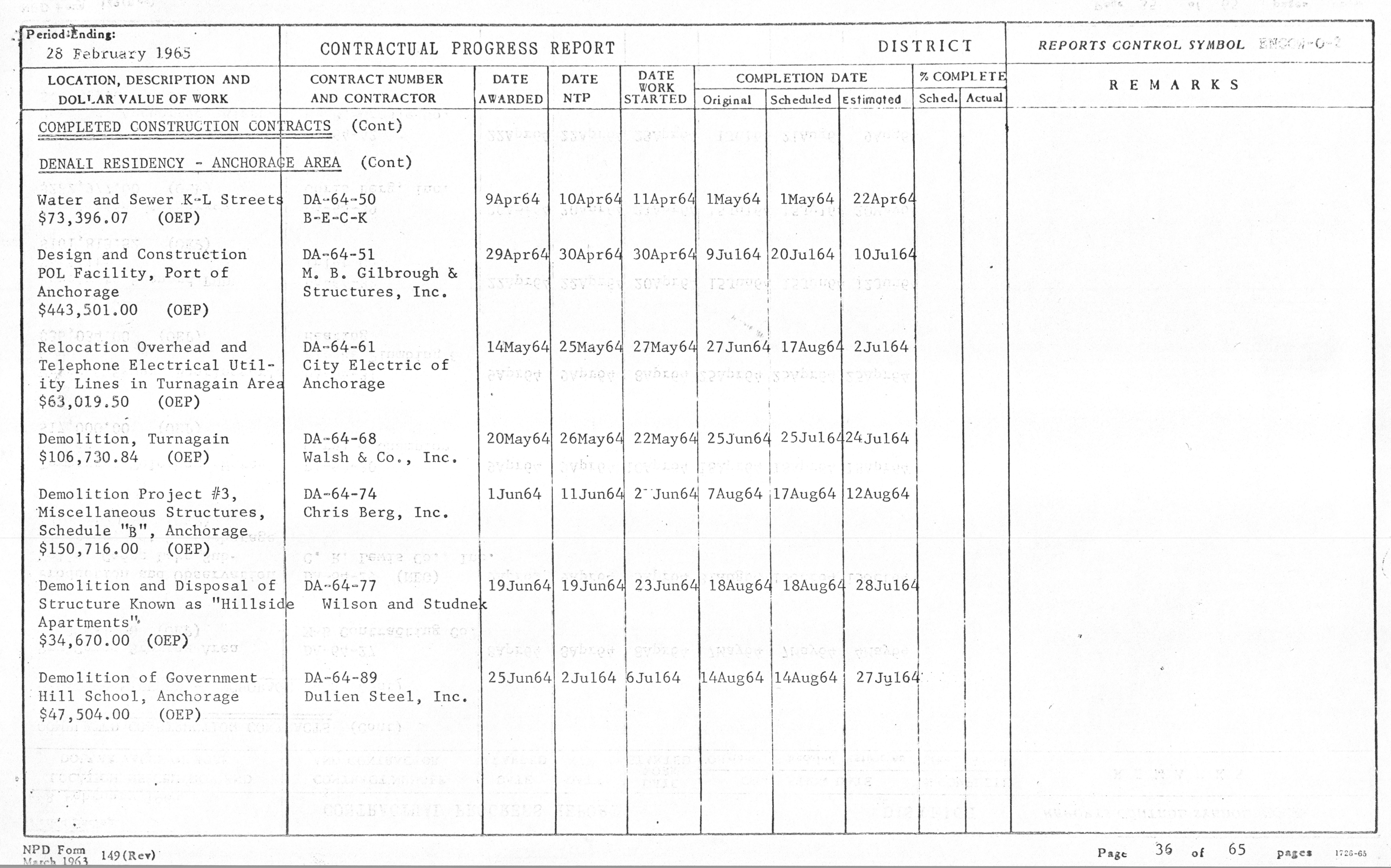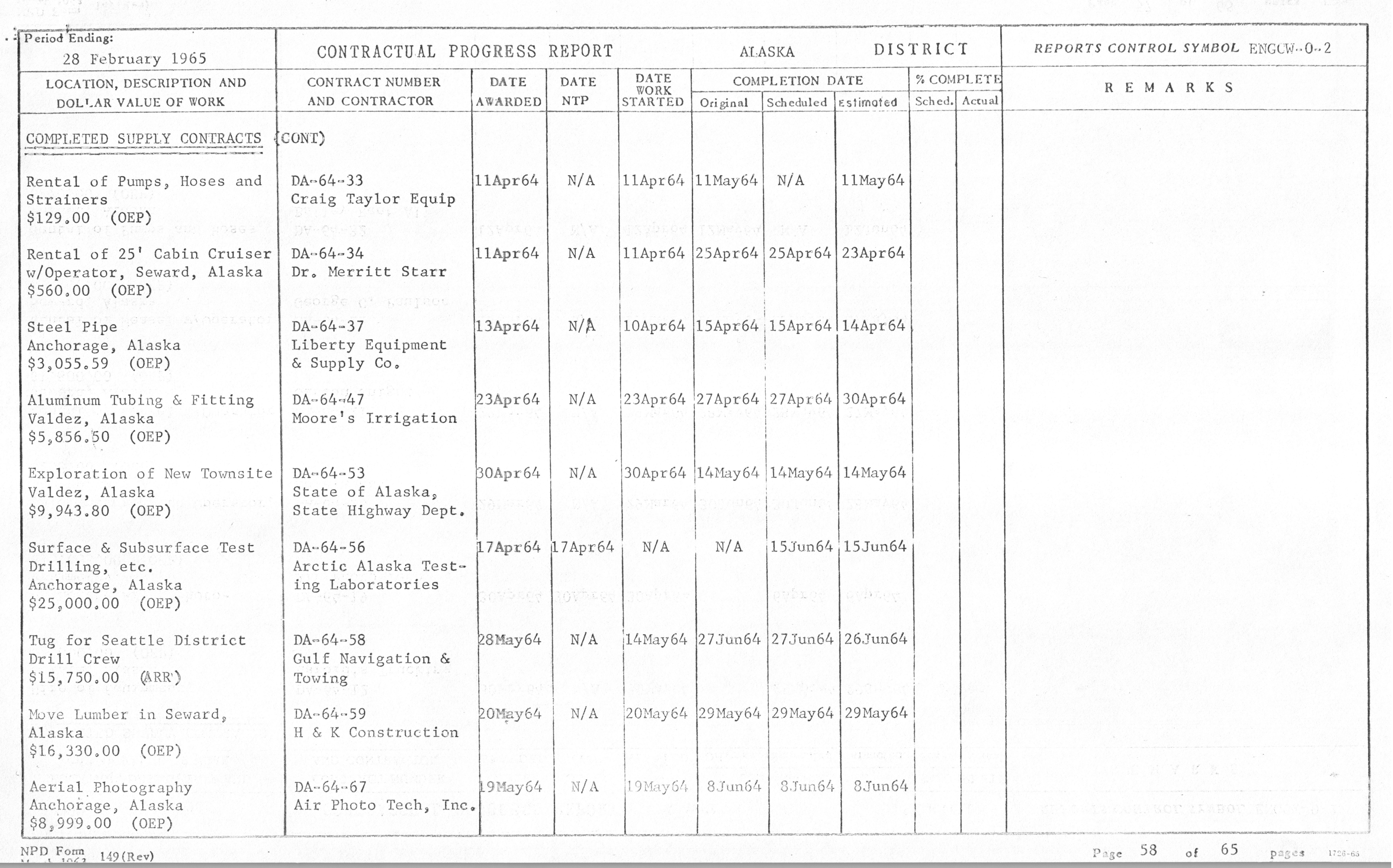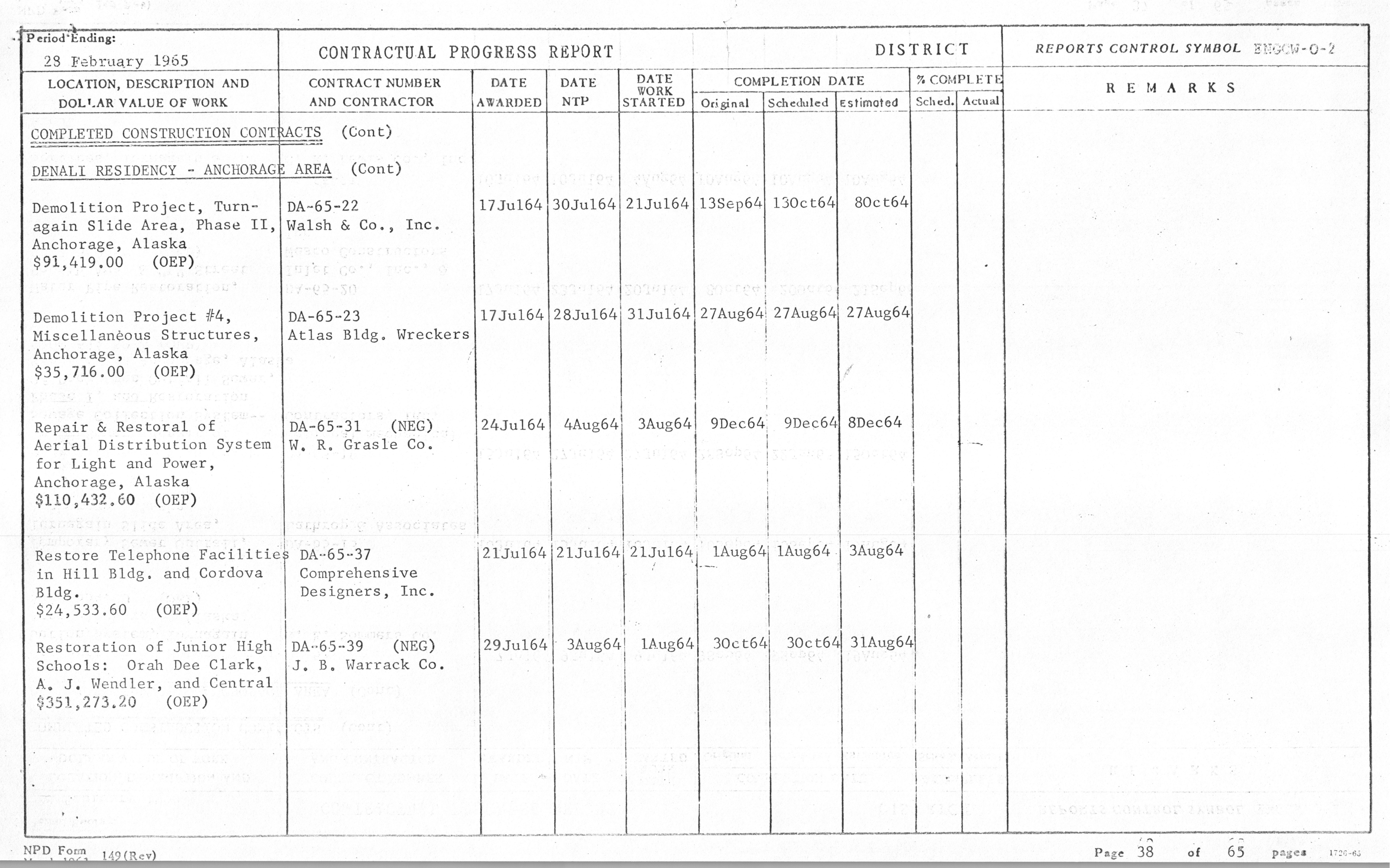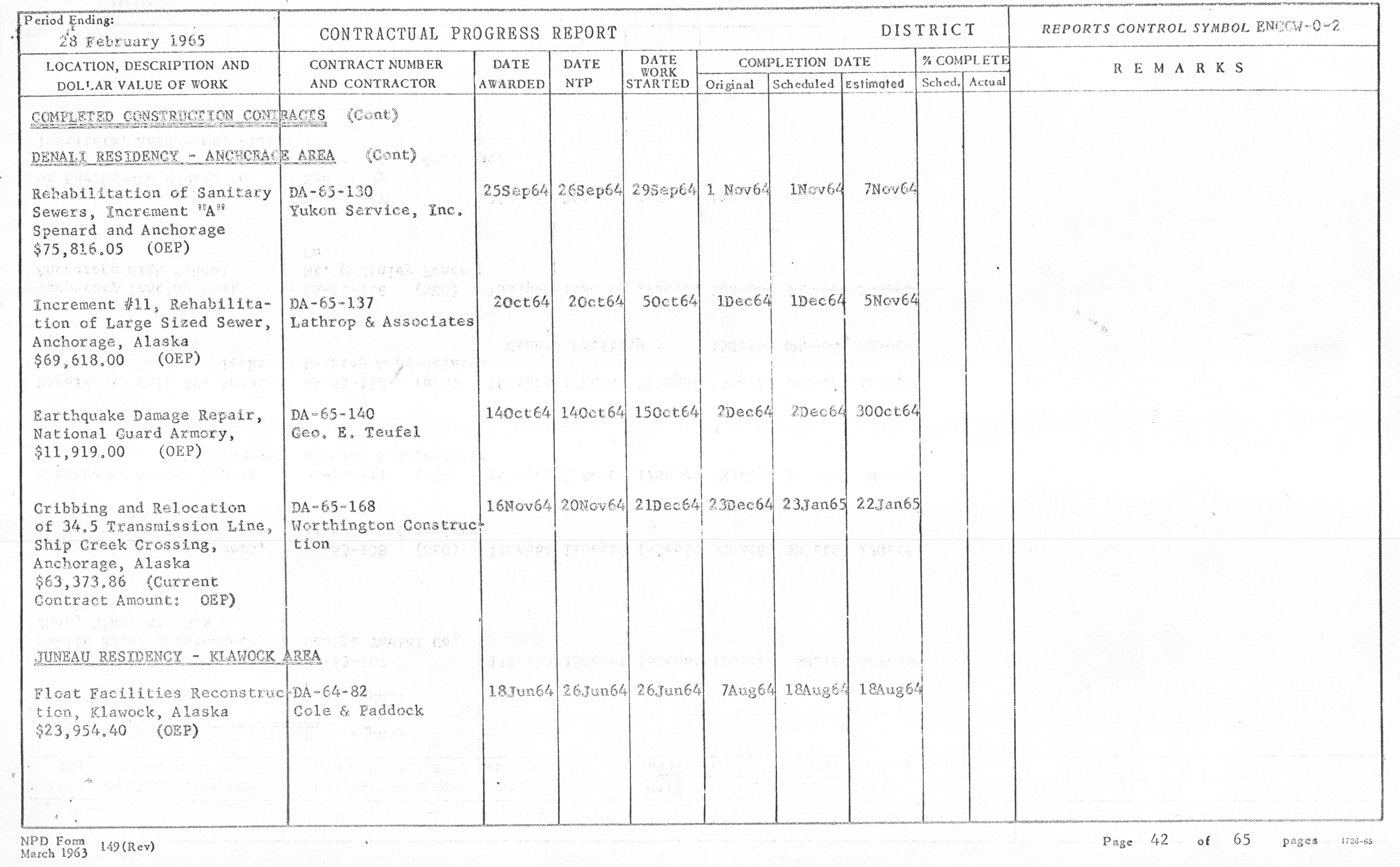 - "Alaska earthquake restoration projects contractual progress report, May 31, 1965", Dwight Ink Collection, Iowa State University Library Digital Collections